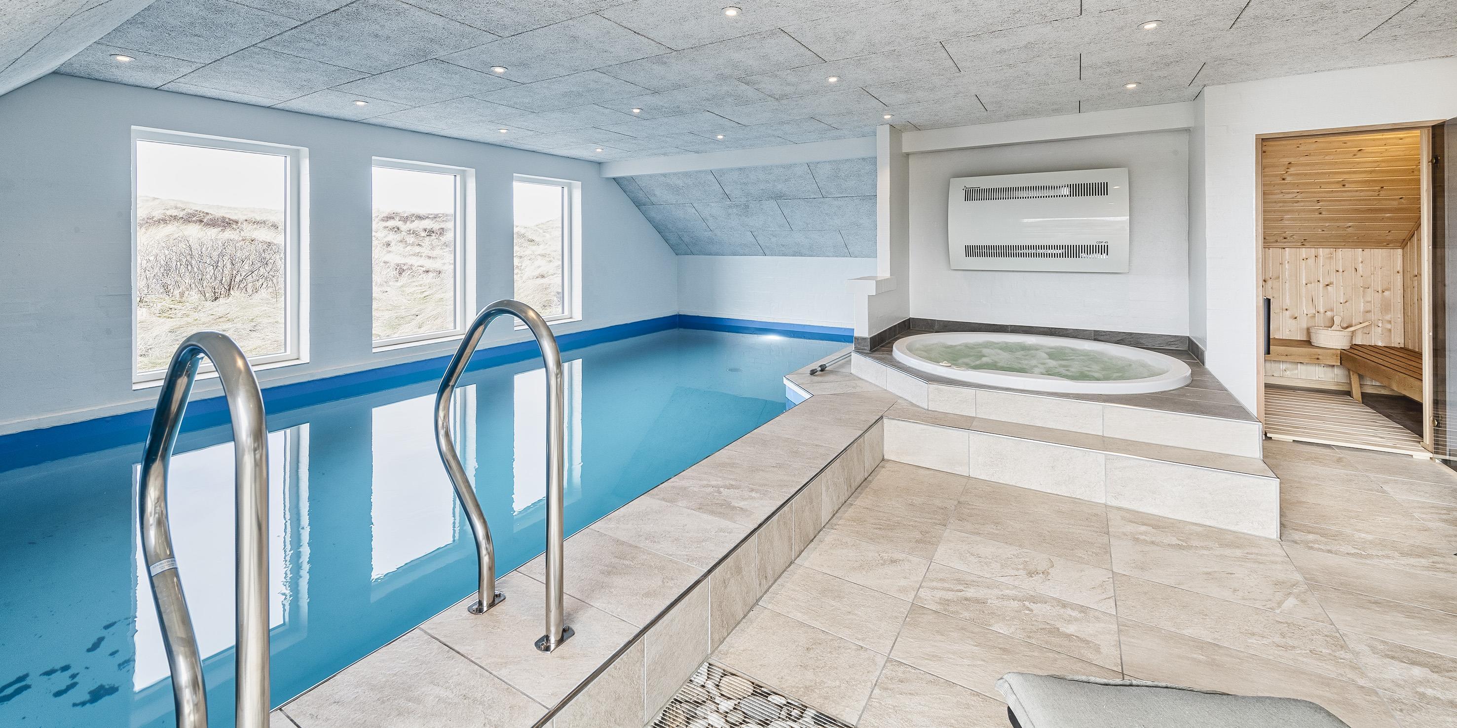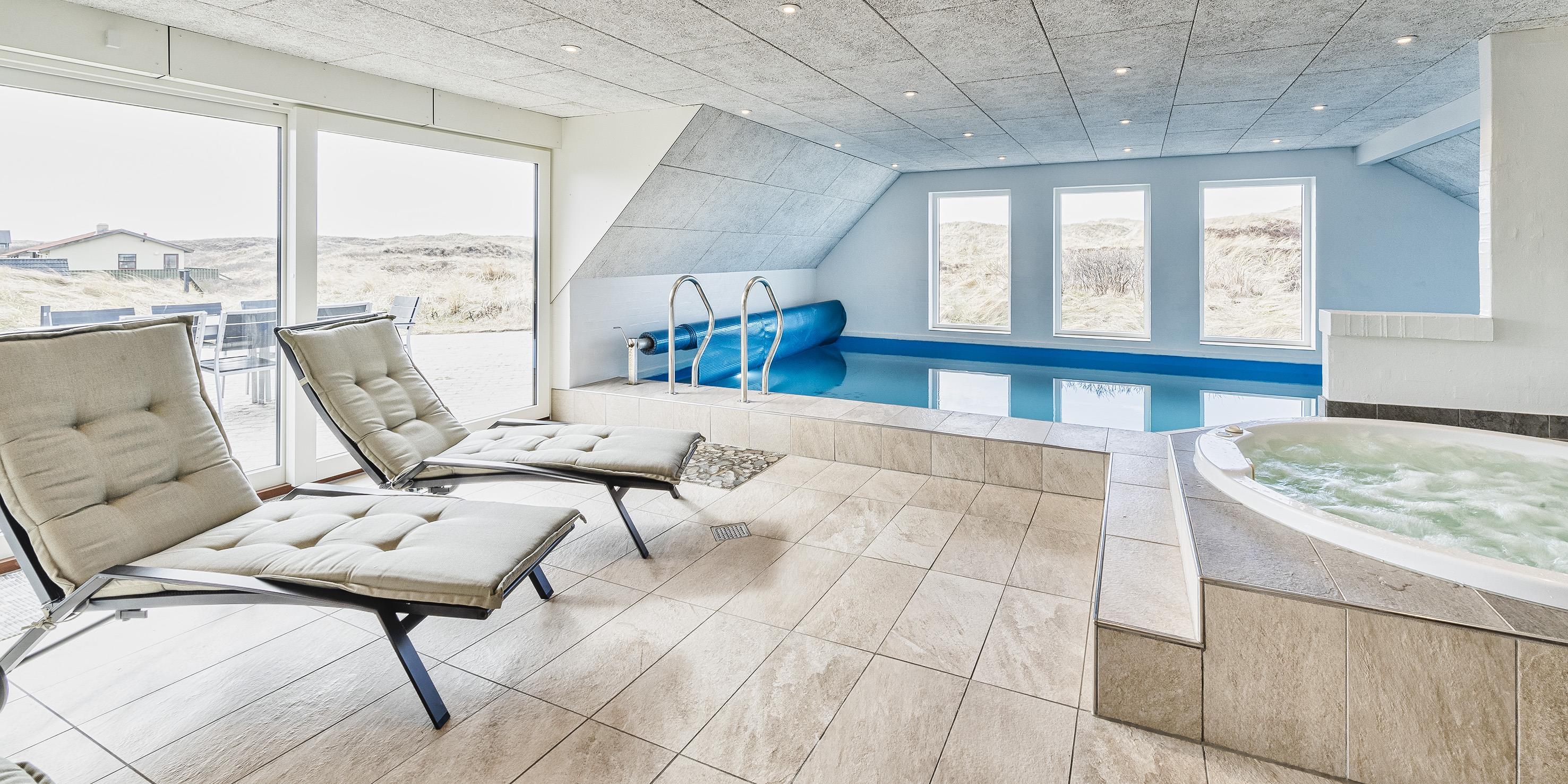 The house contains: Entrance/hallway. From the entrance you come across the house's open living room. The living room is divided into an open kitchen-dining room, dining area and a lovely sofa area. The living room has a large window from which the view over the dune landscape can be enjoyed to the fullest. The living room is furnished with a nice sofa area with living room TV (summer house package), wireless internet and fireplace. New bright kitchen in open connection with the dining room. The kitchen features a fridge/freezer, built-in oven, cooking island with ceramic hob, extractor hood. In connection with the kitchen, there is an open dining area with a view to the pool area. From the living room there is access to the large pool room, the pool is approx. 7.3 x 3.3 x 1.30 meter (length x width x depth), there is a hot water spa for 5 people, a sauna and a nice relaxation area by the window section to the south. Large bathroom with shower/wc, laundry arrangement. All the glory can be enjoyed from the living room through the large window. The house has 5 bedrooms: DB + DB + DB + DB + 2B, 4 spacious bedrooms each with a double bed and wardrobes, 1 bedroom with a bunk bed. Bathroom with shower/wc and washing arrangement as well as washing machine and dryer. Lovely south-facing terrace with good garden furniture and with a splendid view over the dune landscape. Smoking is not allowed. You cannot park directly at the house, access is via a staircase. Year of construction 1993. Totally renovated in 2020.