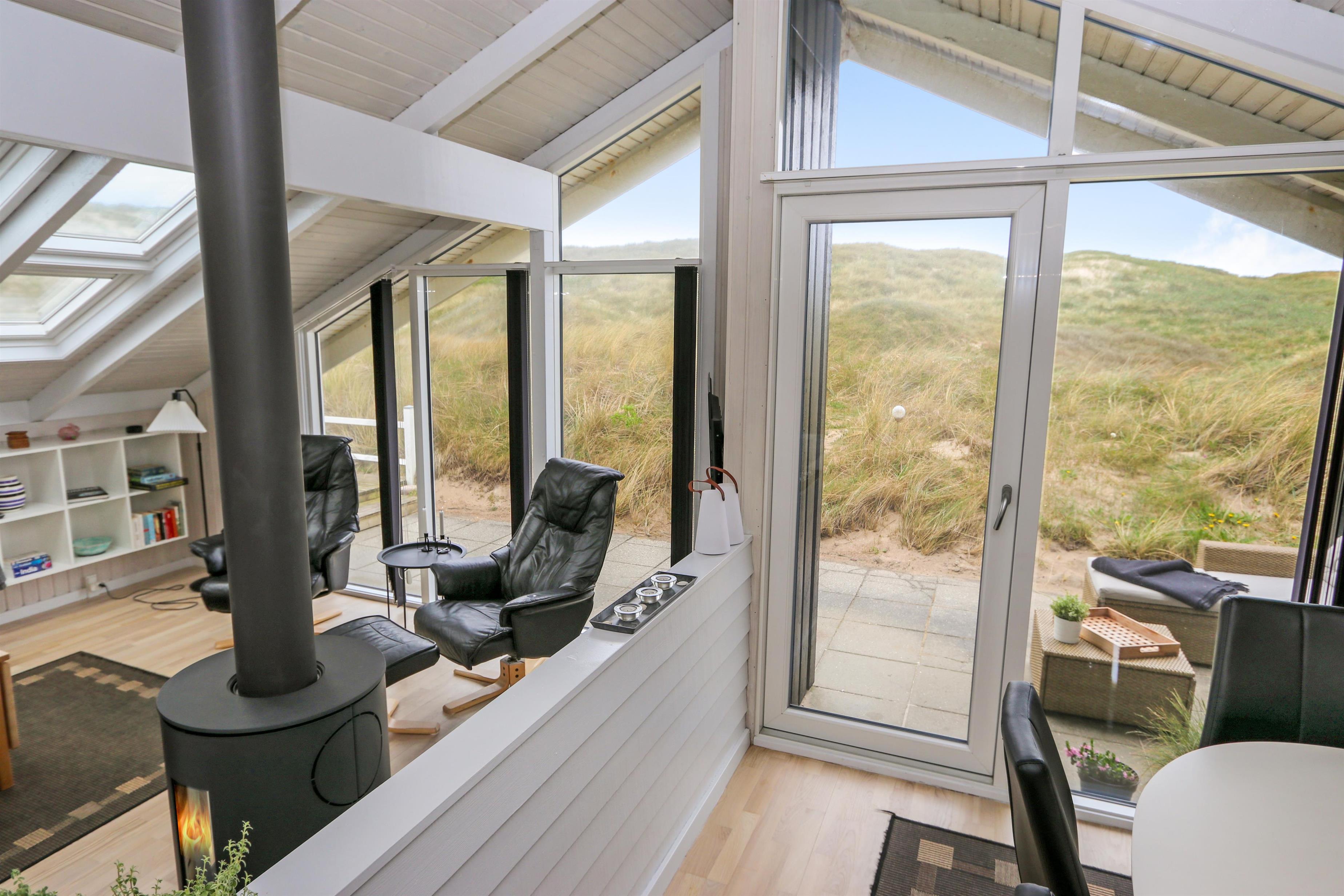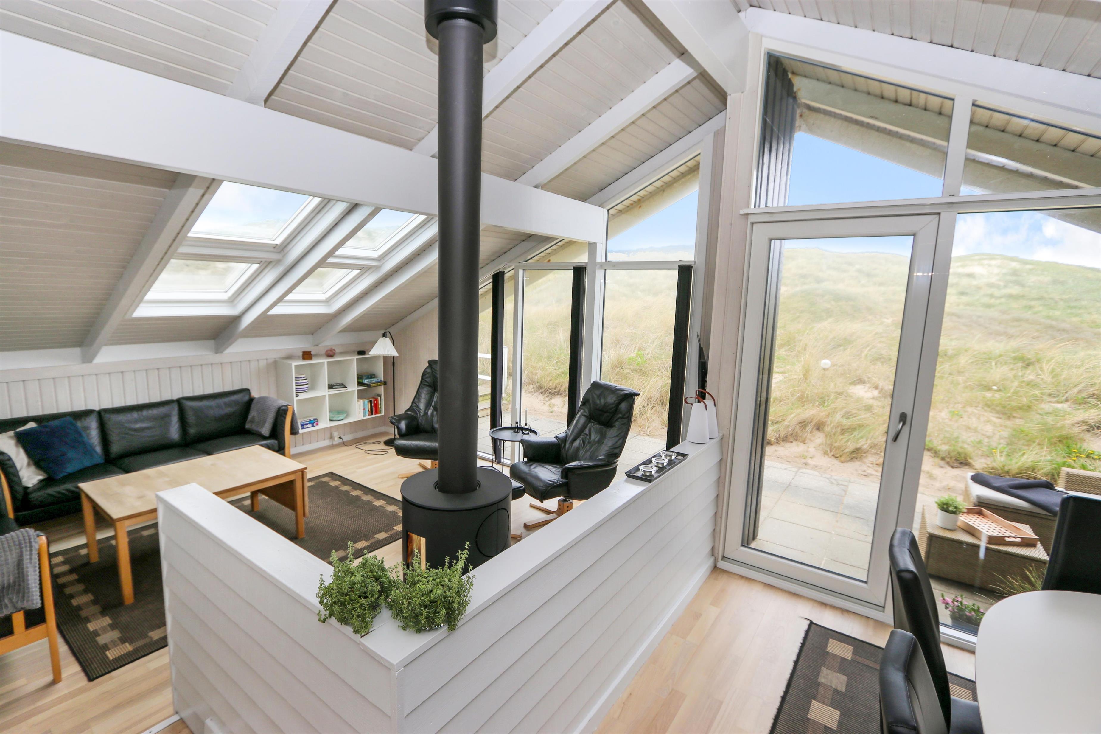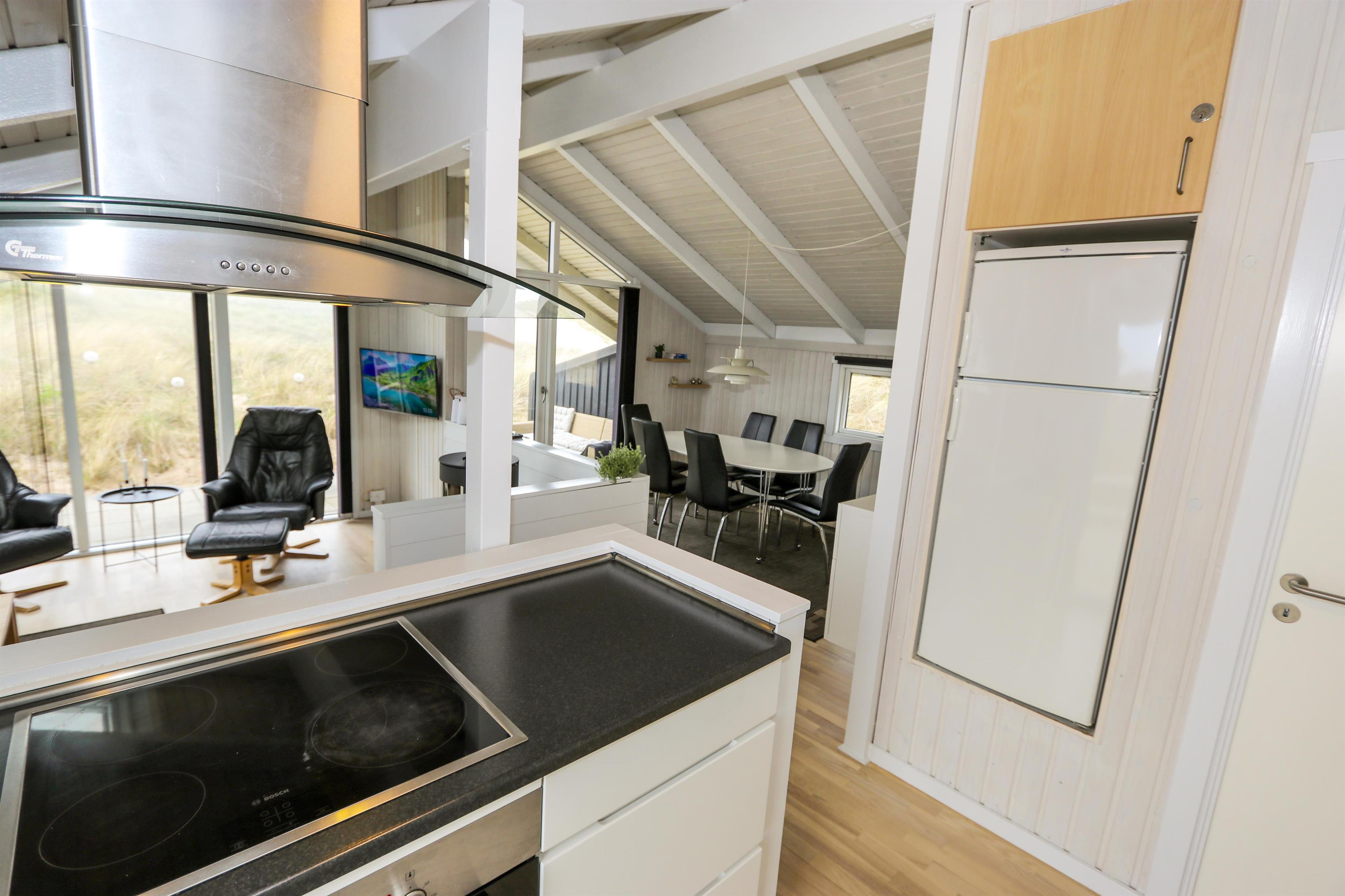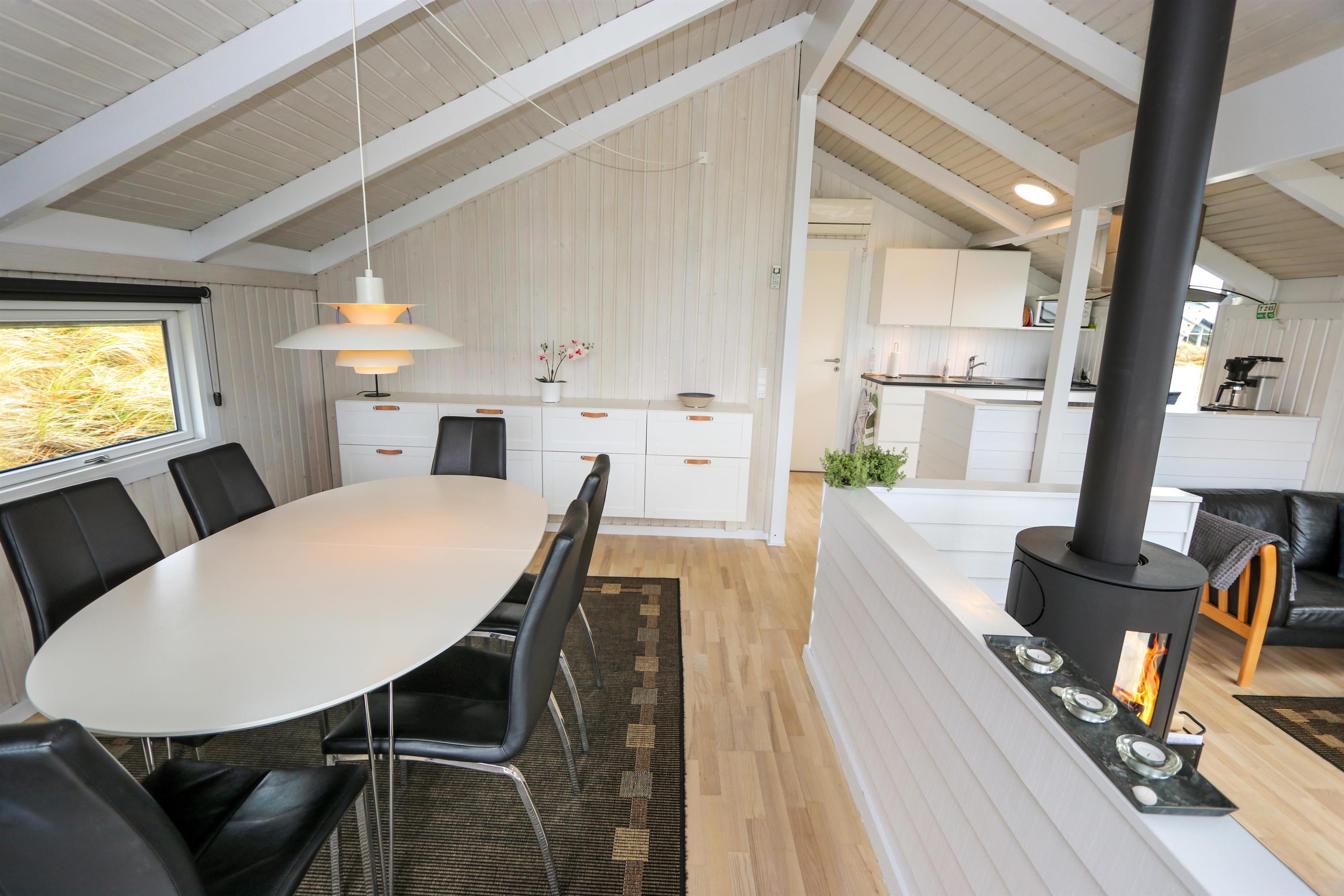 Offene Küche mit Wohn- und Essbereich, gut ausgestattet mit allen möglichen Geräten, u. a. Geschirrspüler, Mikrowelle und Kühlschrank mit Gefrierfach. Das Wohnzimmer ist zur Küche und zum Essbereich hin abgesenkt. Es ist eingerichtet mit komfortablen Möbeln, Flachbildschirm-TV mit dänischem (DR1) und deutschem Programm (Satellitenempfang). Setzen Sie sich auf die Couch vor den knisternden Holzofen, hören Sie Ihre Lieblings-CD und genießen Sie den Blick auf die Dünen. All das bietet das Haus für einen erholsamen Urlaub. 3 Schlafzimmer: 1 DB + 1 DB + 2 EB. Badezimmer mit Dusche, Toilette, Waschbecken, Sauna und Waschmaschine. Das Haus hat eine energiesparende Wärmepumpe installiert. Haustiere sind nicht erlaubt. Für Elektro-Autos gibt es beim Haus ein Auflader.