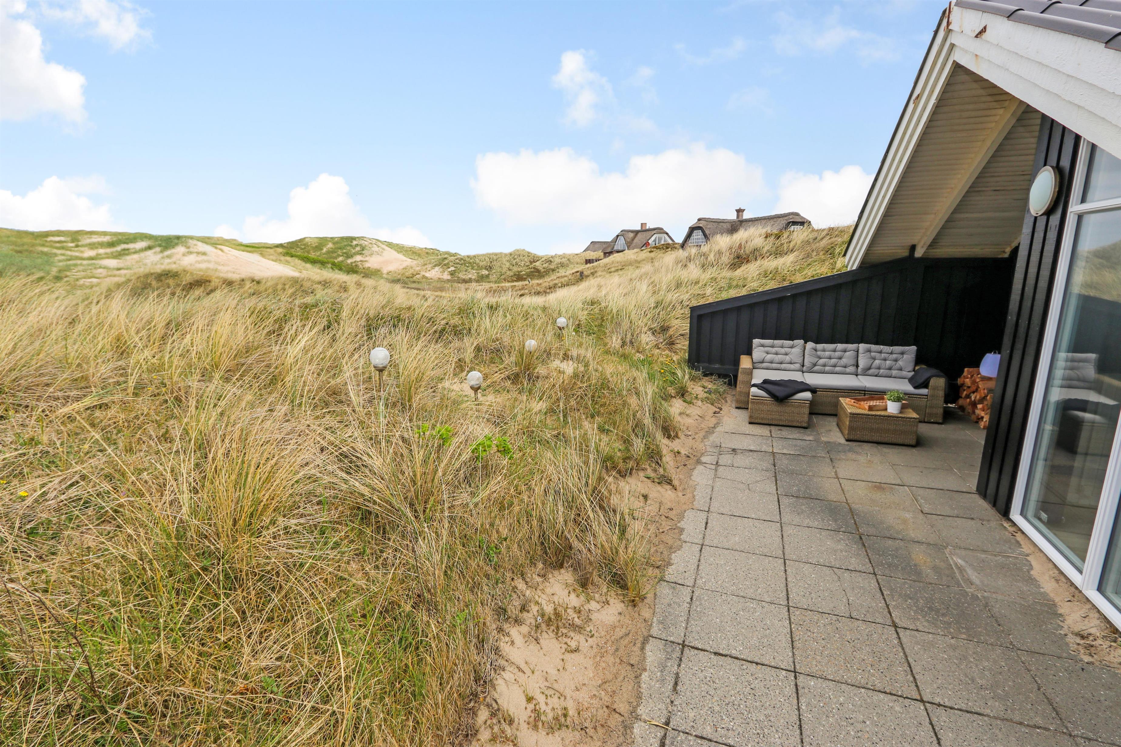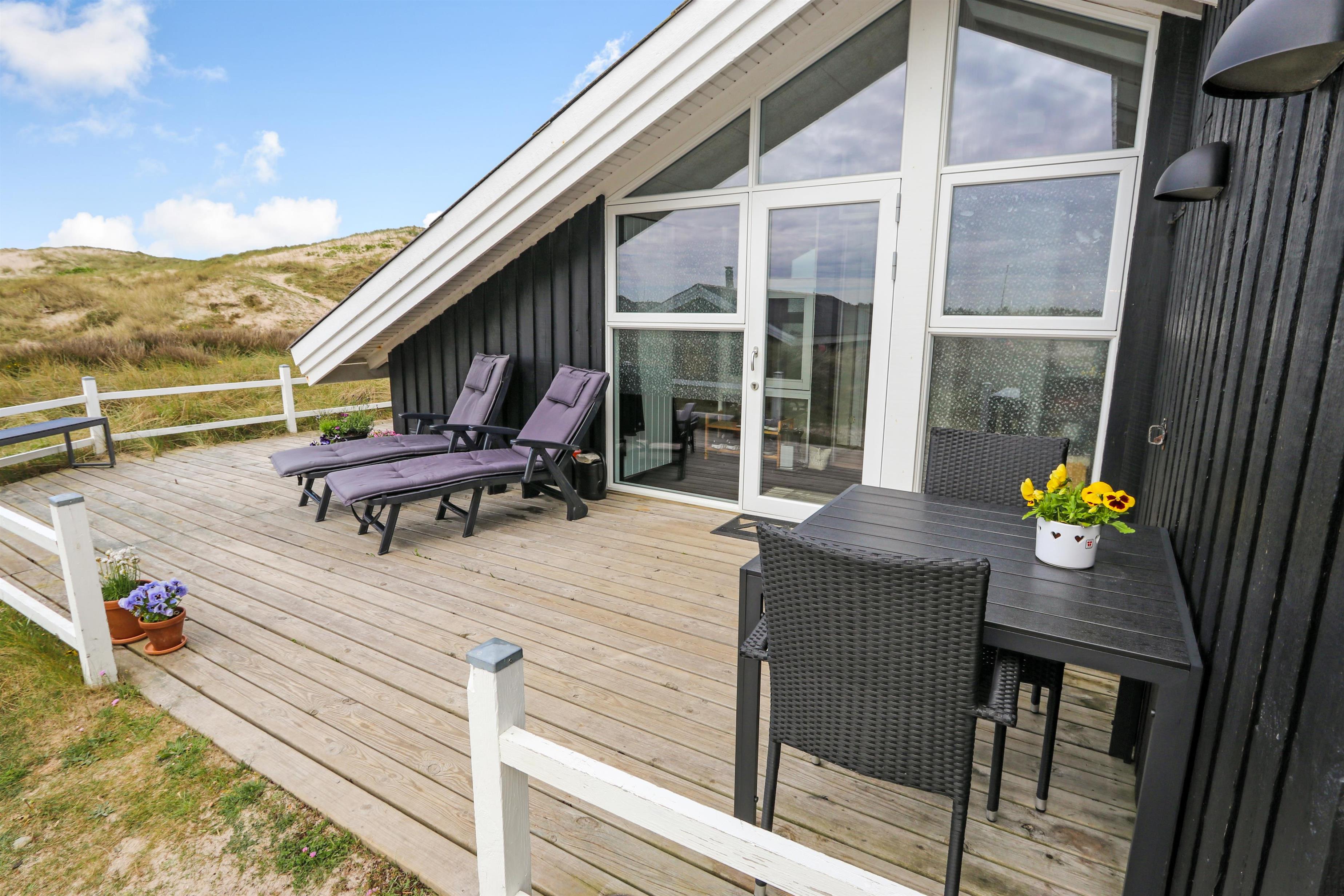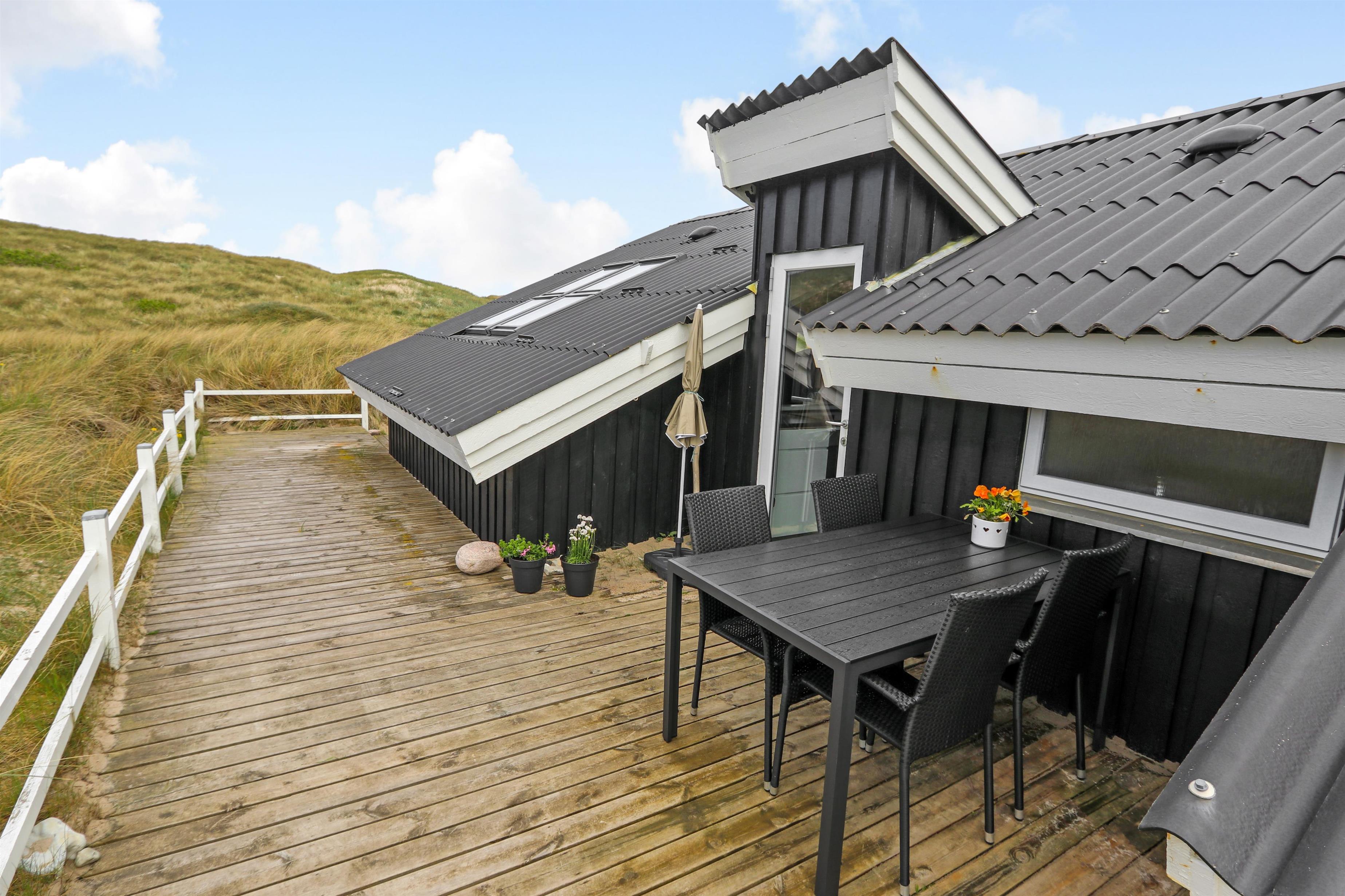 Eine große Terrasse umgibt den größten Teil des Hauses, von der man das Meer rauschen hört. Sie ist mit Gartenmöbeln, Sonnenliegen und Grill ausgestattet. Hier finden Sie immer ein geschütztes Plätzchen um die Sonne zu genießen. Vom Haus sind es nur 20 m bis zum weißen Sandstrand und vom Grundstück gelangt man direkt an die Nordsee. Hier können Sie lange Spaziergänge unternehmen, nach Steinen und Bernstein suchen, sich in einer Kuhle sonnen und das Meer genießen. Abends klettert man auf eine Düne und schaut den Sonnenuntergang über der Nordsee. Zugang zum Harboøre Center.