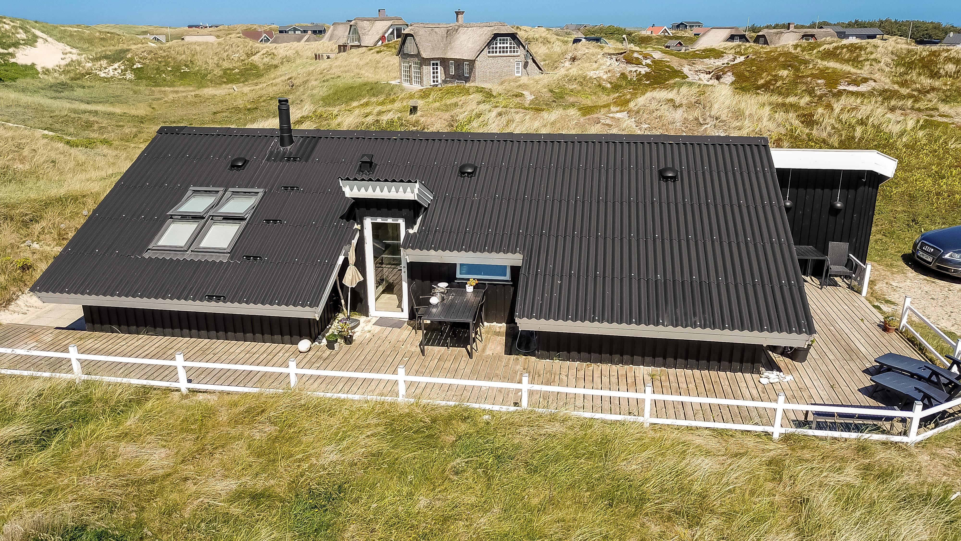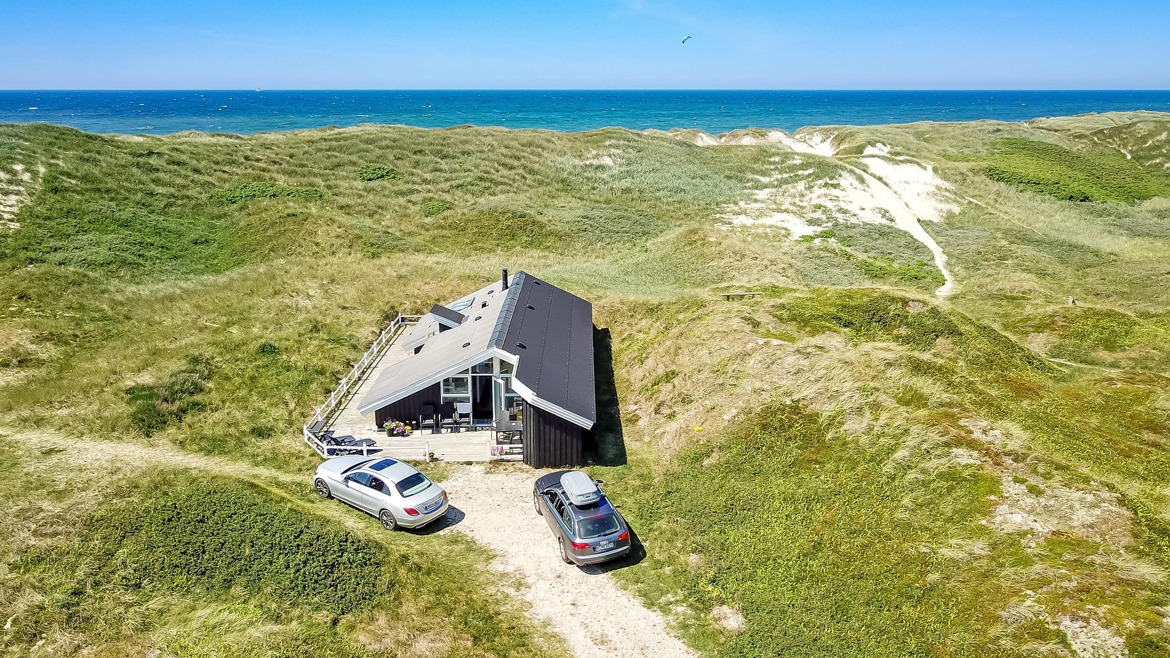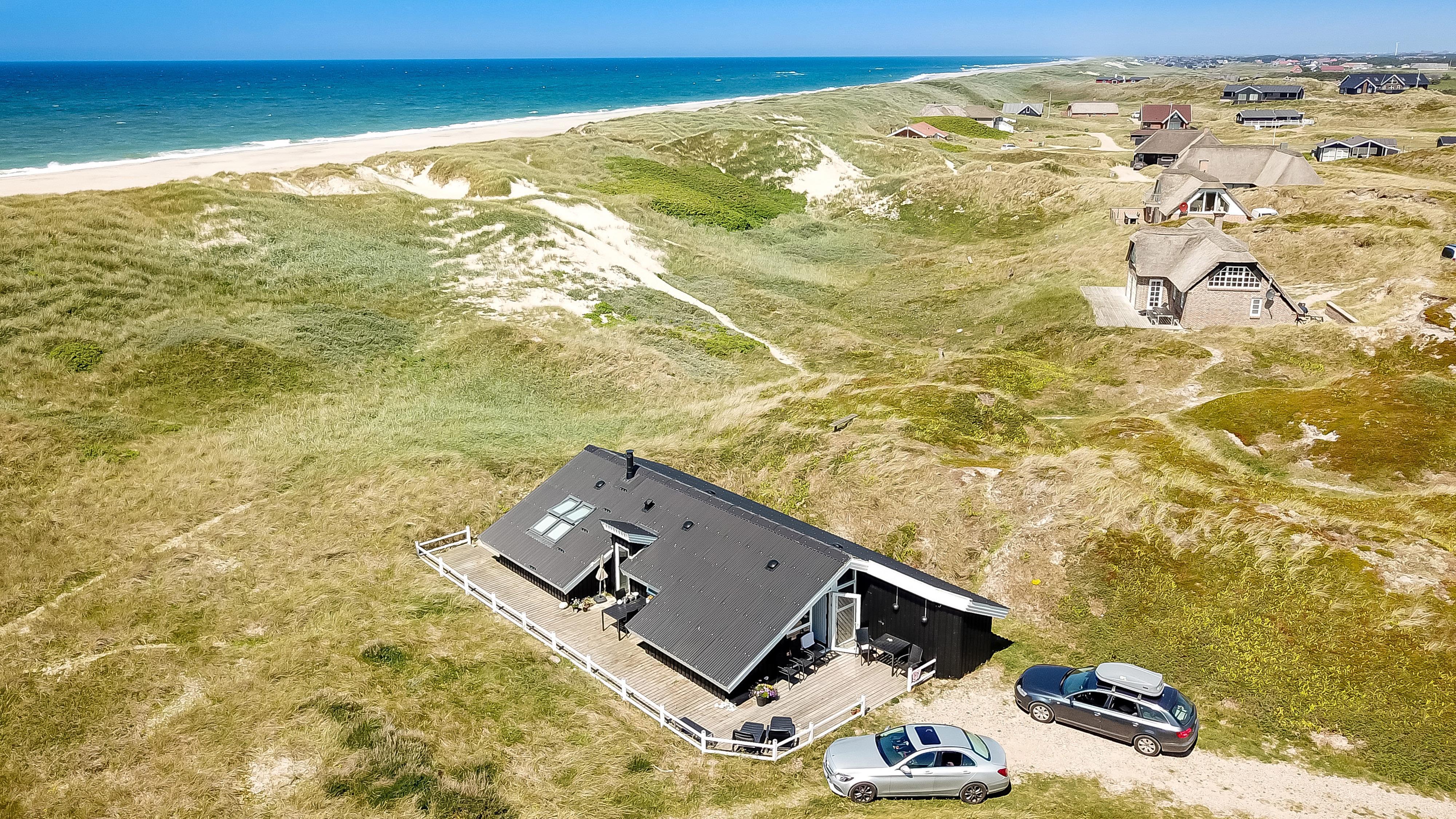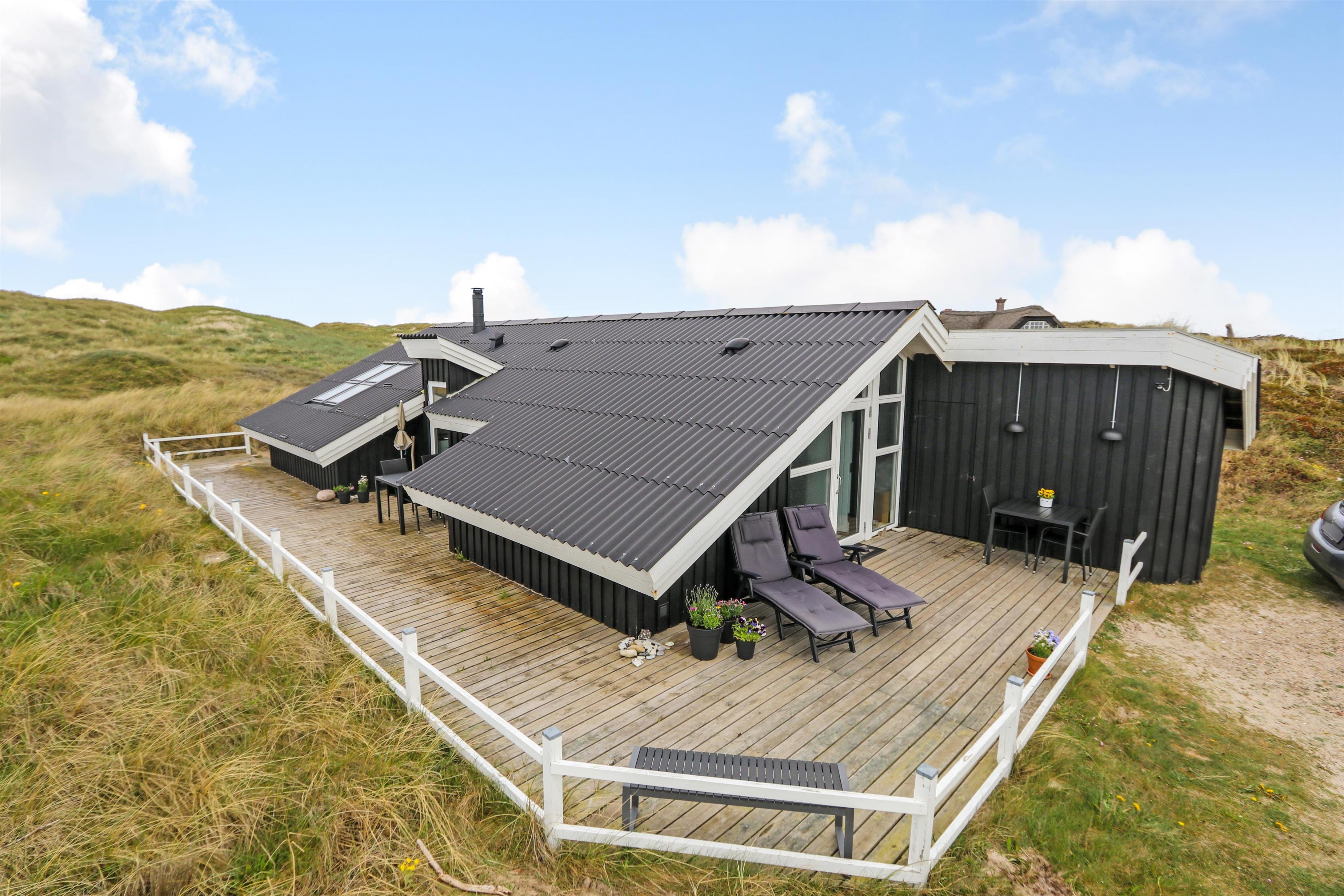 Eine große Terrasse umgibt den größten Teil des Hauses, von der man das Meer rauschen hört. Sie ist mit Gartenmöbeln, Sonnenliegen und Grill ausgestattet. Hier finden Sie immer ein geschütztes Plätzchen um die Sonne zu genießen. Vom Haus sind es nur 20 m bis zum weißen Sandstrand und vom Grundstück gelangt man direkt an die Nordsee. Hier können Sie lange Spaziergänge unternehmen, nach Steinen und Bernstein suchen, sich in einer Kuhle sonnen und das Meer genießen. Abends klettert man auf eine Düne und schaut den Sonnenuntergang über der Nordsee. Zugang zum Harboøre Center.