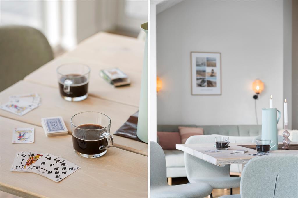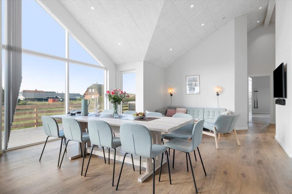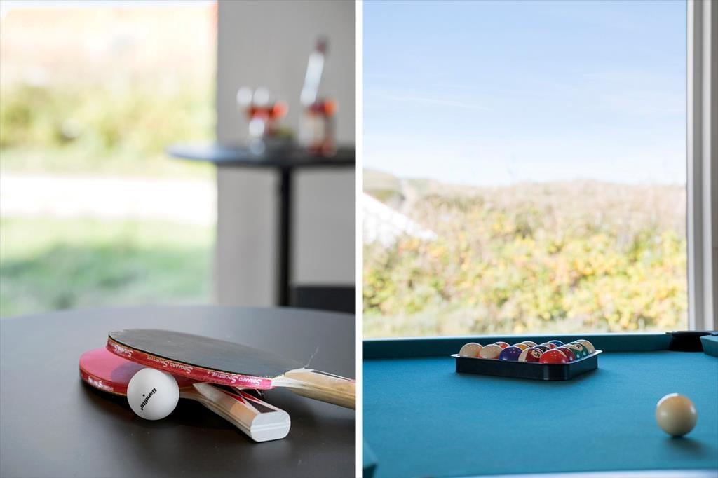 Das Ferienhaus ist in einem hellen und modernen Stil eingerichtet und mit Troldtekt-Decken ausgestattet, die für eine angenehme Akustik und ein klares Design sorgen. Im Herzen des Hauses liegt der Wohnbereich, in dem Küche und Wohnzimmer nahtlos ineinander übergehen und so einen natürlichen Treffpunkt für das Ferienleben schaffen. Hier könnt ihr gemeinsam kochen, gemütlich essen oder auf dem Sofa entspannen und die freie Zeit genießen. Wenn der Spieltrieb erwacht, wartet der Aktivitätsraum mit Billardtisch und Tischtennisplatte auf euch – perfekt für freundschaftliche Wettbewerbe und gemeinsame Stunden. Das Haus lädt zum Zusammensein und zur Entspannung ein, schafft aber auch Rückzugsorte für Ruhe und Vertiefung – sei es mit einem guten Buch oder an der Spielkonsole. Ein Ferienhaus, in dem sich Groß und Klein – und auch die Vierbeiner – ganz zuhause fühlen können.