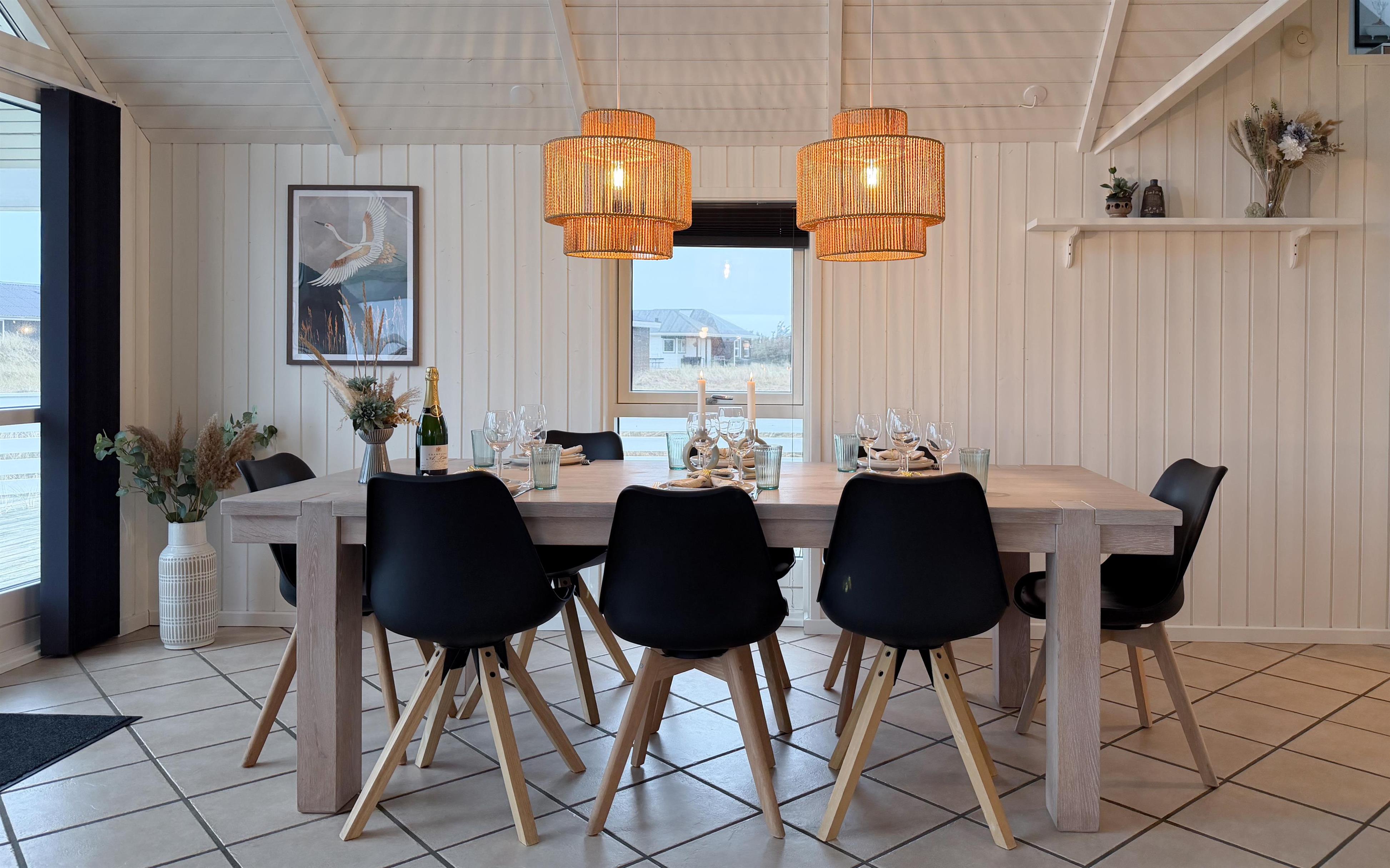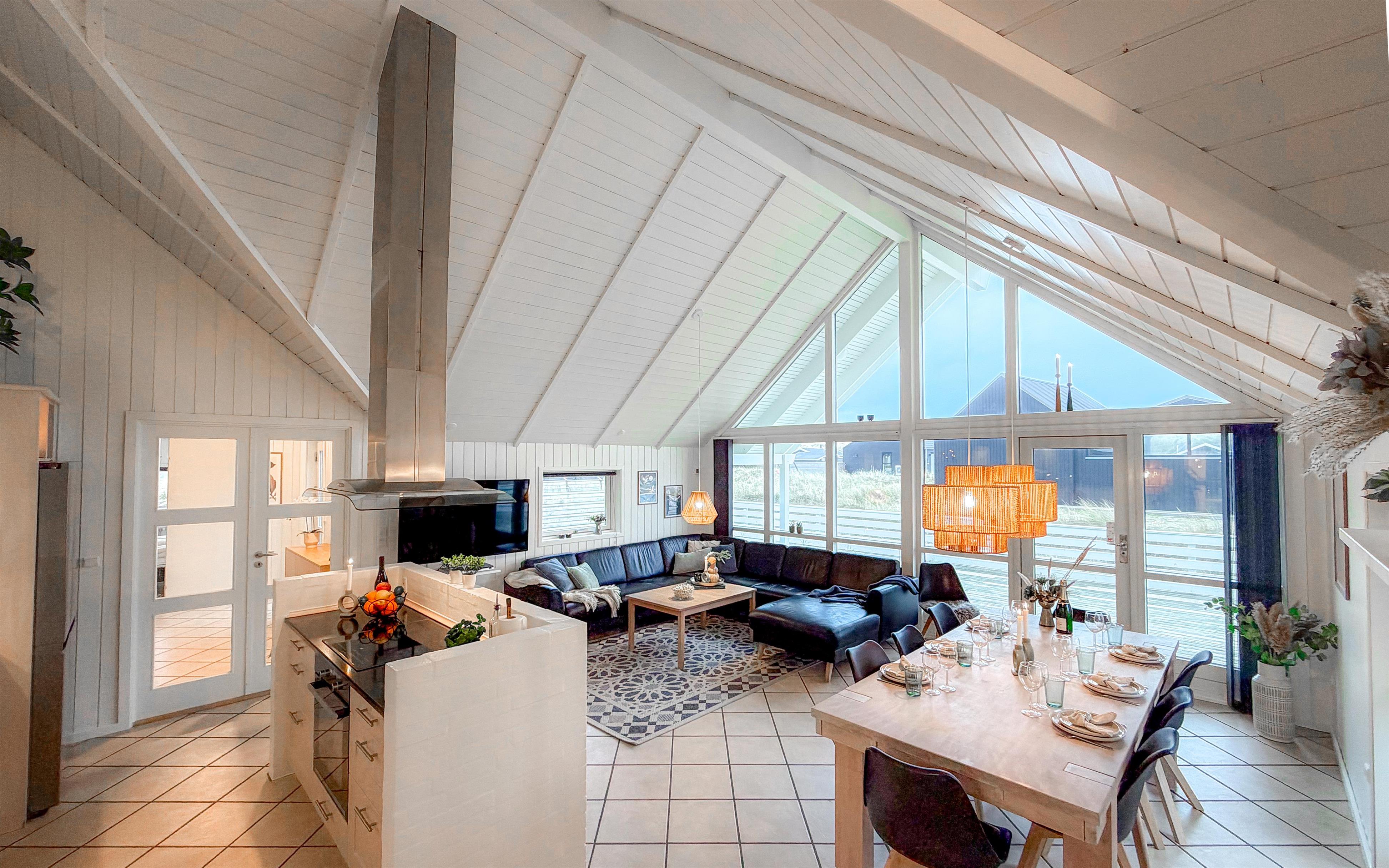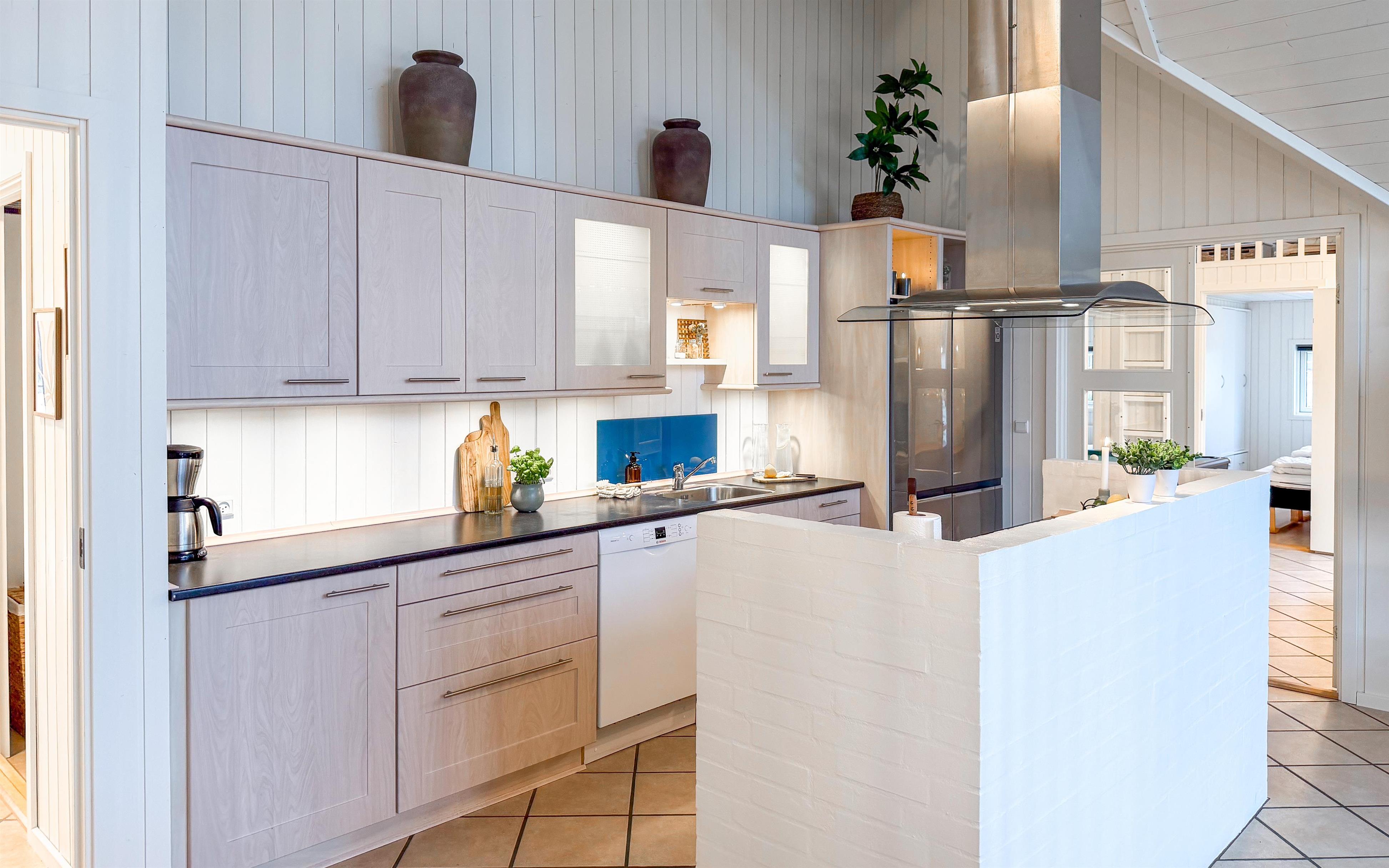 Im Inneren bietet das Haus 125 m² Wohnfläche mit einer durchdachten Raumaufteilung. Es gibt vier Schlafzimmer mit insgesamt vier Doppelbetten und einen Hems mit zwei Einzelbetten sowie zwei Badezimmer mit Dusche und WC. Eines der Badezimmer ist zusätzlich mit Waschmaschine und Trockner ausgestattet. Der natürliche Treffpunkt des Hauses ist der gemütliche Wohnbereich in offener Verbindung mit der Küche, wo Sie nach einem Tag am Meer gemeinsam kochen, essen oder entspannen können. Die Küche ist gut ausgestattet mit Herd, Dunstabzugshaube, Geschirrspüler, Mikrowelle, Kühlschrank, Gefrierschrank (60 l) sowie Kaffeemaschine. In Teilen des Hauses sorgt eine für zusätzlichen Komfort.