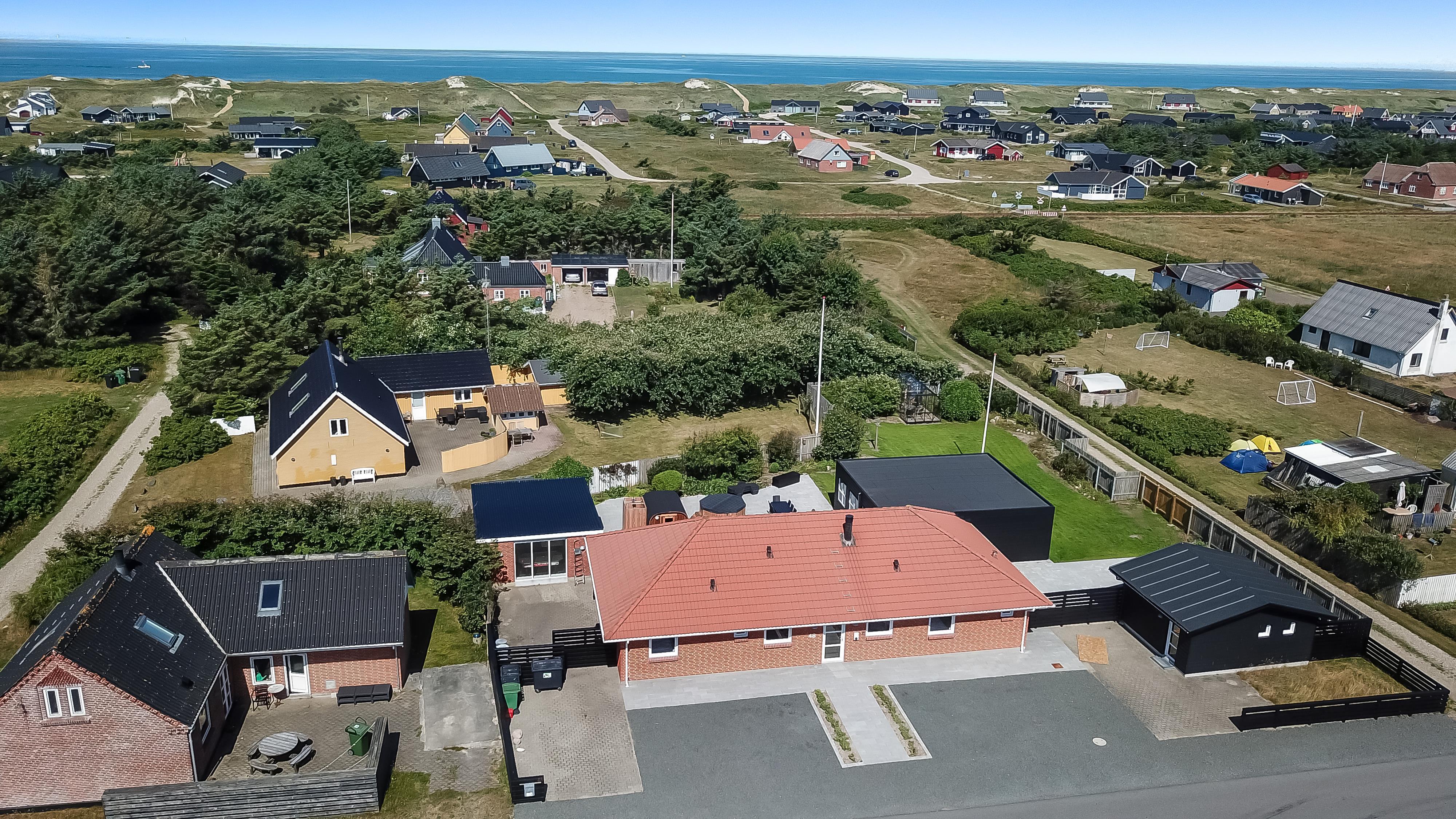 Ferienhaus auf 240 qm. Das Haus wurde im Jahr 1997 erbaut und ist in 2022 total renoviert worden. Das Haus ist minimalistisch in seinem Ausdruck, praktisch eingerichtet und in hellen, freundlichen und einladenden Farben und Materialien. Ein großer Flur mit Waschmaschine, Trockner und eingebauter Schränken mit Türen vom Boden bis zur Decke heißt Sie willkommen. Vom Flur aus kommen Sie in das schöne kombinierte Esszimmer/Küche mit Fußbodenheizung. Ganz neu und einladende Küchenecke mit allem an Geschirr und Kochgeschirr, Geschirrspüler, Ceranfeld-Kochplatten, eingebautem Ofen, Abzugshaube, Kühl-/Gefrierschrank, Mikrowelle. In der Küchenabteilung gibt es auch einen ganz neuen Brennofen, der zusammen mit der ersten von insgesamt 3 Wärmepumpen zusammen hängt. Alles zusammen eine Optimierung , die das Haus sehr energieeffizient und günstiger im Verbrauch macht. In der Verlängerung der Küche steht der Esstisch mit reichlich Platz für alle Gäste. Wohnraum mit neuen schönen Ledermöbeln, Smart-TV mit dänischen und deutschen Programmen und der Möglichkeit zum streamen von TV / Radio / Apps über Chromecast für das Sie selber ein Abonnement haben. Im Haus gibt es 6 gute Schlafräume mit guten neuen Betten. (1DB, 1DB, 1DB, 1DB, (1DB + 1EB), (1DB + 1EB). Schönes Badezimmer mit Fliesenboden mit Fußbodenheizung, Toilette, Waschbecken und Dusche. Extra Badezimmer mit Fliesenboden mit Fußbodenheizung, Toilette, Waschbecken und Dusche. Nichtraucher-Haus.