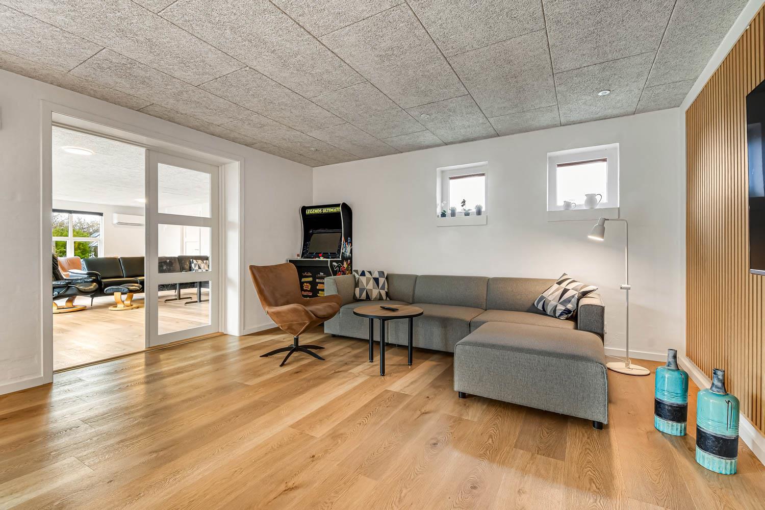 Die große Garage ist umgebaut zu einem perfekten Aktivitätsraum. Der Raum ist isoliert und hat eine eigene Wärmepumpe. Der Aktivitätsraum enthält Shuffleboard, Dart, Tischfußball, Air Hockey und TV mit Playstation. Hier kann man viele Stunden verbringen.