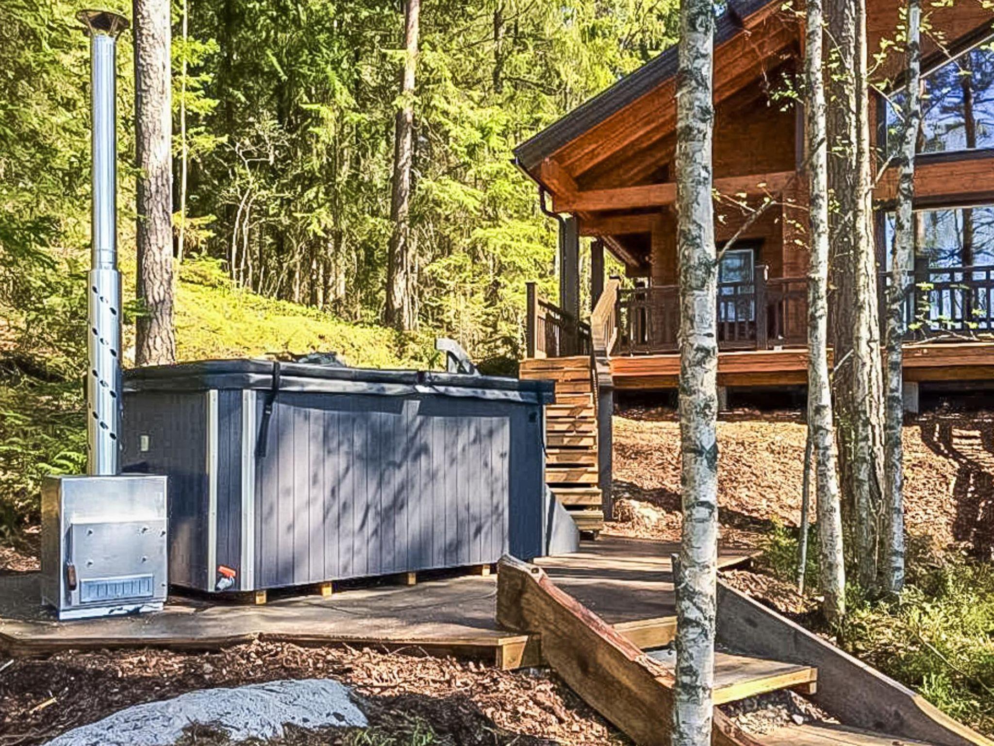 Lamellar log chalet 2018, kitchen, living room, 2 bedrooms both with 2 beds. Baby cot in one bedroom. Upstairs bedroom 4 beds. Washroom (2 showers), sauna (electric), utility room, hall and open porches. Toilet downstairs and upstairs.