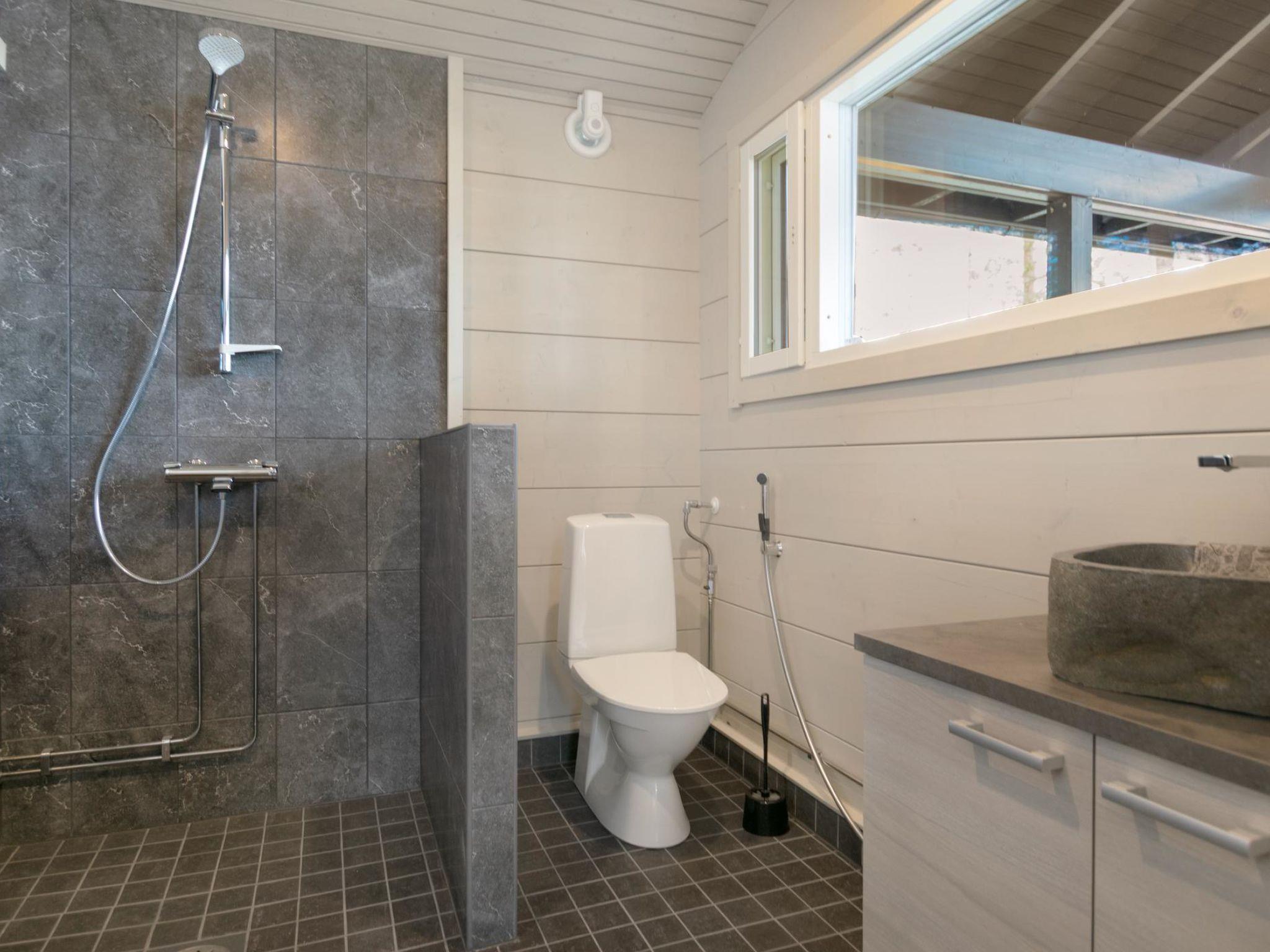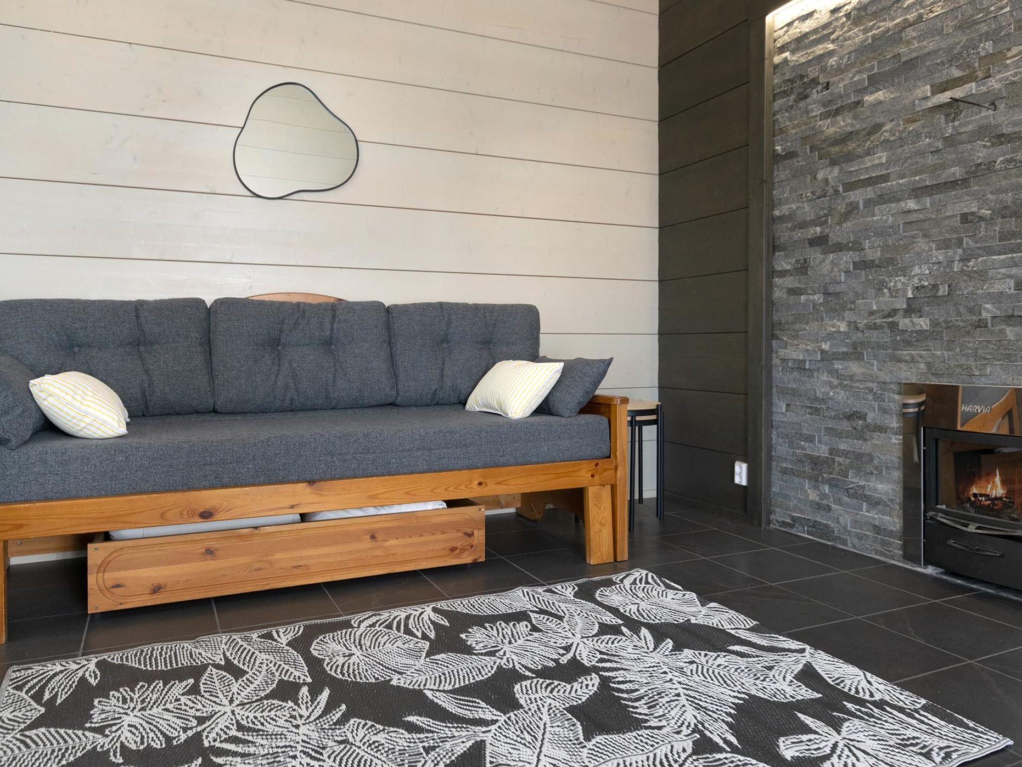 The cabin has two bedrooms. One bedroom features a double bed (160×200 cm), and the other has two single beds (90×200 cm each). In addition, there is a sofa bed (140×200 cm) for two in the lakeside sauna building. The lakeside sauna includes its own WC and shower, and it is heated year-round.