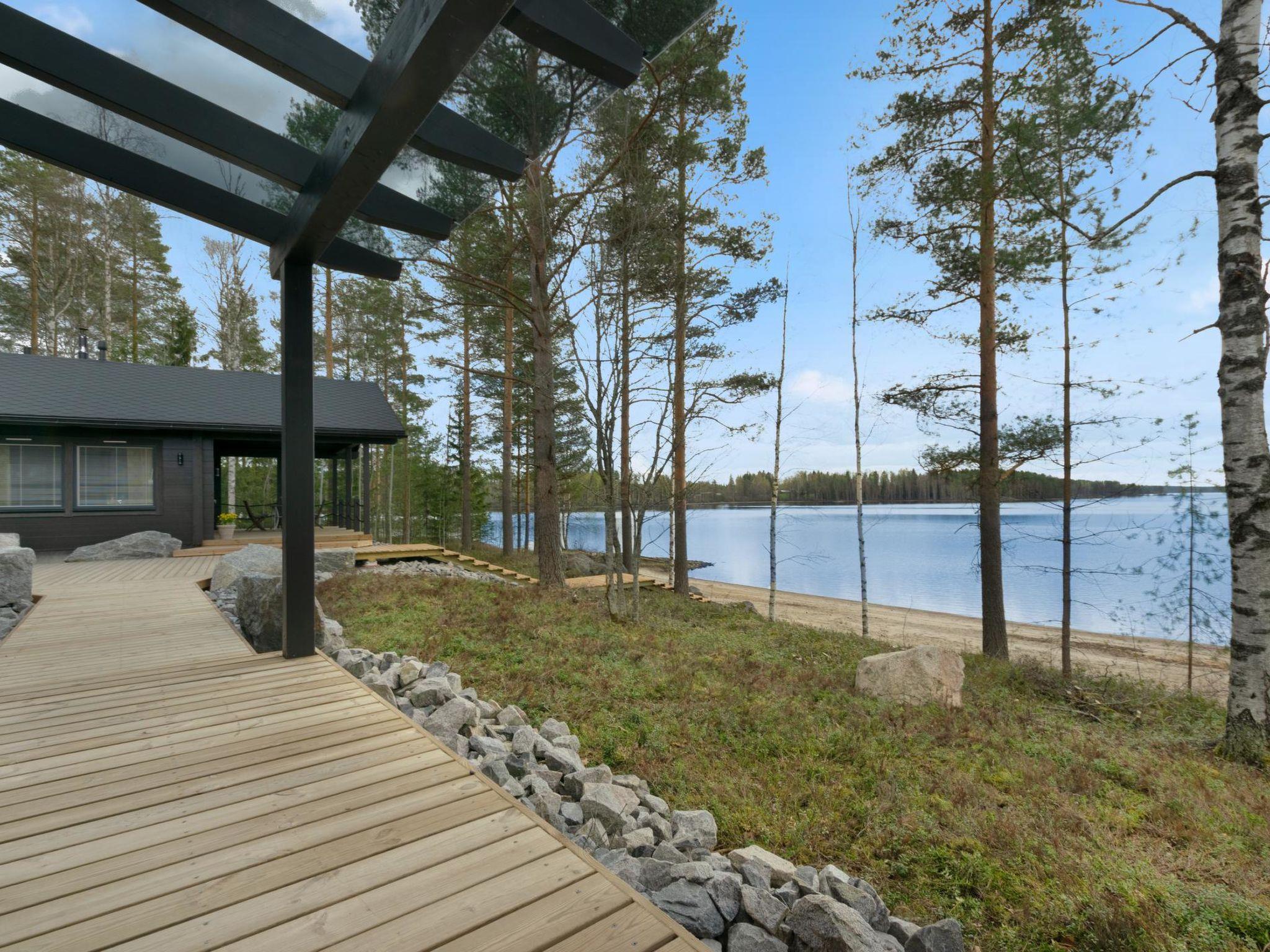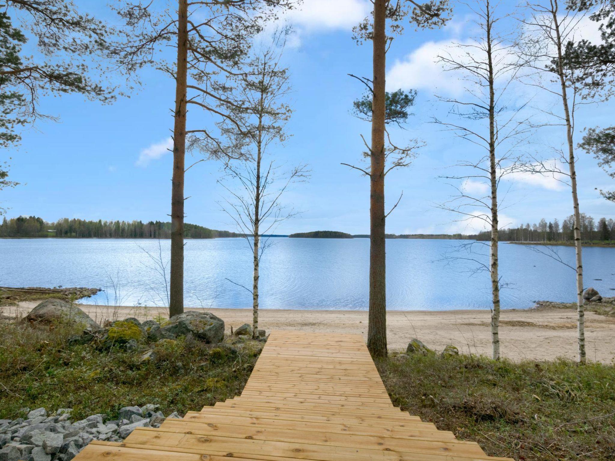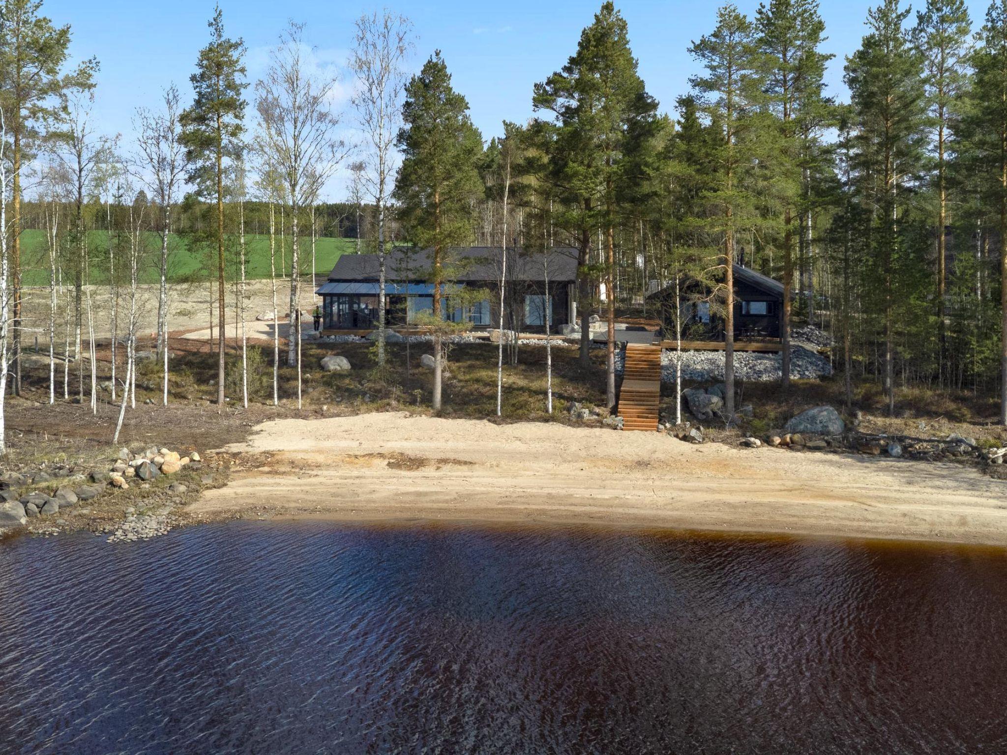 A stylish, high-quality, and spacious cabin in a peaceful location at the end of the road. The cabin features its own wide sandy beach. From the large 40 m² glazed terrace, you can enjoy views of Lake Peränne even on cooler days. The terrace is furnished with outdoor furniture and a gas grill.