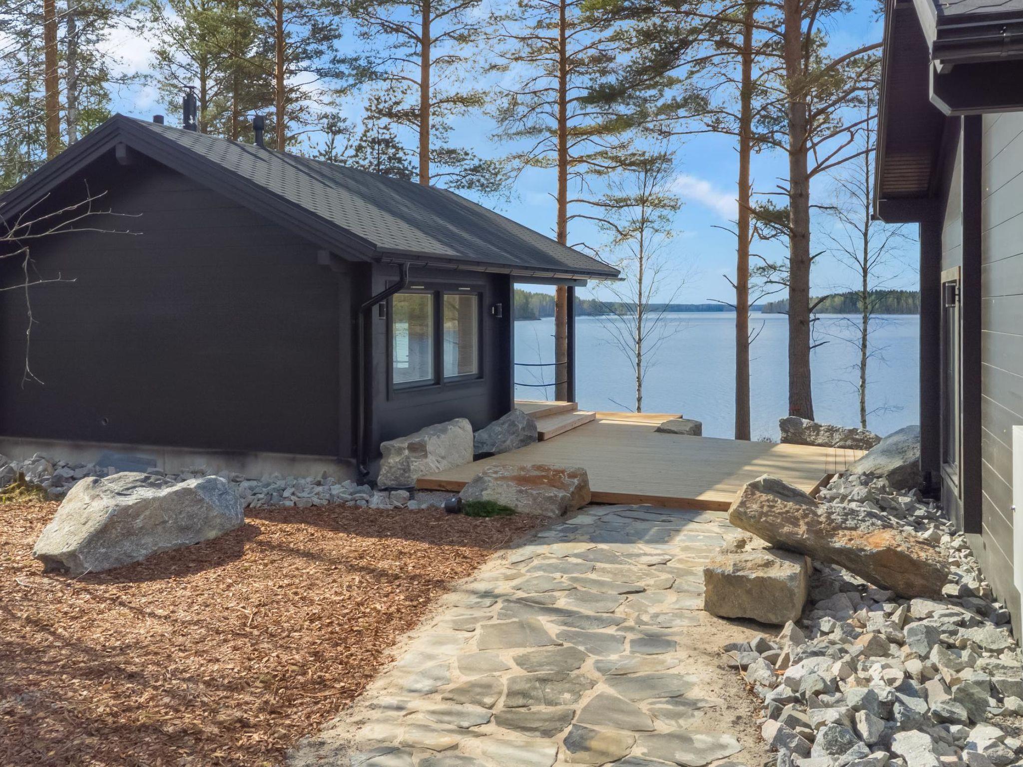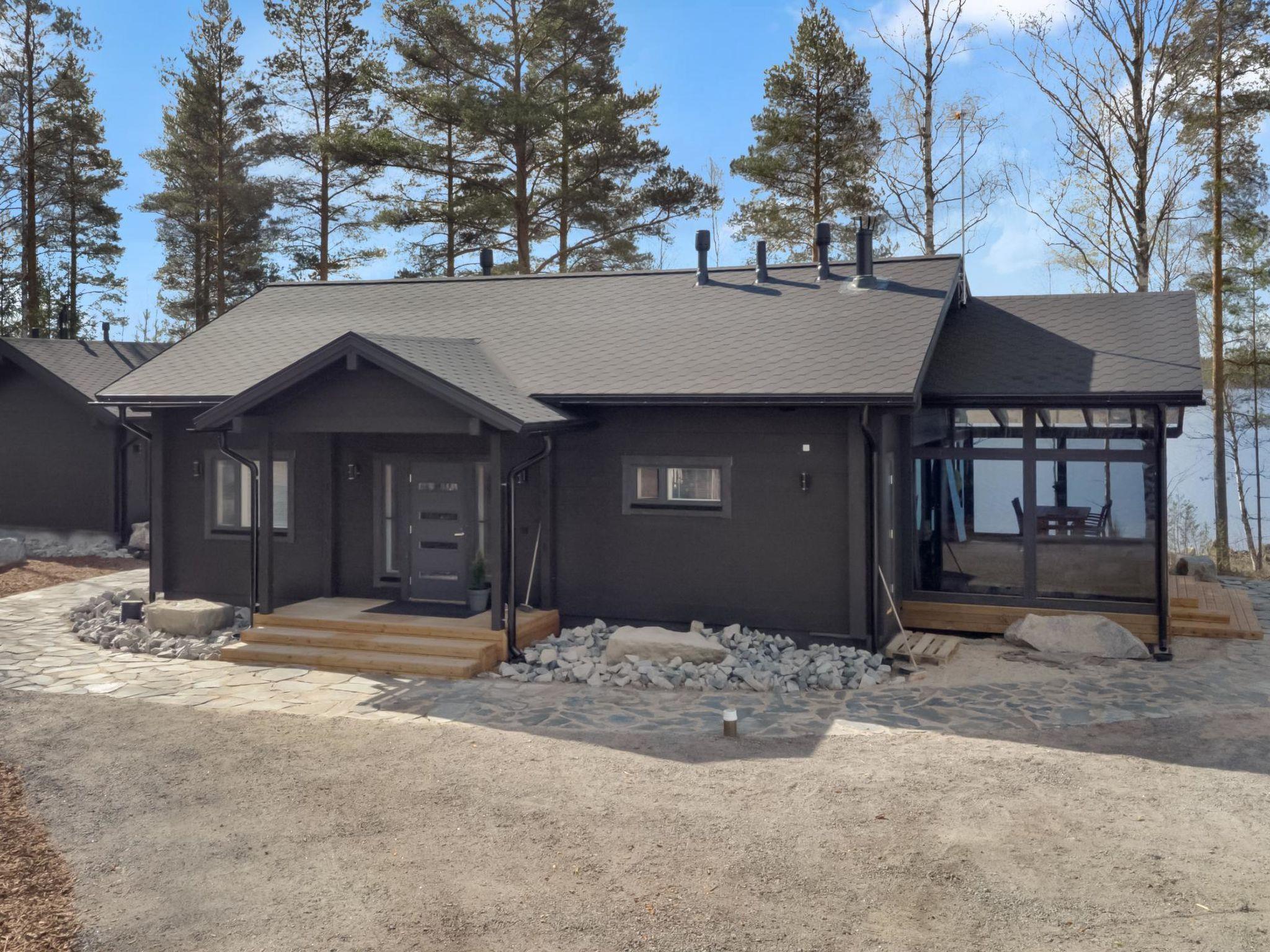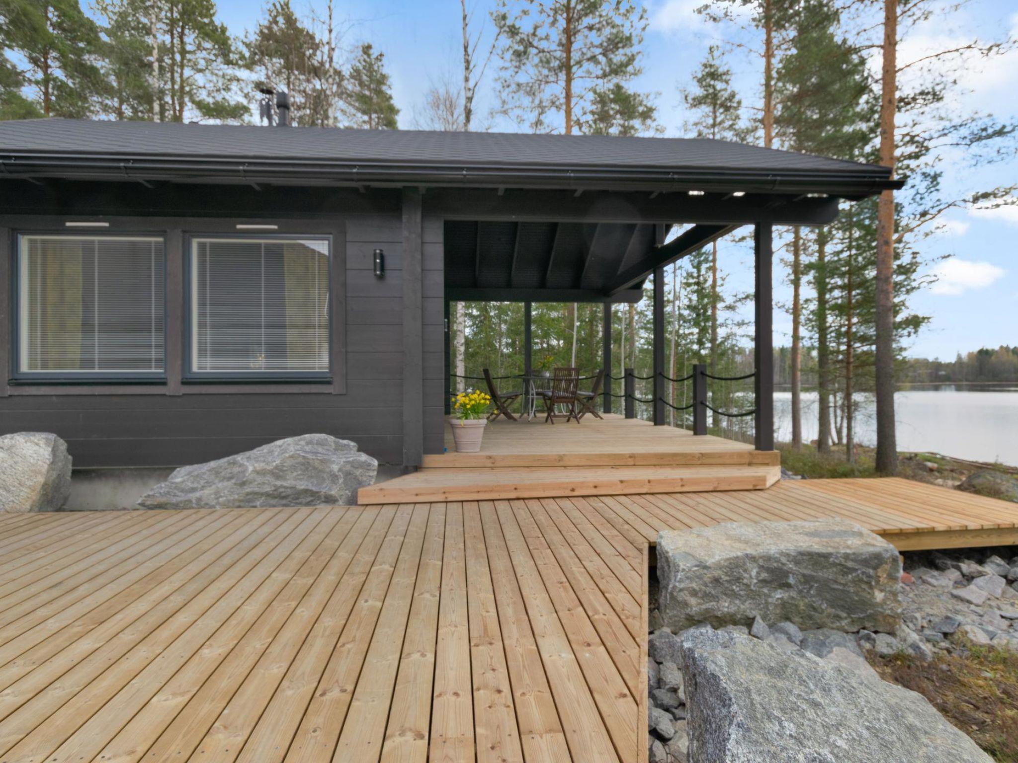 A stylish, high-quality, and spacious cabin in a peaceful location at the end of the road. The cabin features its own wide sandy beach. From the large 40 m² glazed terrace, you can enjoy views of Lake Peränne even on cooler days. The terrace is furnished with outdoor furniture and a gas grill.