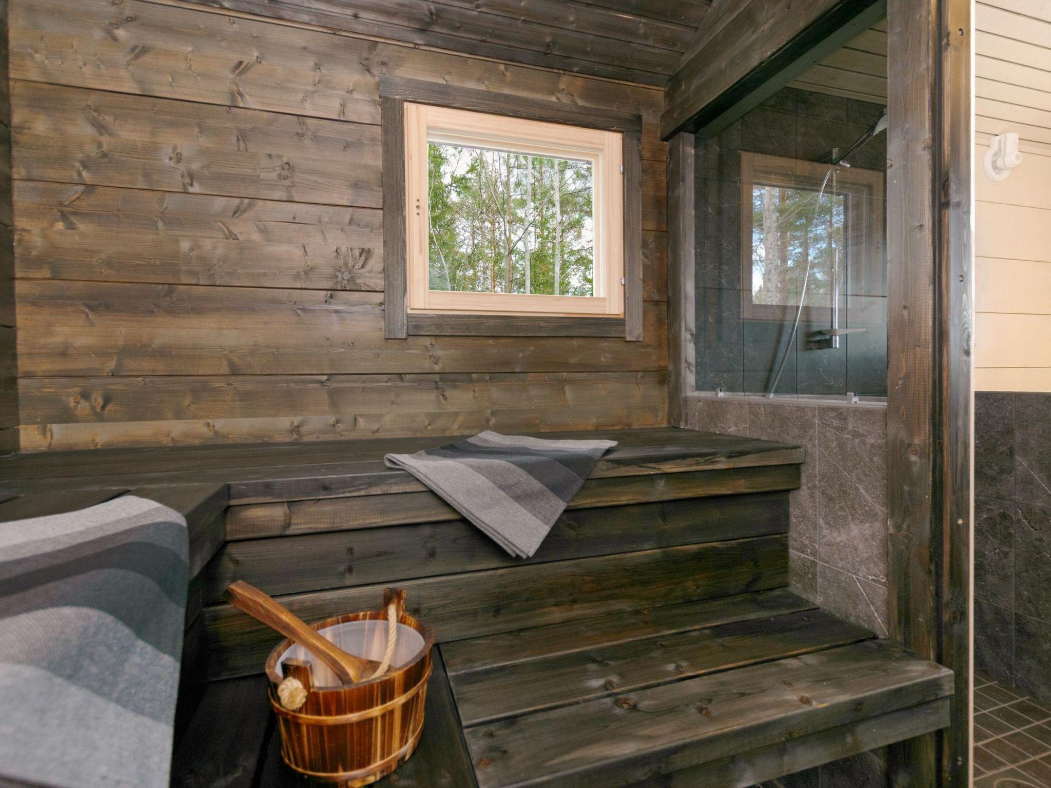 The lakeside sauna features a mini kitchen, dining area, and sofa bed. The washroom has a shower, WC, and sink. The sauna is wood-heated.