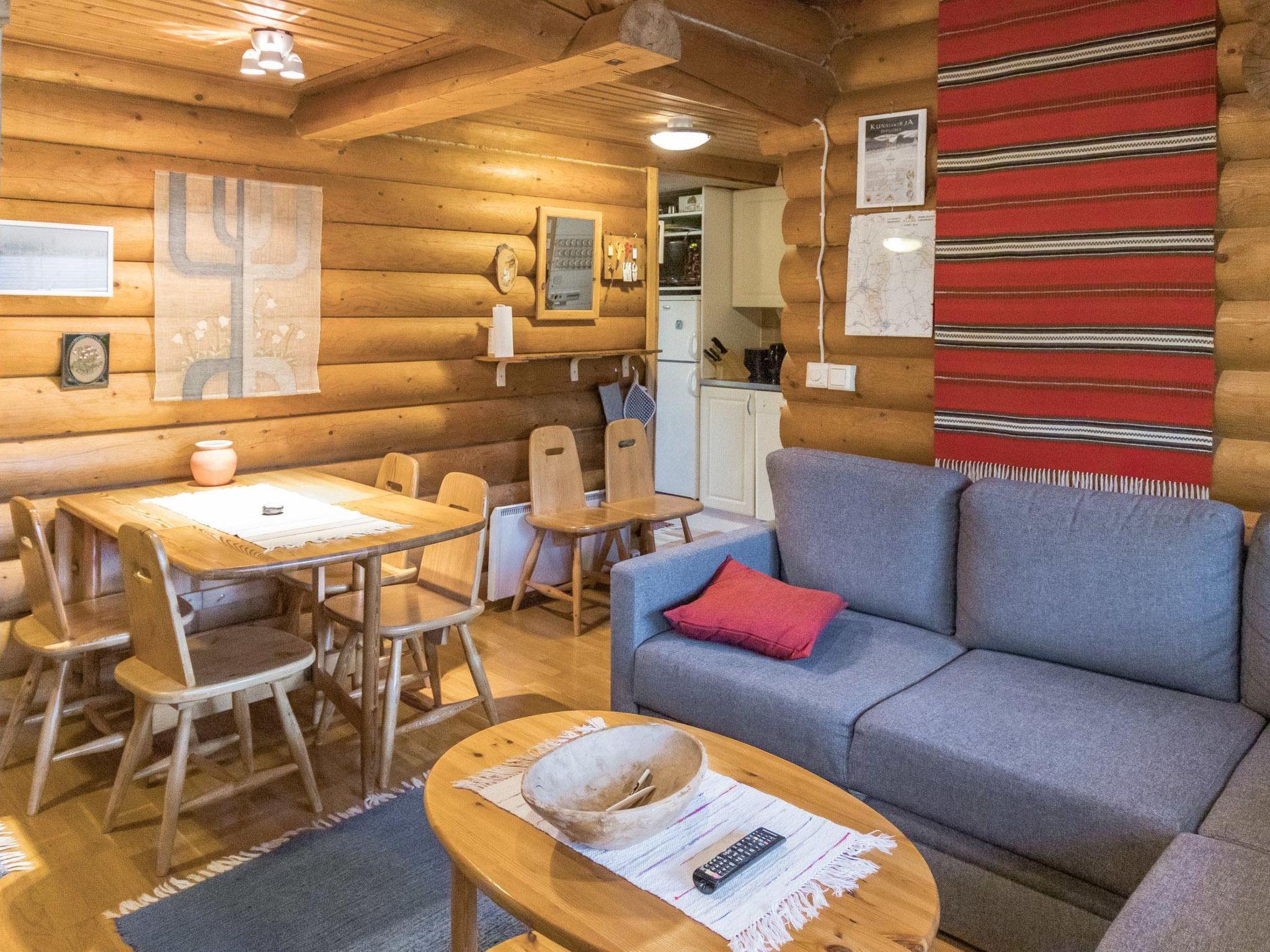 40 km north of Kolari, lake Äkäslompolo 400 m, swimming beach 900 m. Log rowhouse apartment 1988. Combined livingroom/kitchen with sofa bed, bedroom: double bed, sauna (electric), bathroom/toilet. Ski service room. Apartment doors height of only 180 cm, the height of the apartment in some places lower than normal. Loft is not suitable for accommodation because of lack of emergency exit.