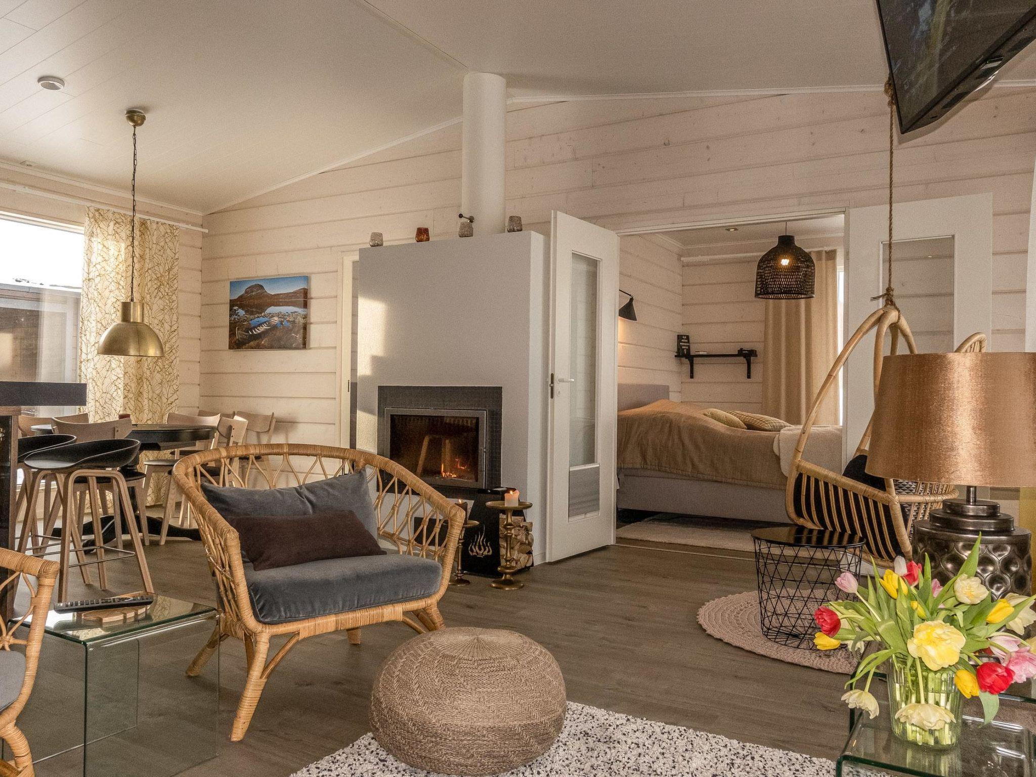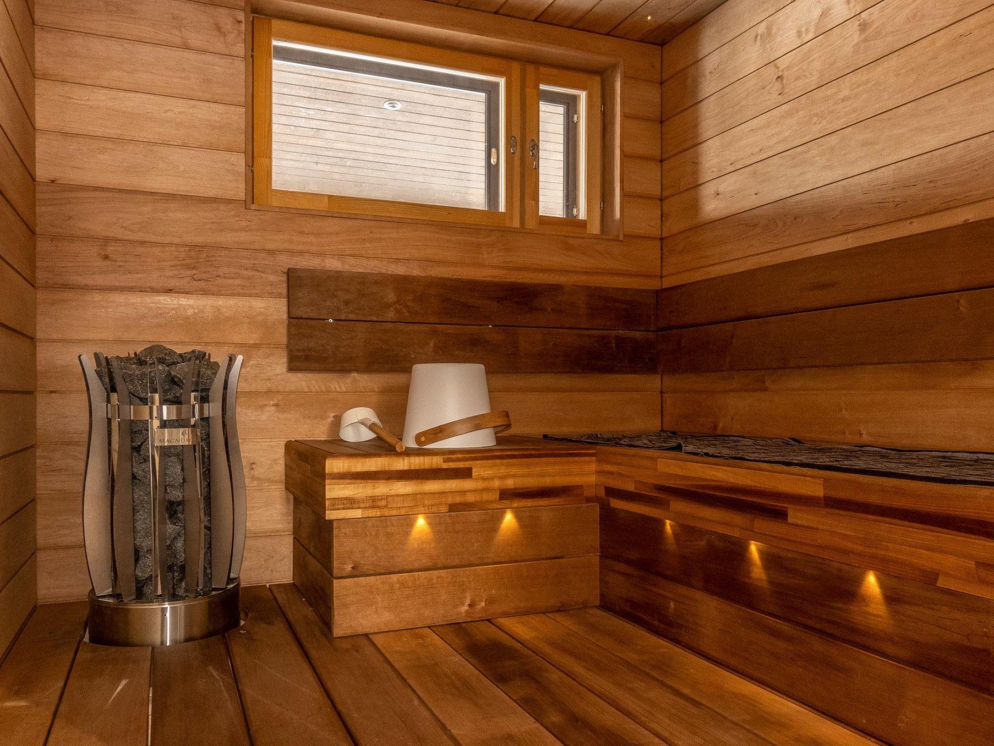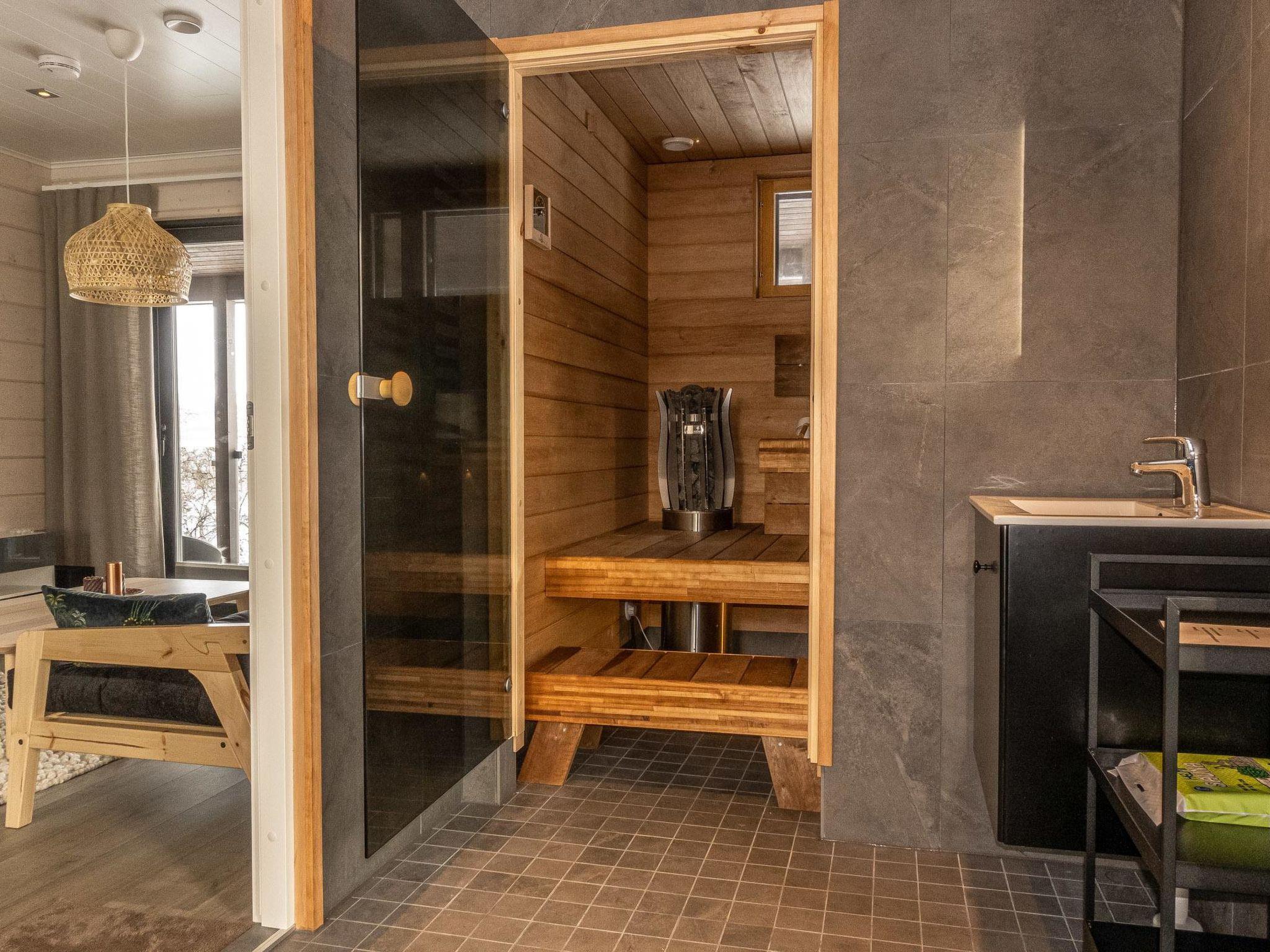 Sauna compartment with sauna room, washroom, living area and WC. In the living area there is sofa bed and smart TV 55", two showers in the washroom. Access to the sauna compartment is from a covered terrace.