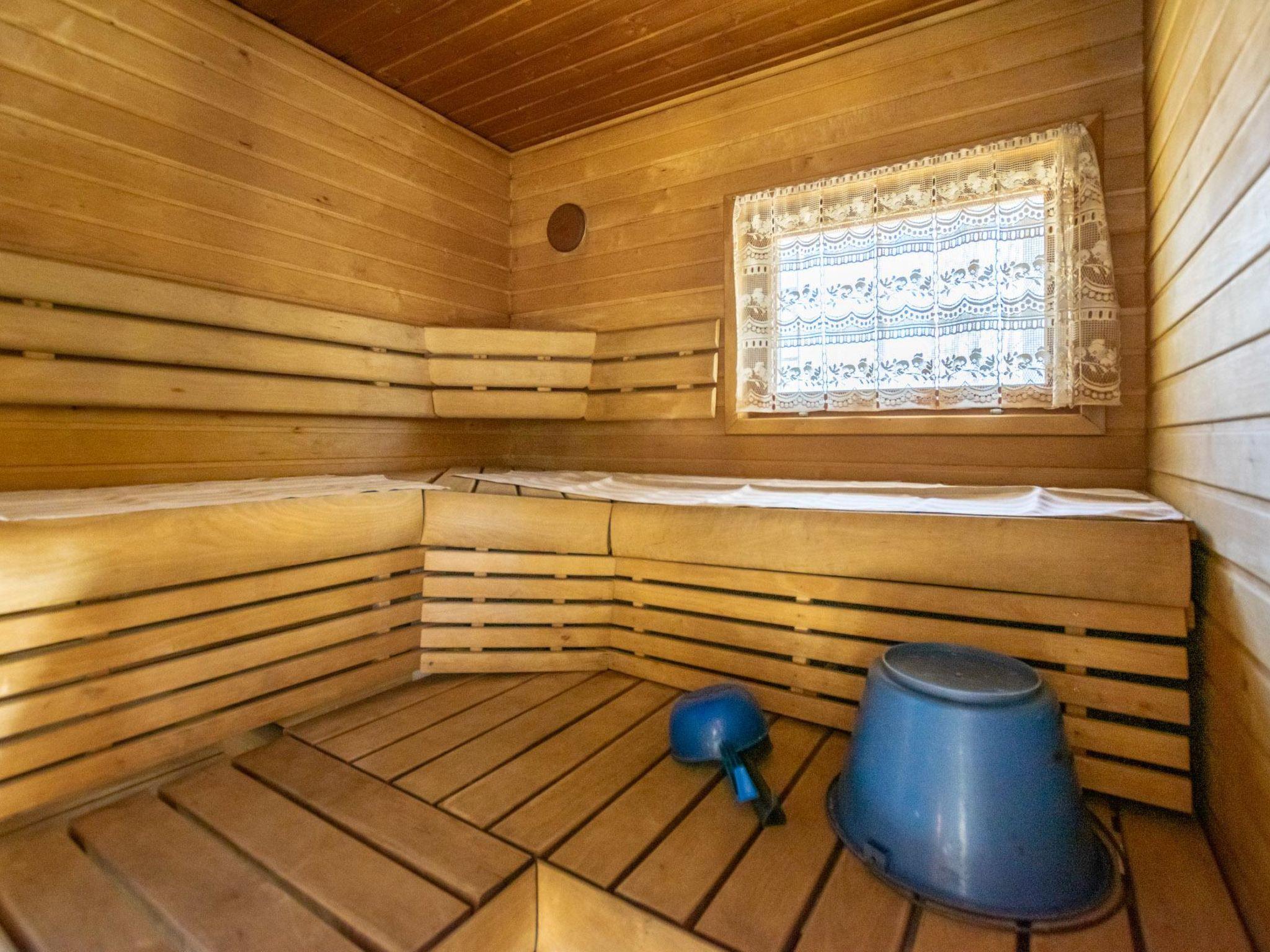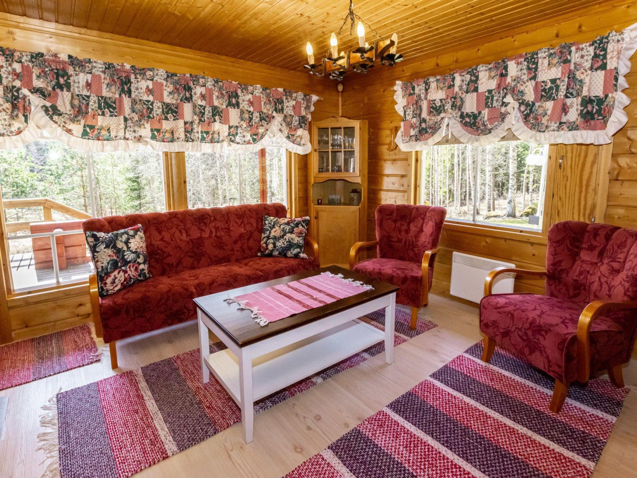 Log cabin 1996, living room/kitchen, a small bedroom with bunk bed. Upstairs double bed and two separate beds, washroom, sauna, open veranda. Entry to sauna, washroom and toilet through veranda.