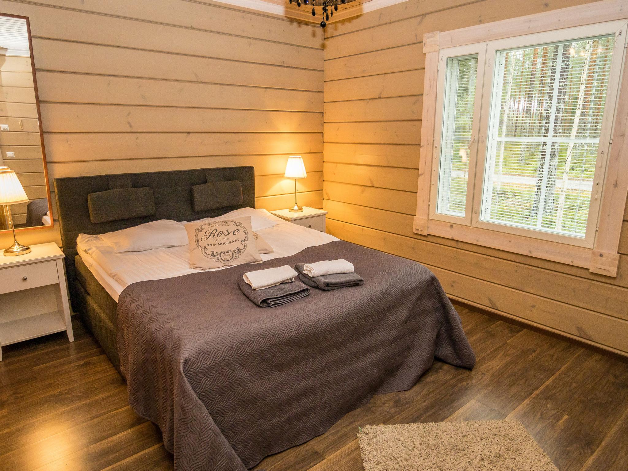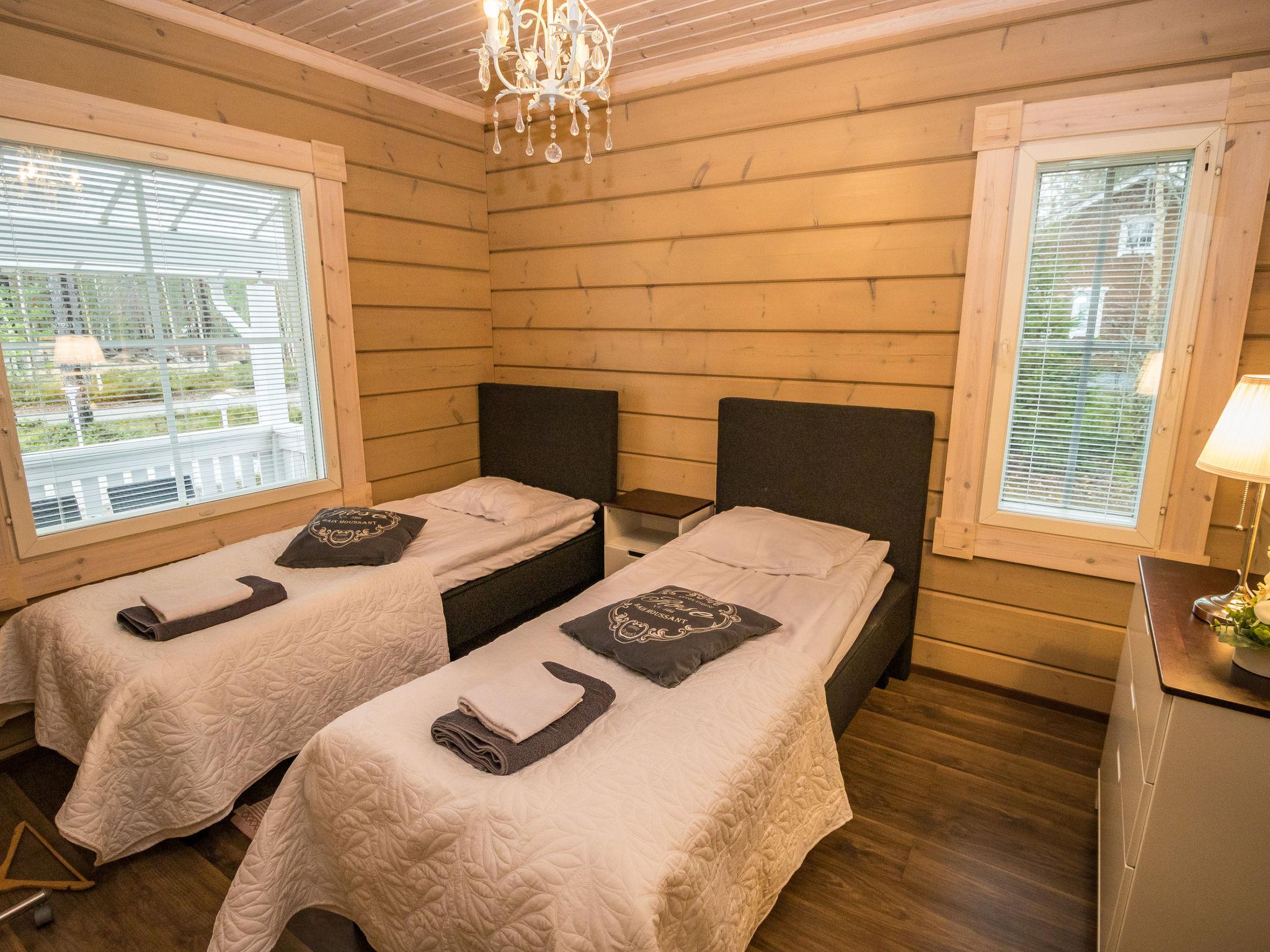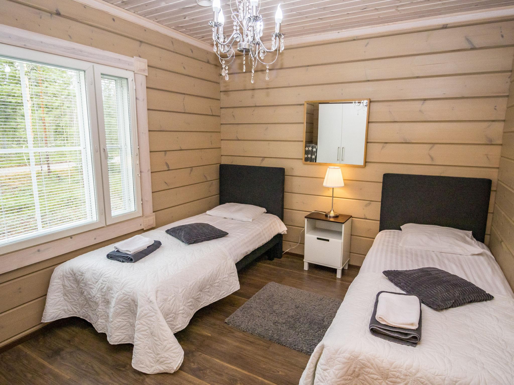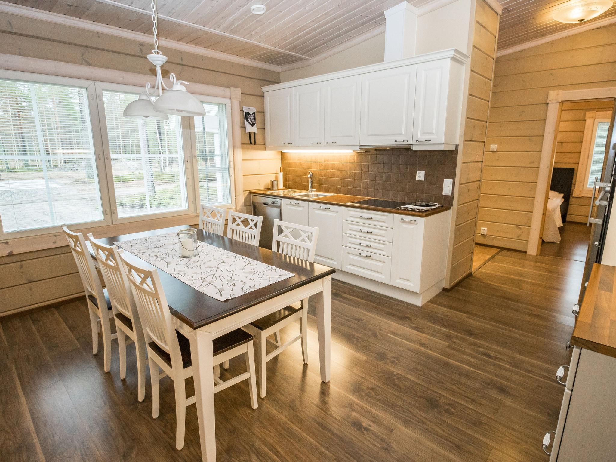 The cabin features three bedrooms: two with double beds and one with two separate 90 cm wide beds. The spacious kitchen is connected to the living room and the utility room, which has its own exterior door for cooling off after the sauna. From the utility room, there is access to the washroom with a shower and an electric sauna. The cabin also includes two separate WCs.