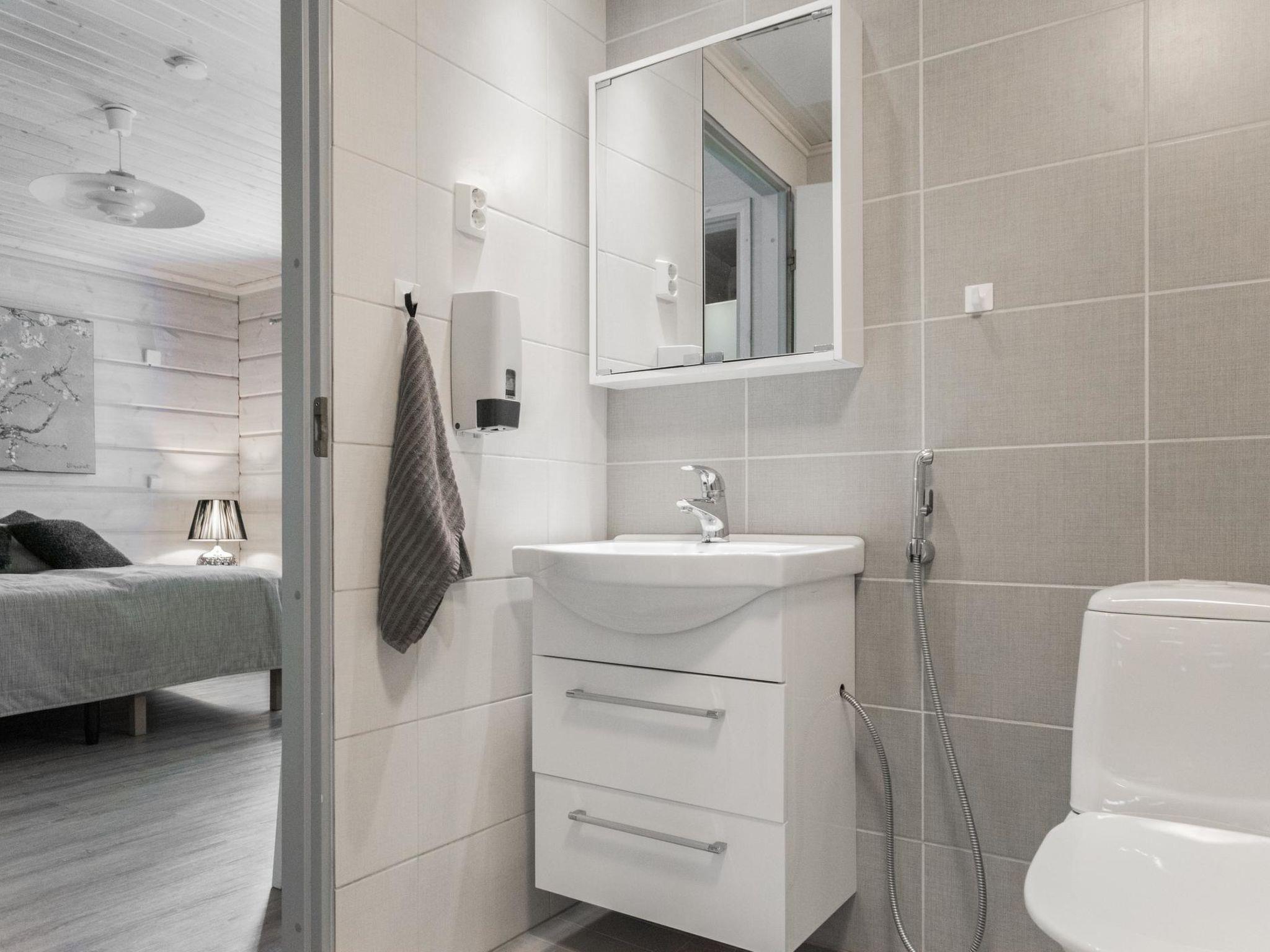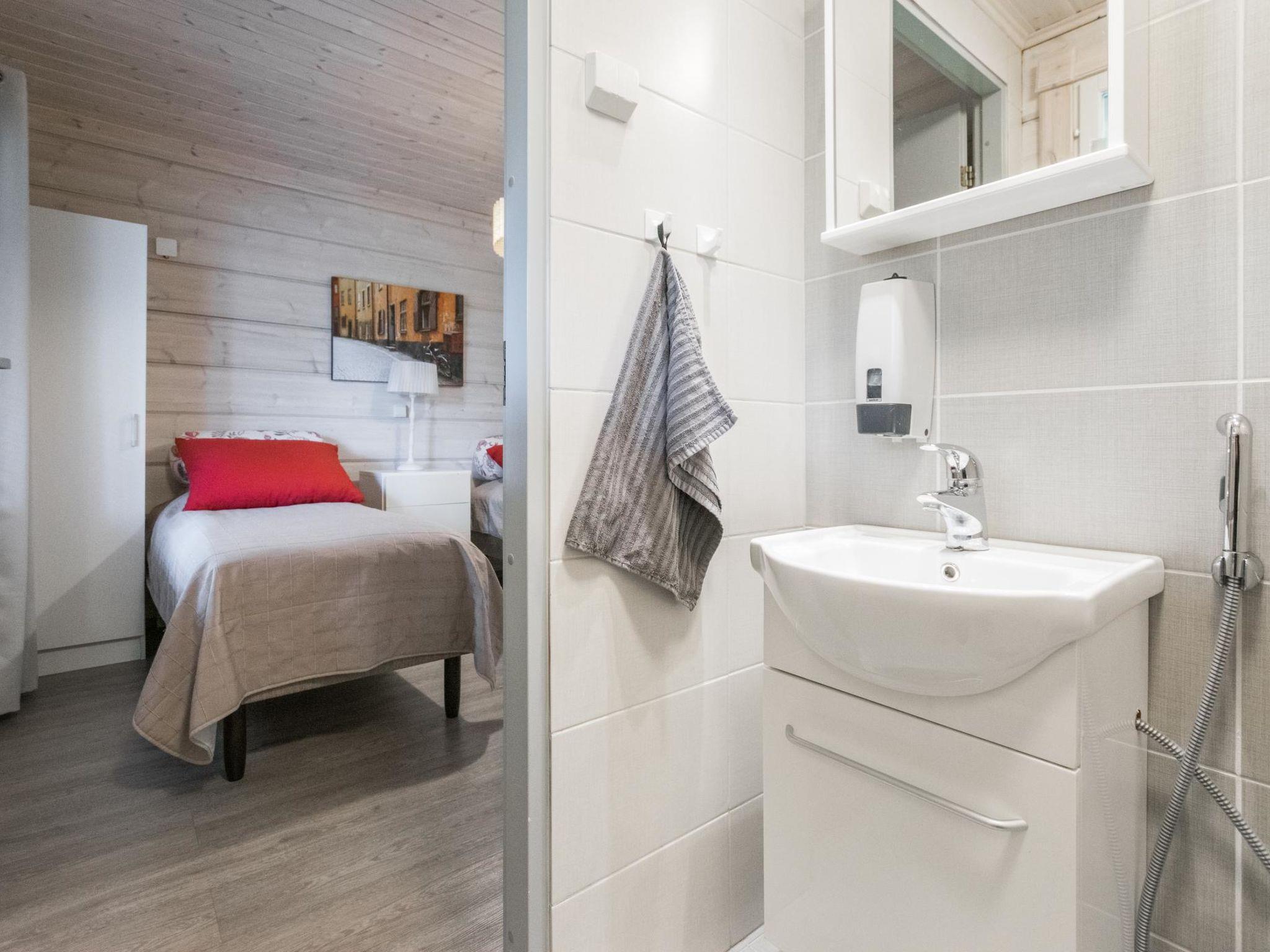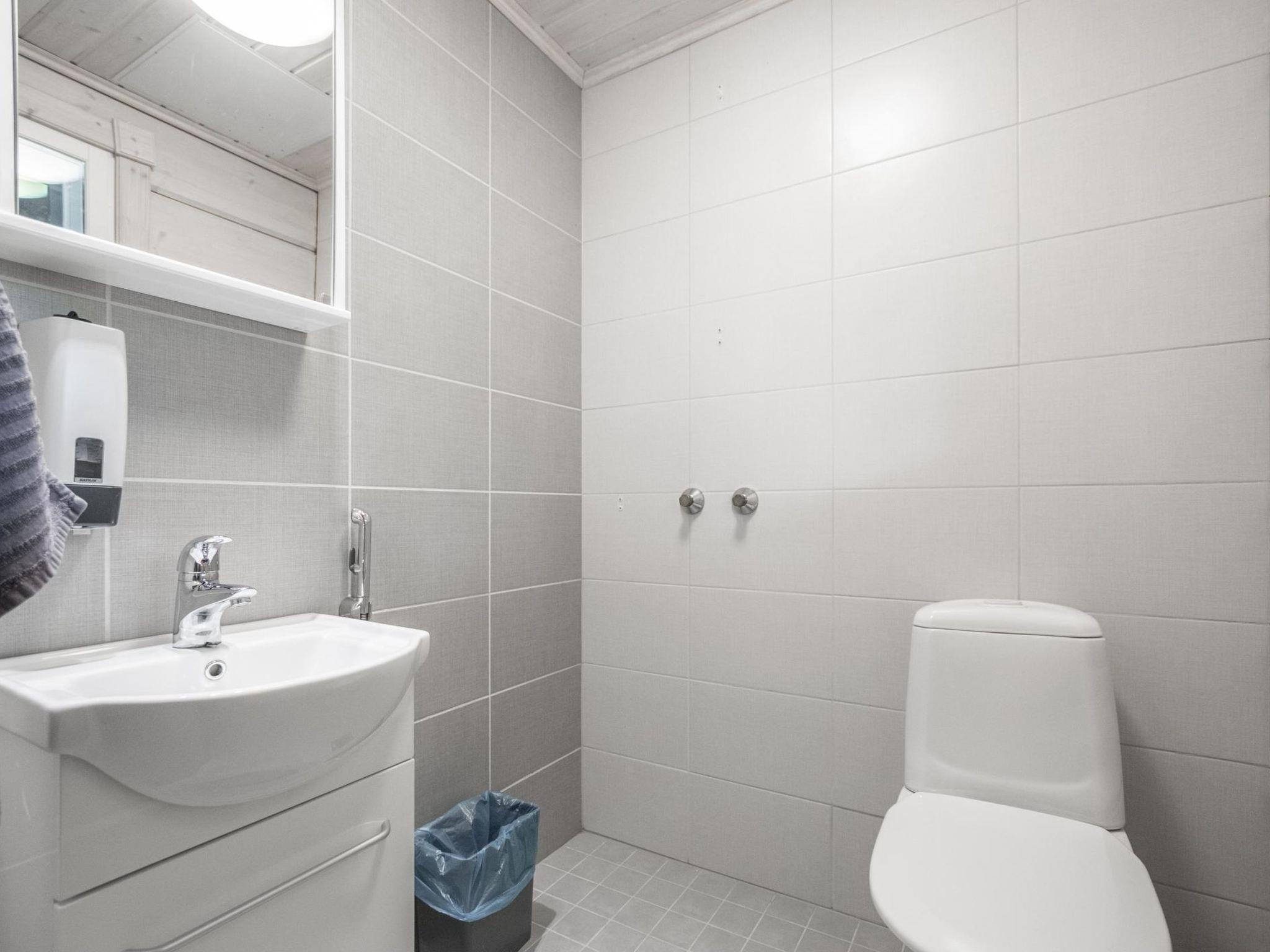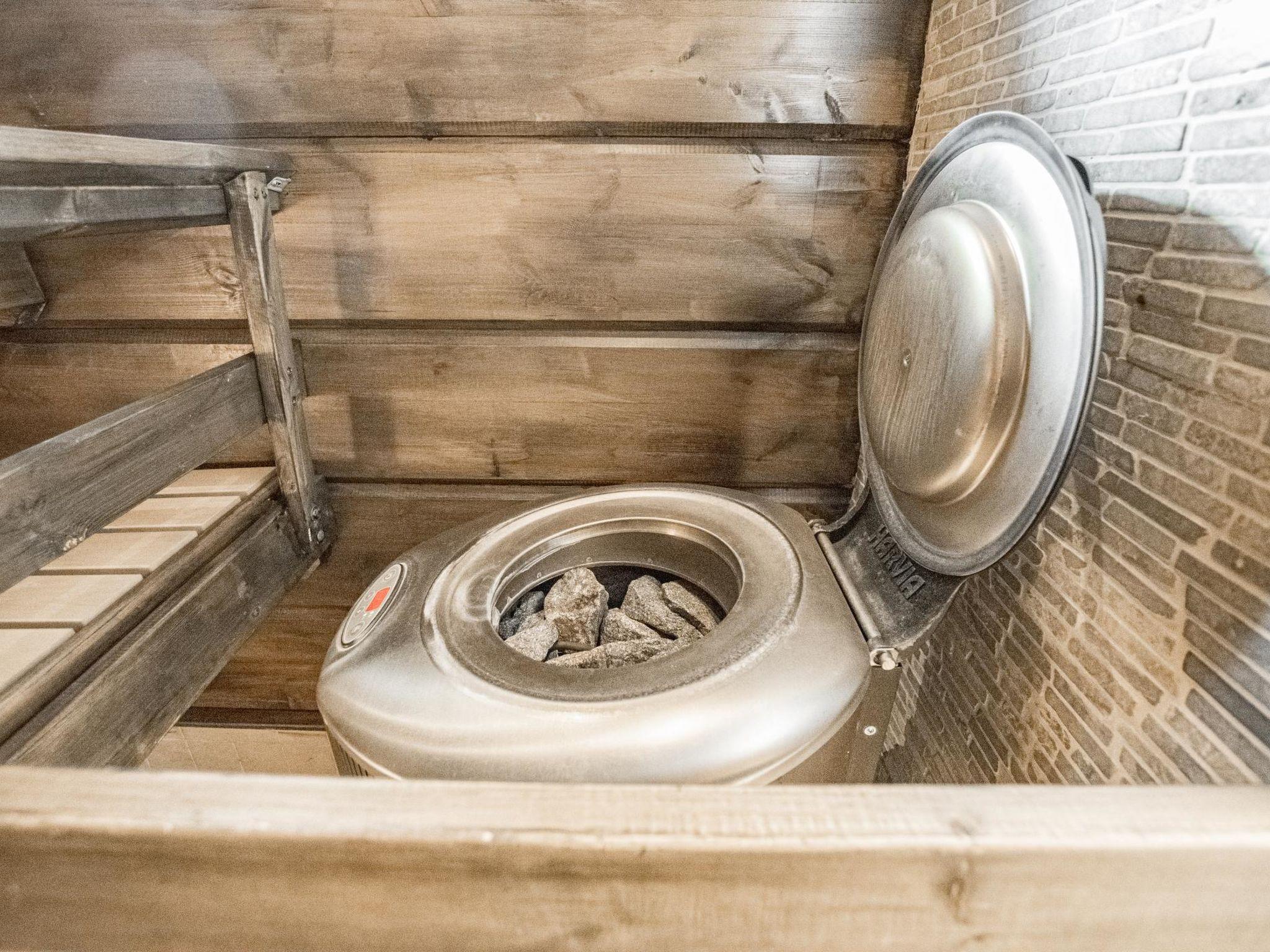 The cabin includes a bathroom and sauna equipped with an immediately ready electric sauna stove.