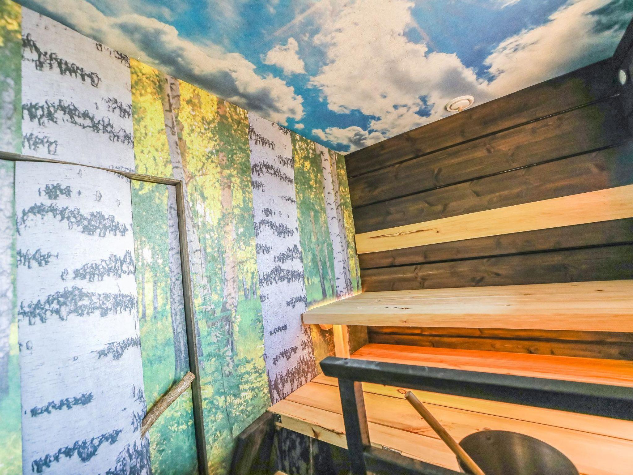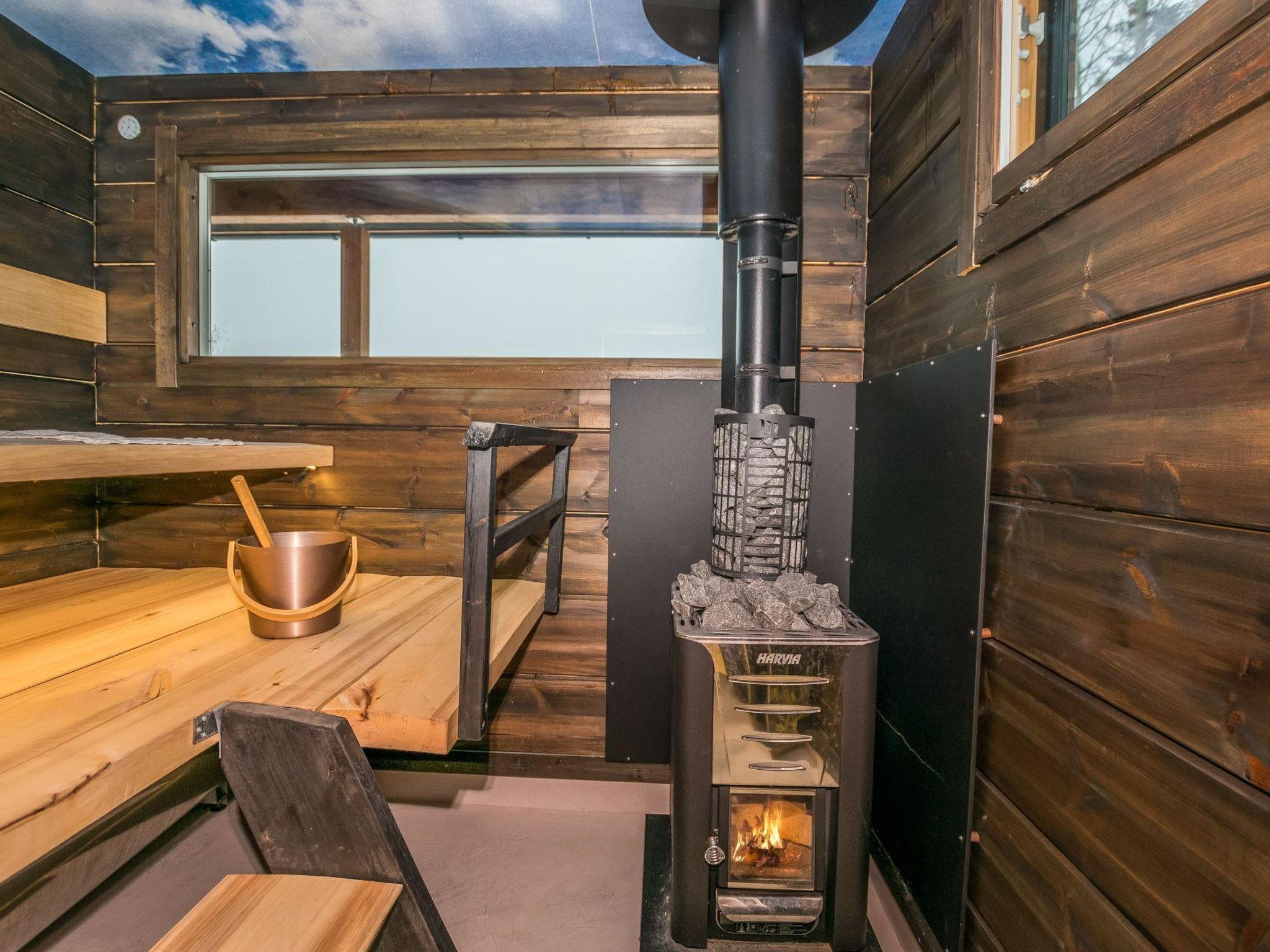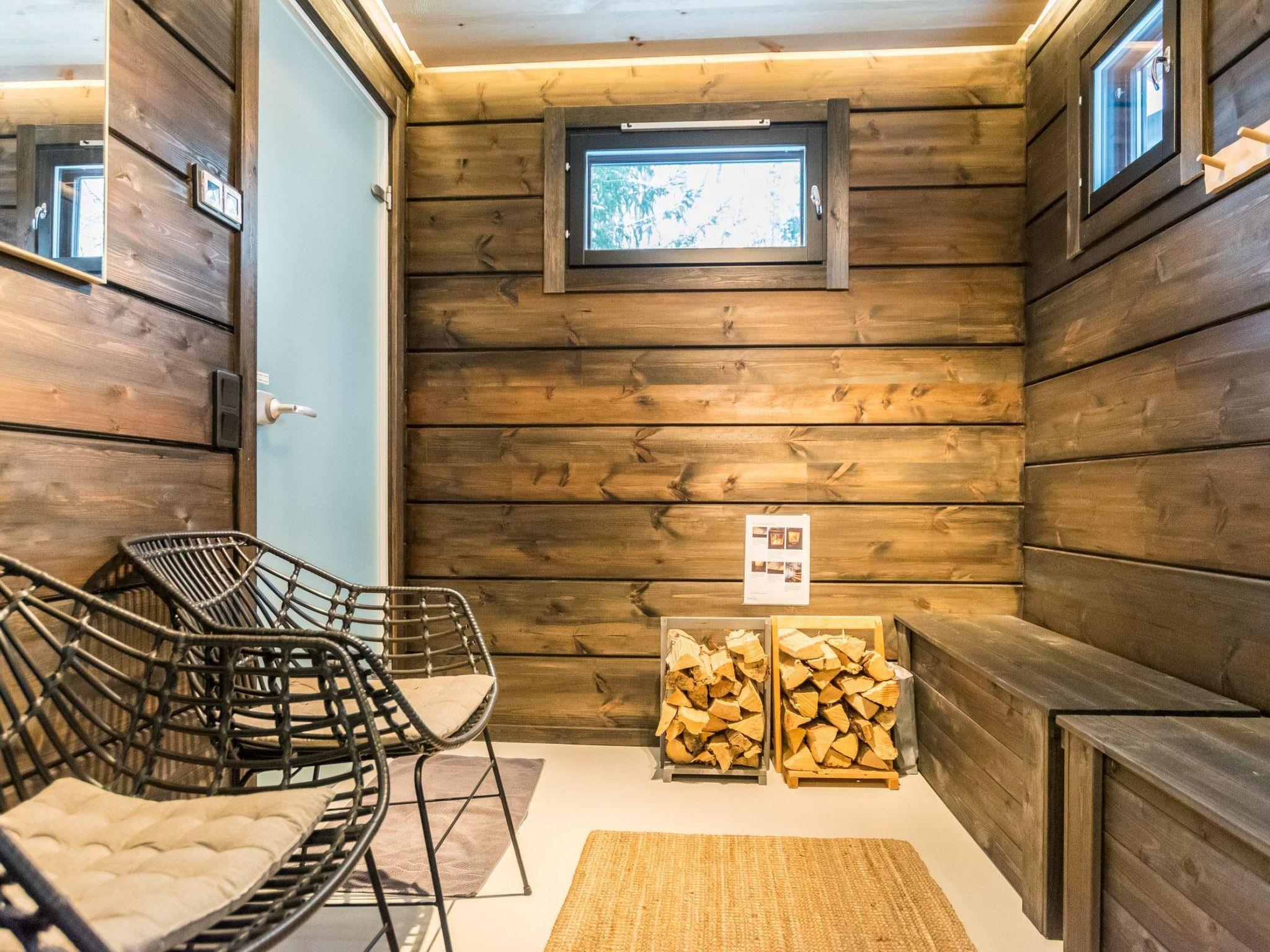 The sauna offers a unique experience with surfaces made from natural peat, creating a distinctive ambiance. The sauna area is separate from the main living space, allowing for late-night relaxation without disturbing those already asleep. It features a wood-heated sauna stove and a washroom with two showers. Between the sauna area and the main building, there is a cooling-off space with a glass-enclosed terrace, providing shelter from autumn winds and winter snow.