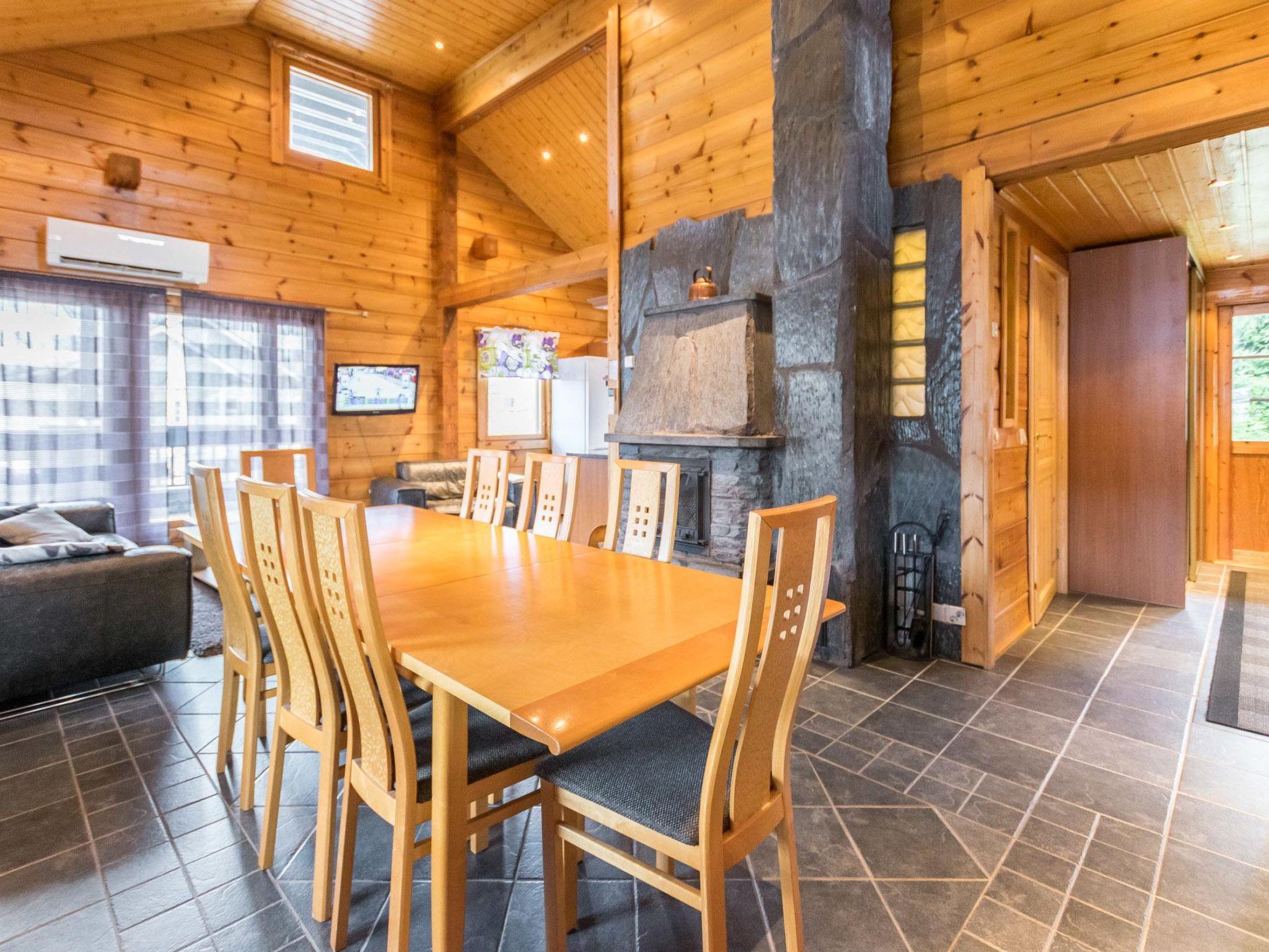 Downstairs there is a large combined living and dining area with a dining table for eight, kitchen, bedroom no 1 two beds, bedroom no 2 two beds, separate toilet with washing machine and tumble dryer, sauna, washroom with one toilet.