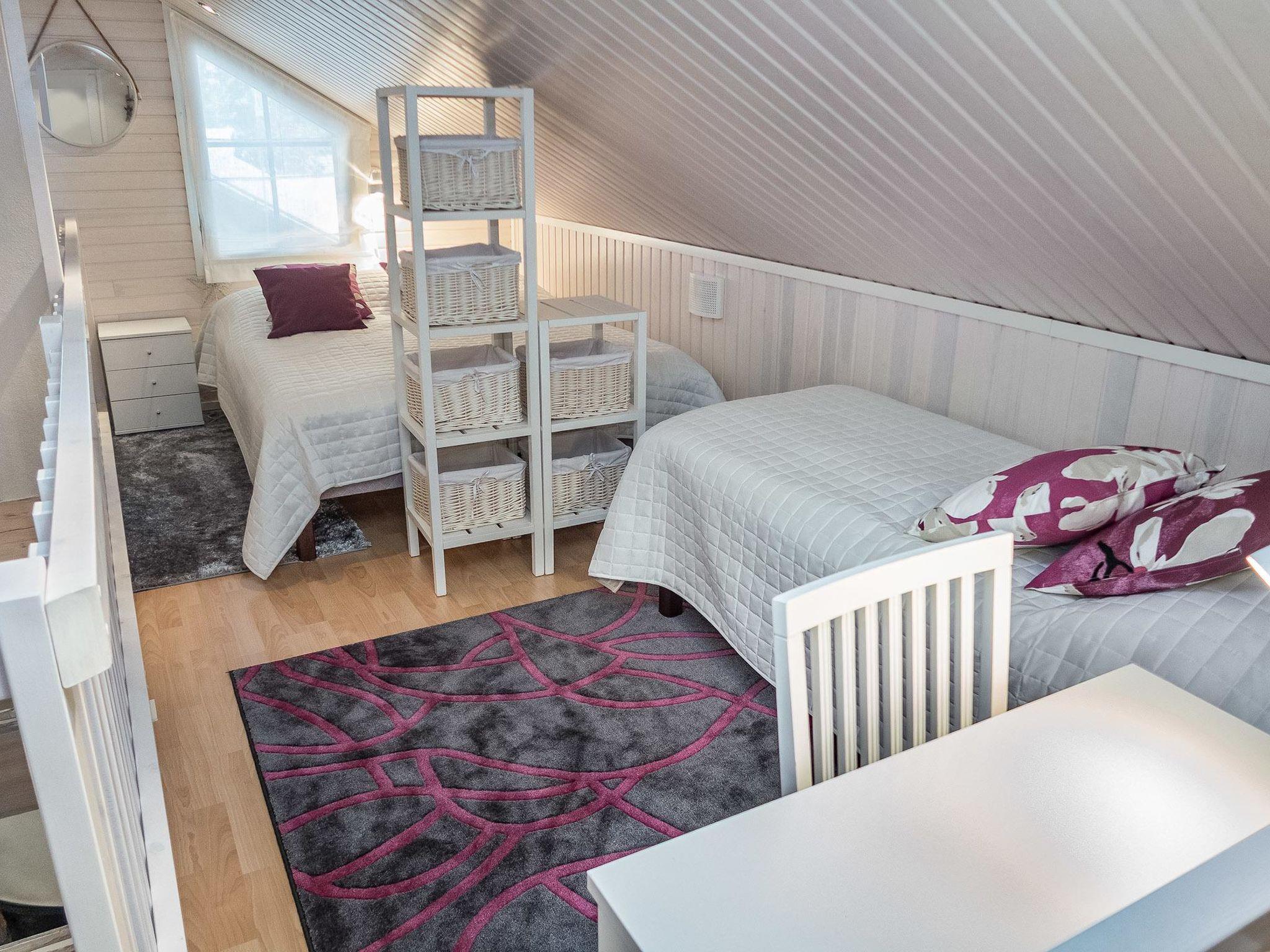 26 km to the north from Kuusamo, Ruka village (West-Ruka) 3 km, lake Kesäjärvi 200 m. Apartment in the log semidetached house, built in 2011. Bedroom 1: double bed, bedroom 2: 2 beds, loft: double bed + 2 beds. Living room/kitchen, electric sauna.