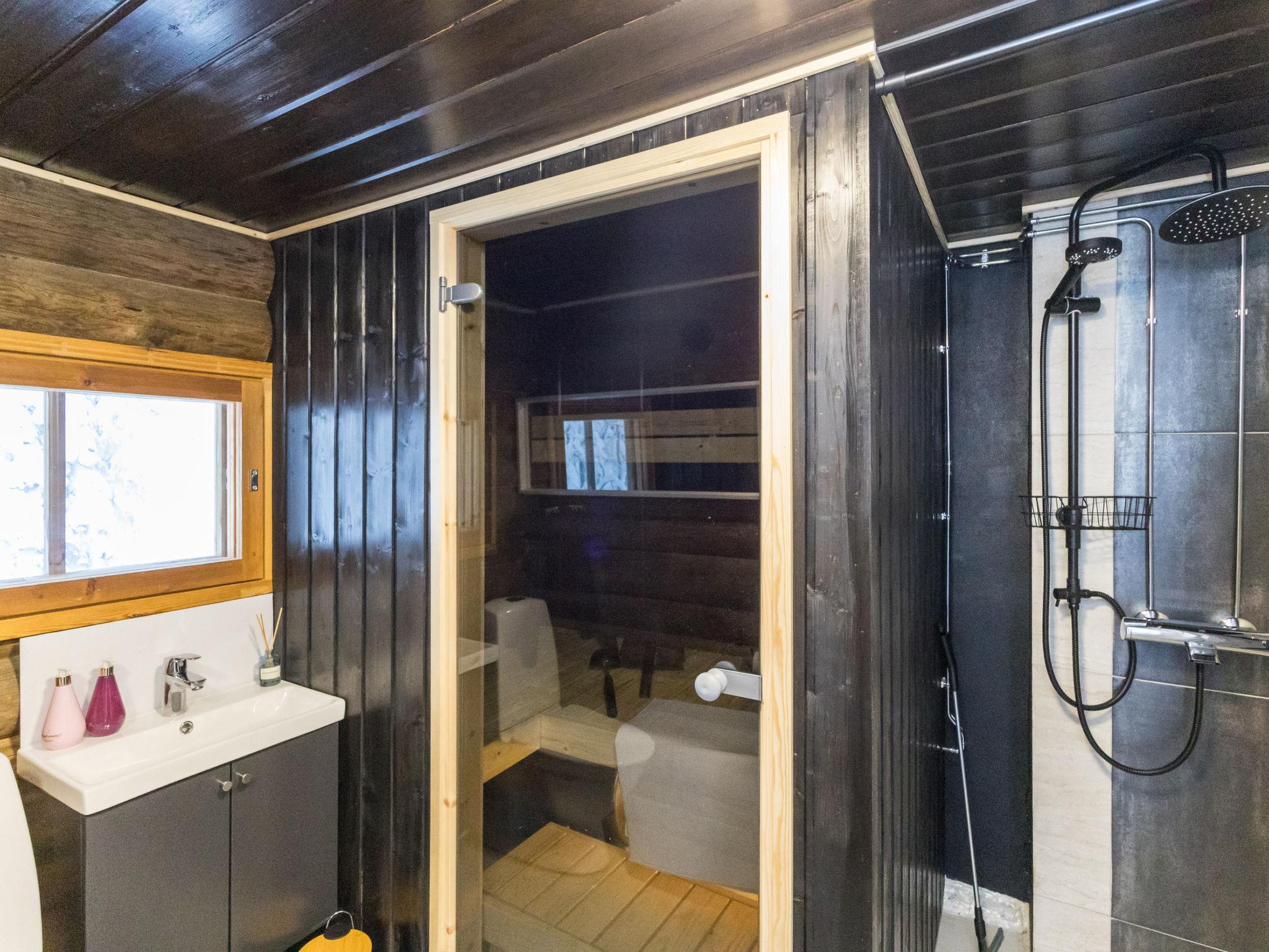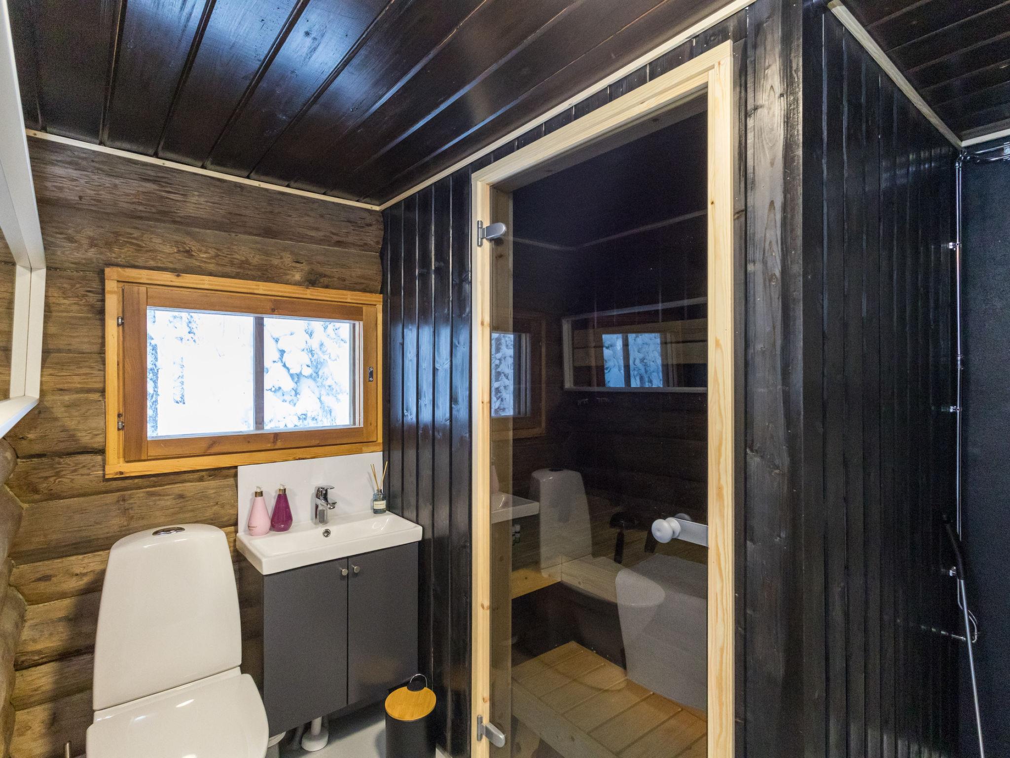The separate sleeping area features a 160 cm wide double bed. The washroom facilities, WC, and sauna are located in a separate section of the same building, accessible via an external door next to the main entrance.