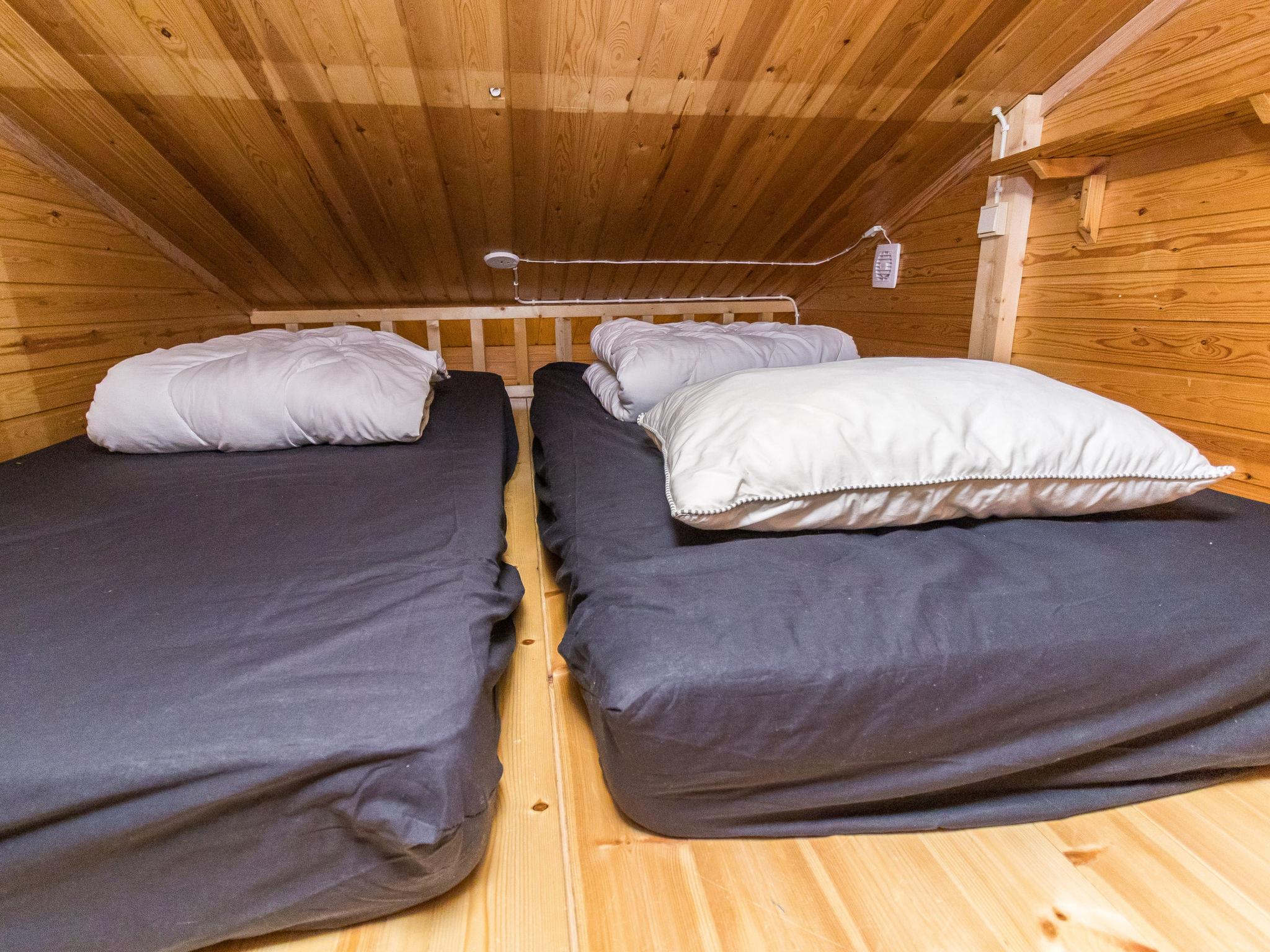 Mökissä on kaksi makuuhuonetta, joista toisessa on parisänky ja toisessa käytännöllinen kerrossänky. Lisäksi pienellä parvella on kaksi patjaa, joten majoittumaan mahtuu mukavasti jopa kuusi henkeä. Tilat sopivat erinomaisesti niin perheille kuin ystäväporukoille.