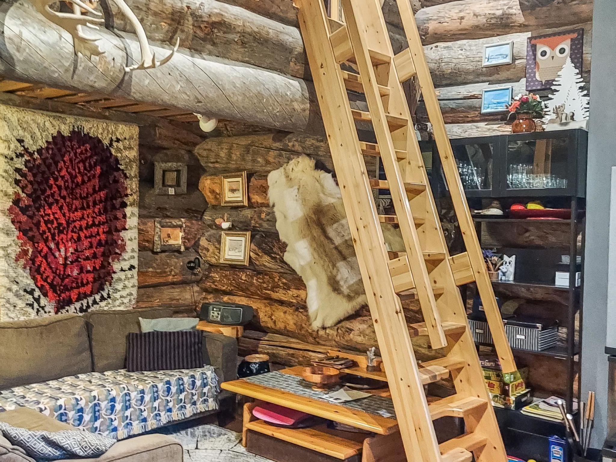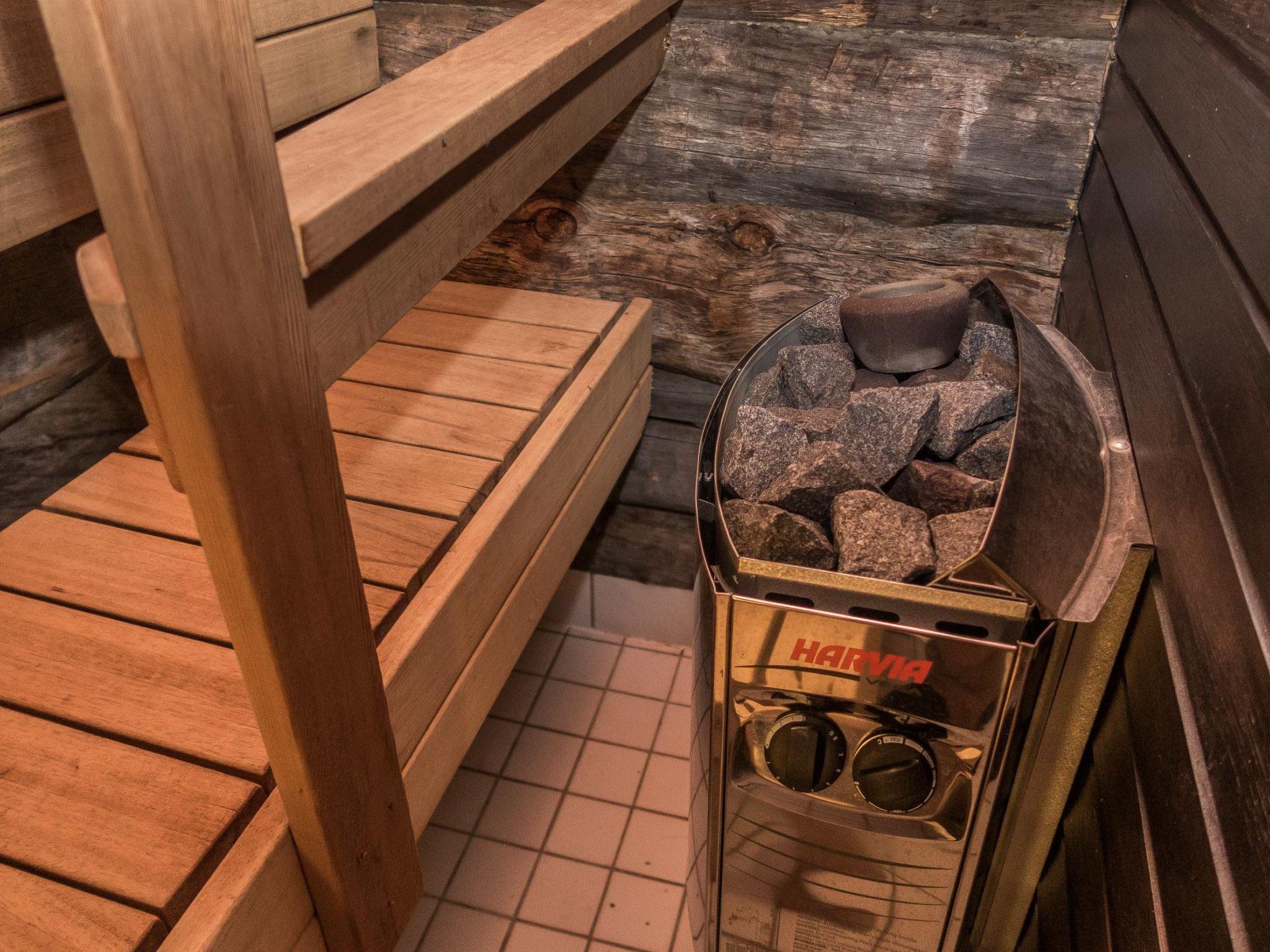 A kelo log cabin built in 1989: kitchen, living room, bedroom with a double bed (140 cm wide), low loft (13 m²) with a double bed and 2 additional mattresses for one, plus a travel cot for a child. Electric sauna, shower/WC.