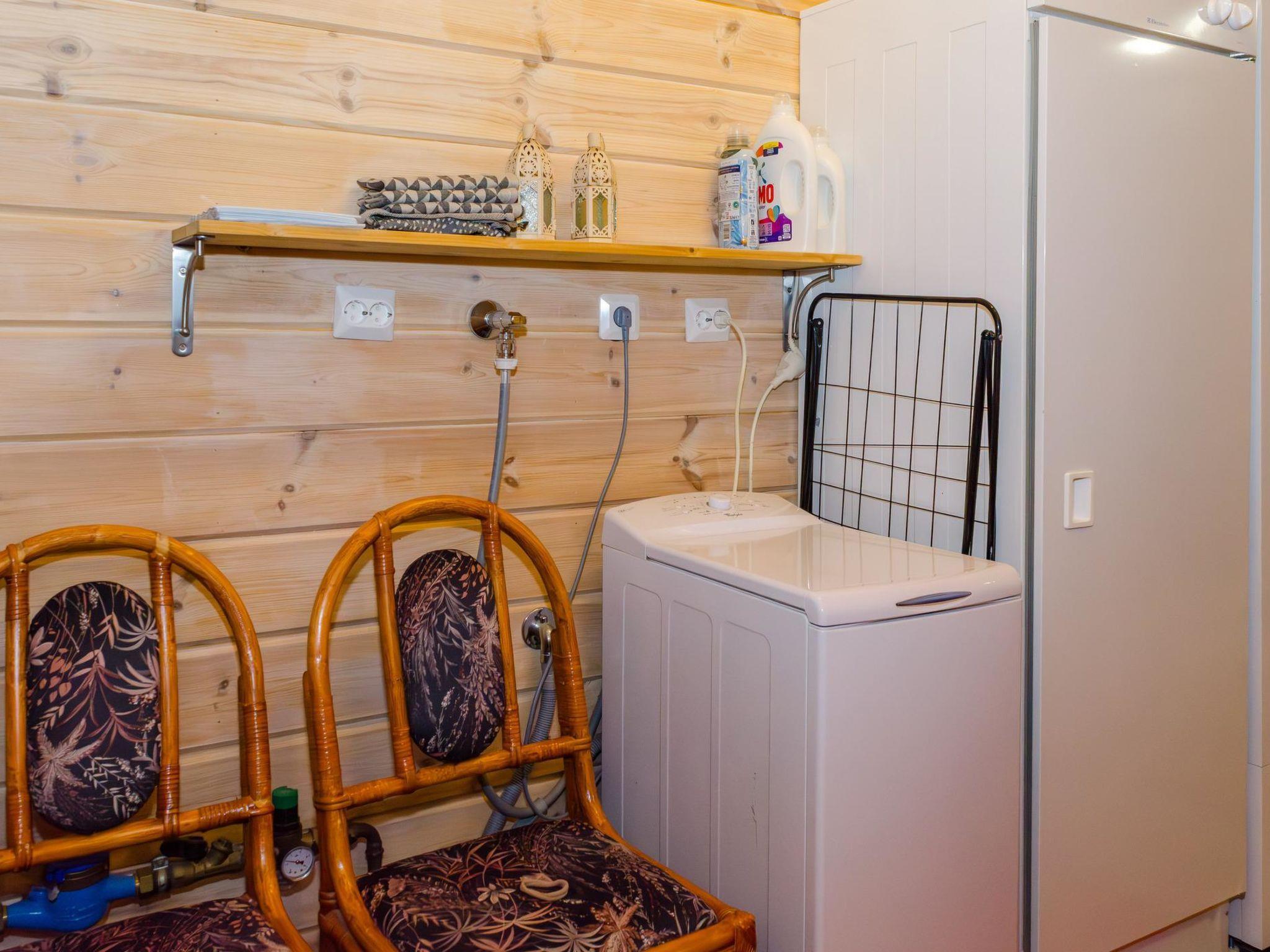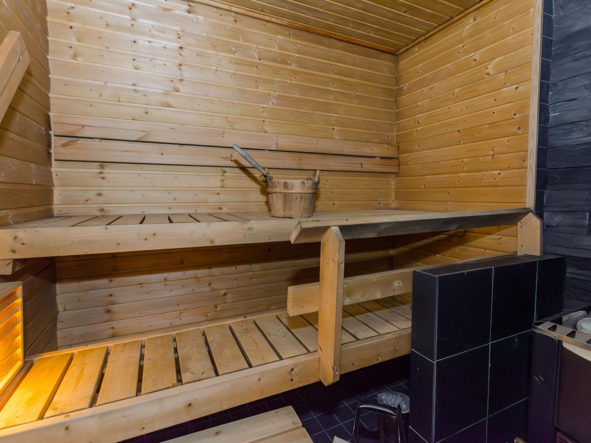 The log cabin, built in 2010, has an area of 98 m². The living room/kitchen features a sofa bed (134 cm wide) suitable for one person, a bedroom with two adjustable motorized beds (combined width 180 cm), and a second bedroom with two single beds. The cabin also includes a dressing room, a washroom, a wood-heated sauna, and a separate WC. There is a terrace at one end of the cabin, and a smaller terrace for cooling off after the sauna.