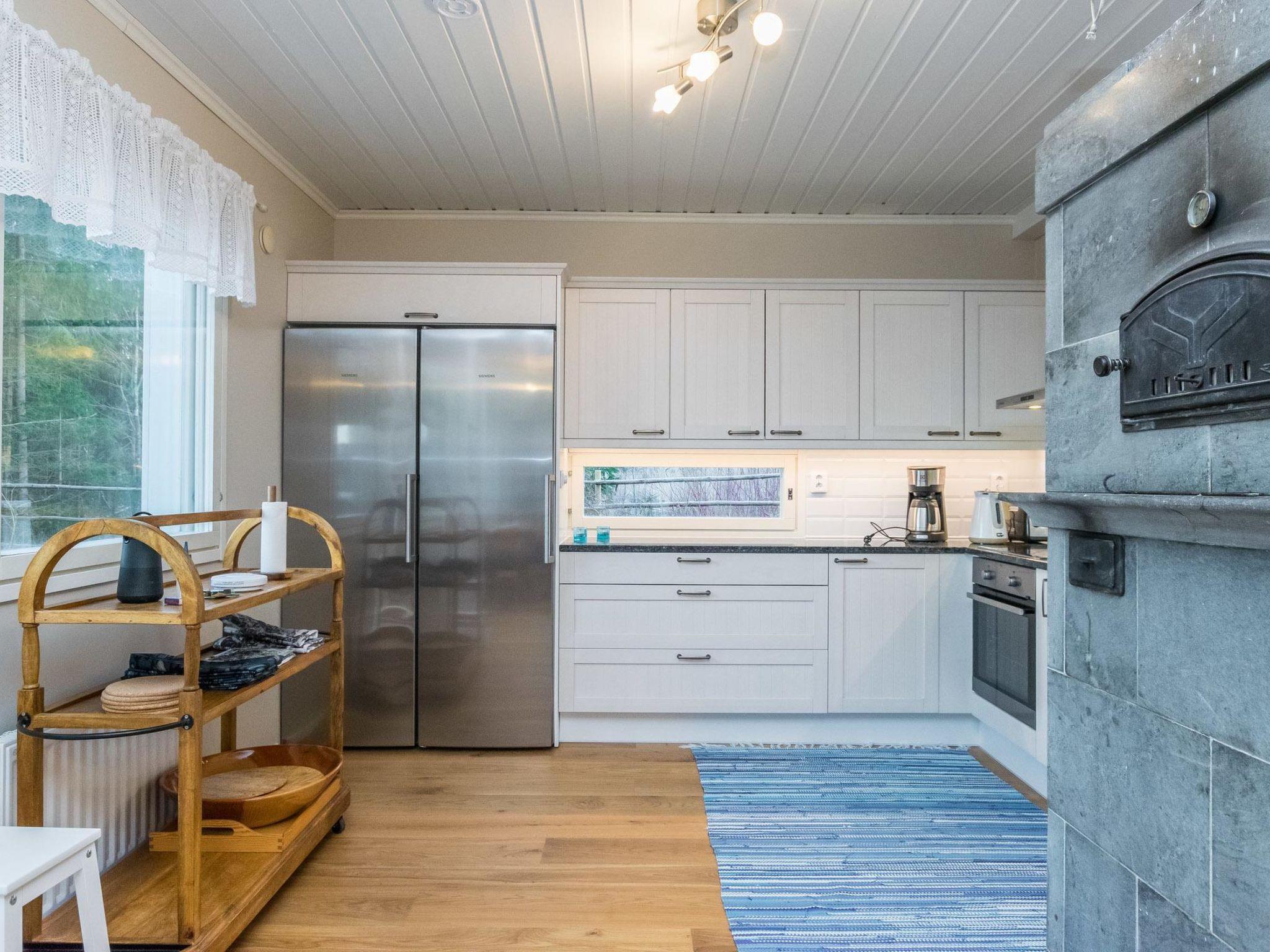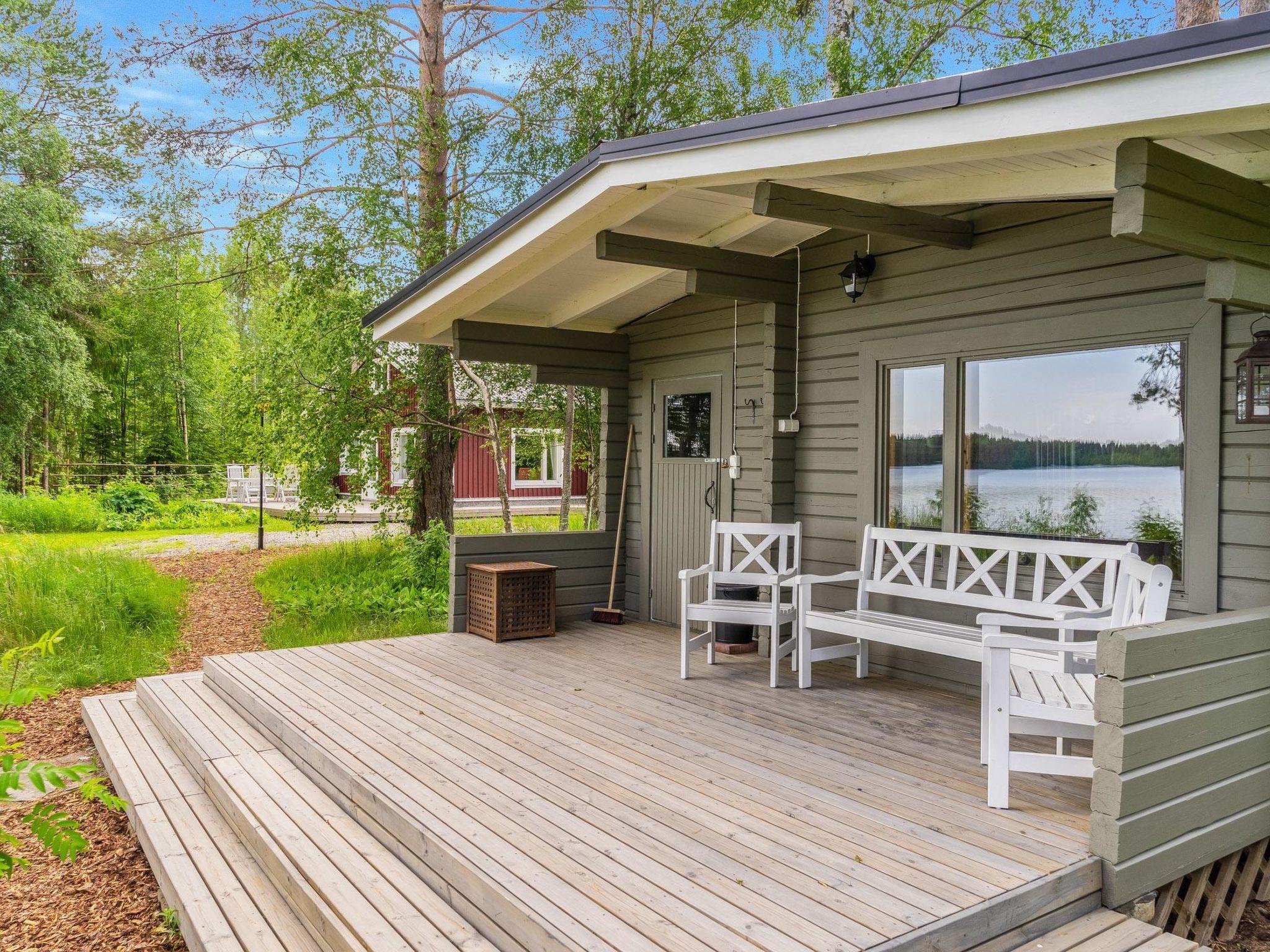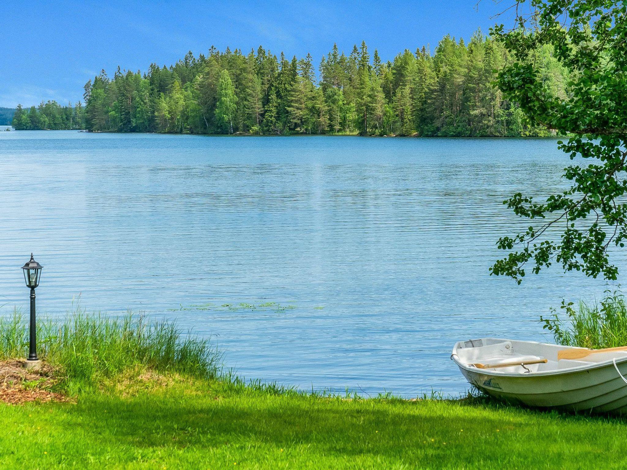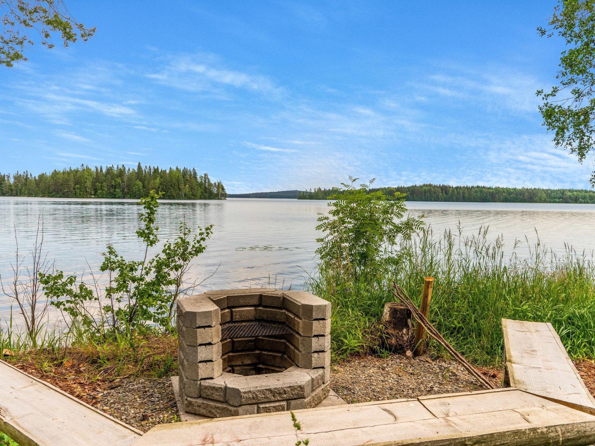 Lakeside sauna with wood-burning sauna stove and dressing room. Garage. Air source heat pump.