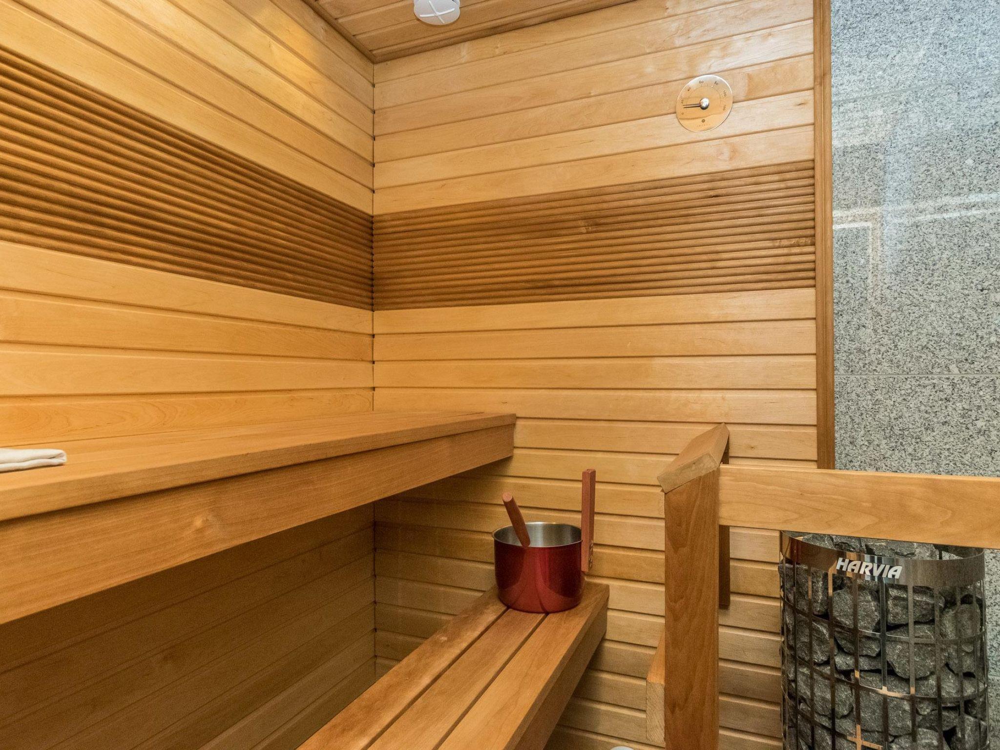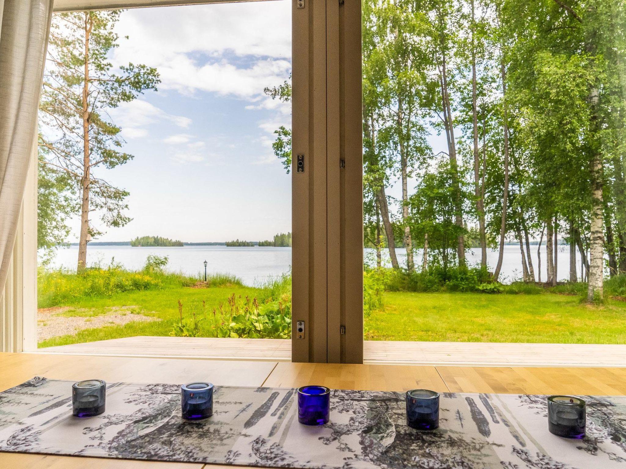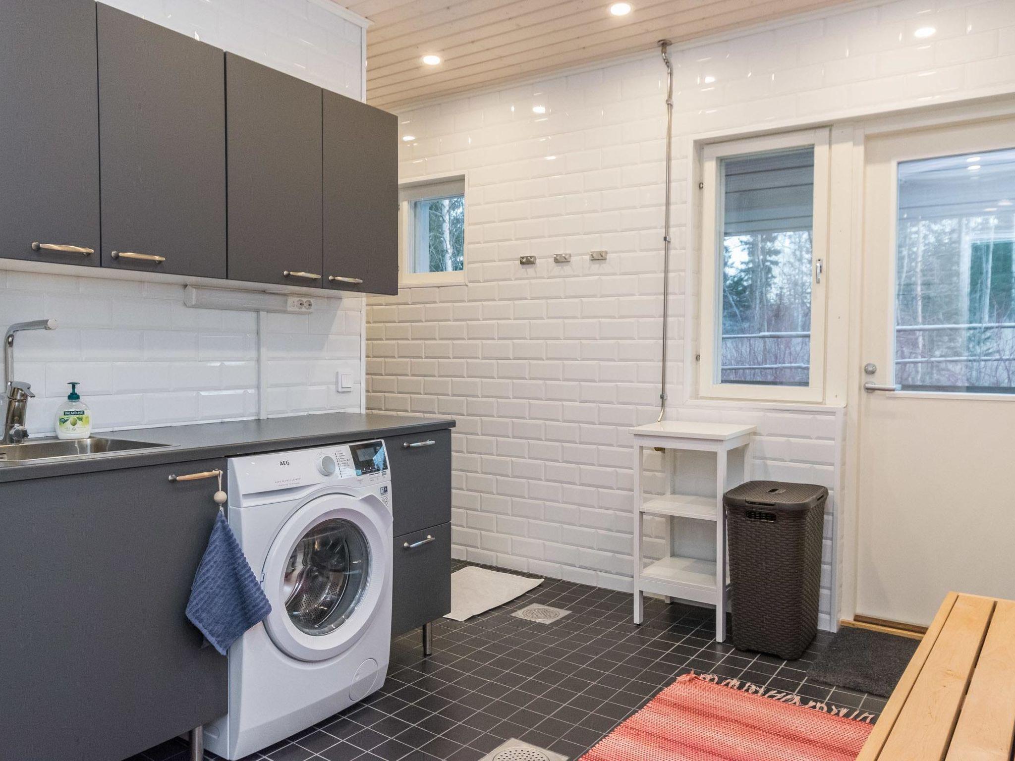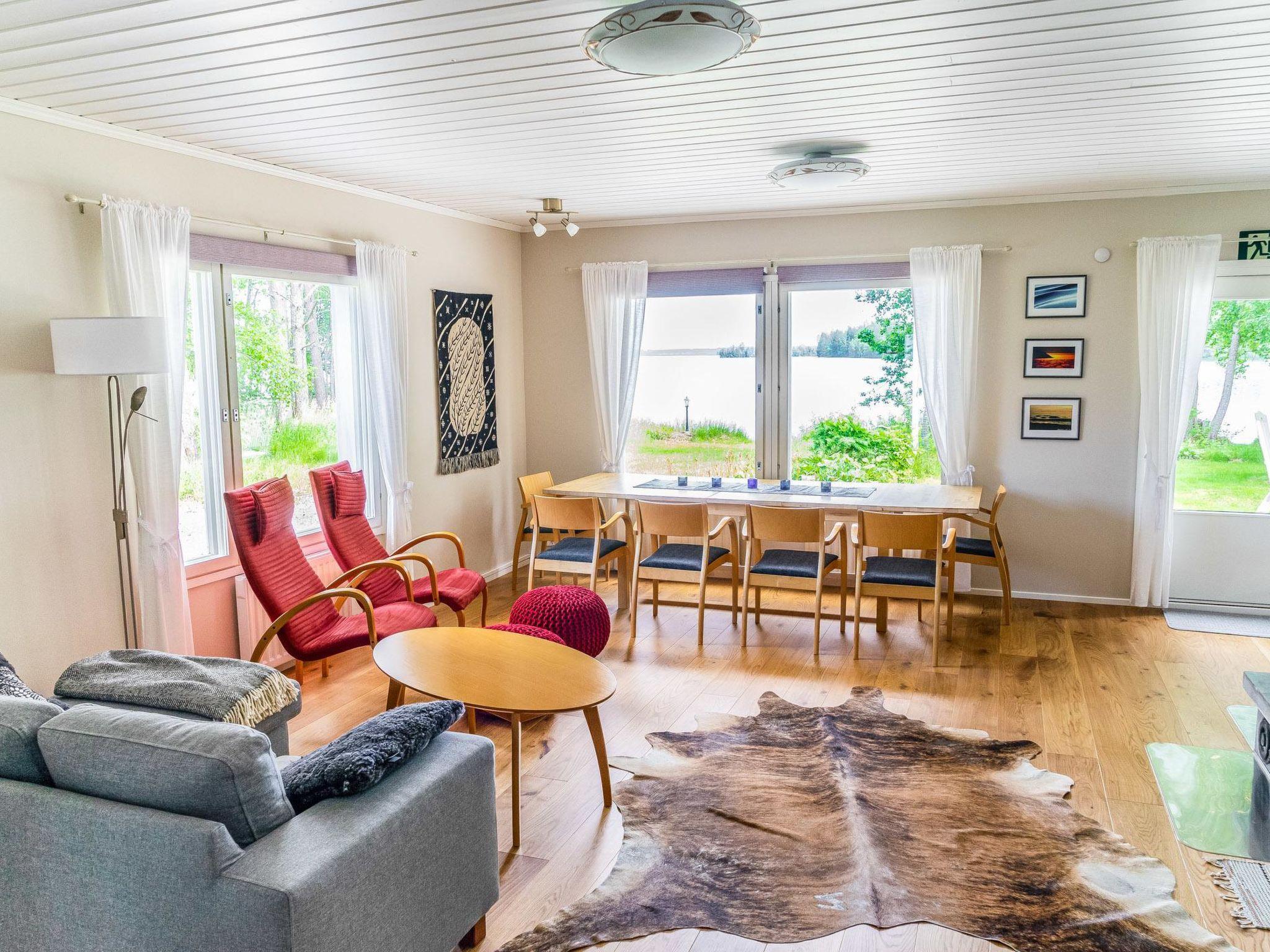 Lakeside sauna with wood-burning sauna stove and dressing room. Garage. Air source heat pump.