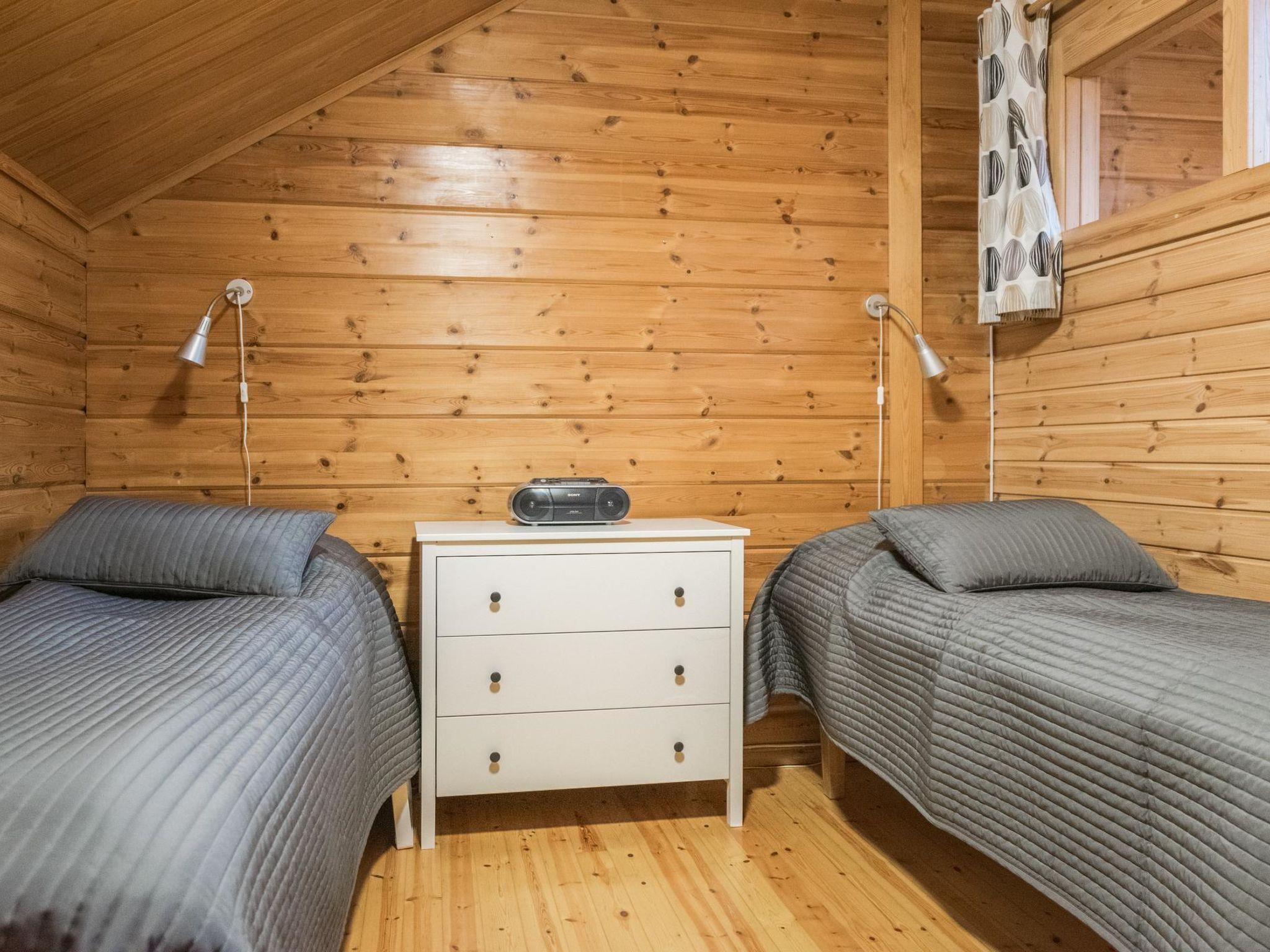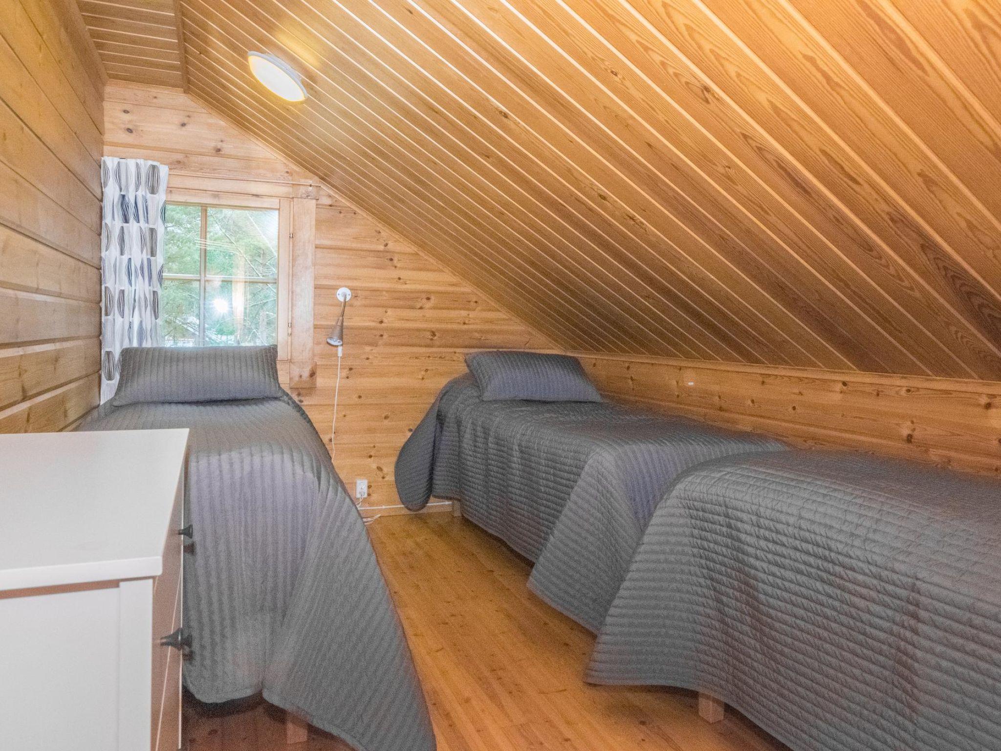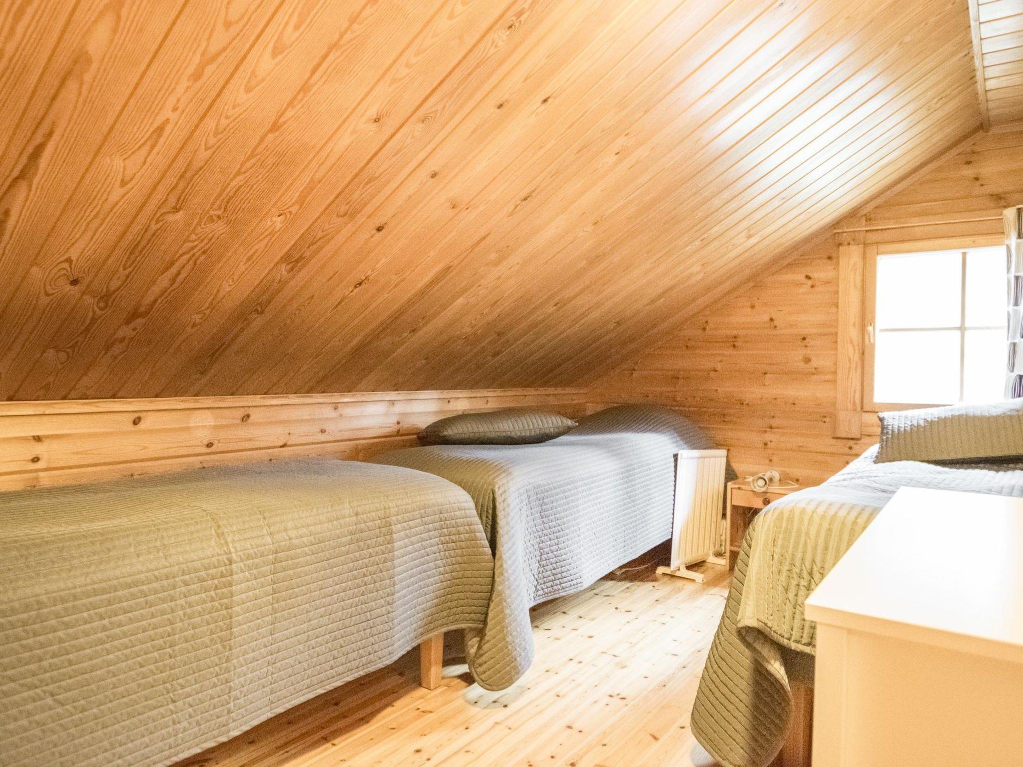 On the ground floor, two bedrooms, each with three beds. On the upper floor, three bedrooms. Upper floor bedroom 1: 2 beds, Bedroom 2: 3 beds, Bedroom 3: 3 beds. Additionally, one bed in the upper floor hall. The cabin has a total of 15 beds.