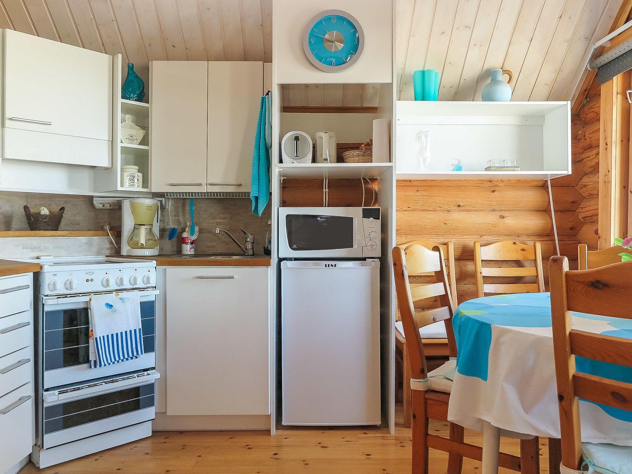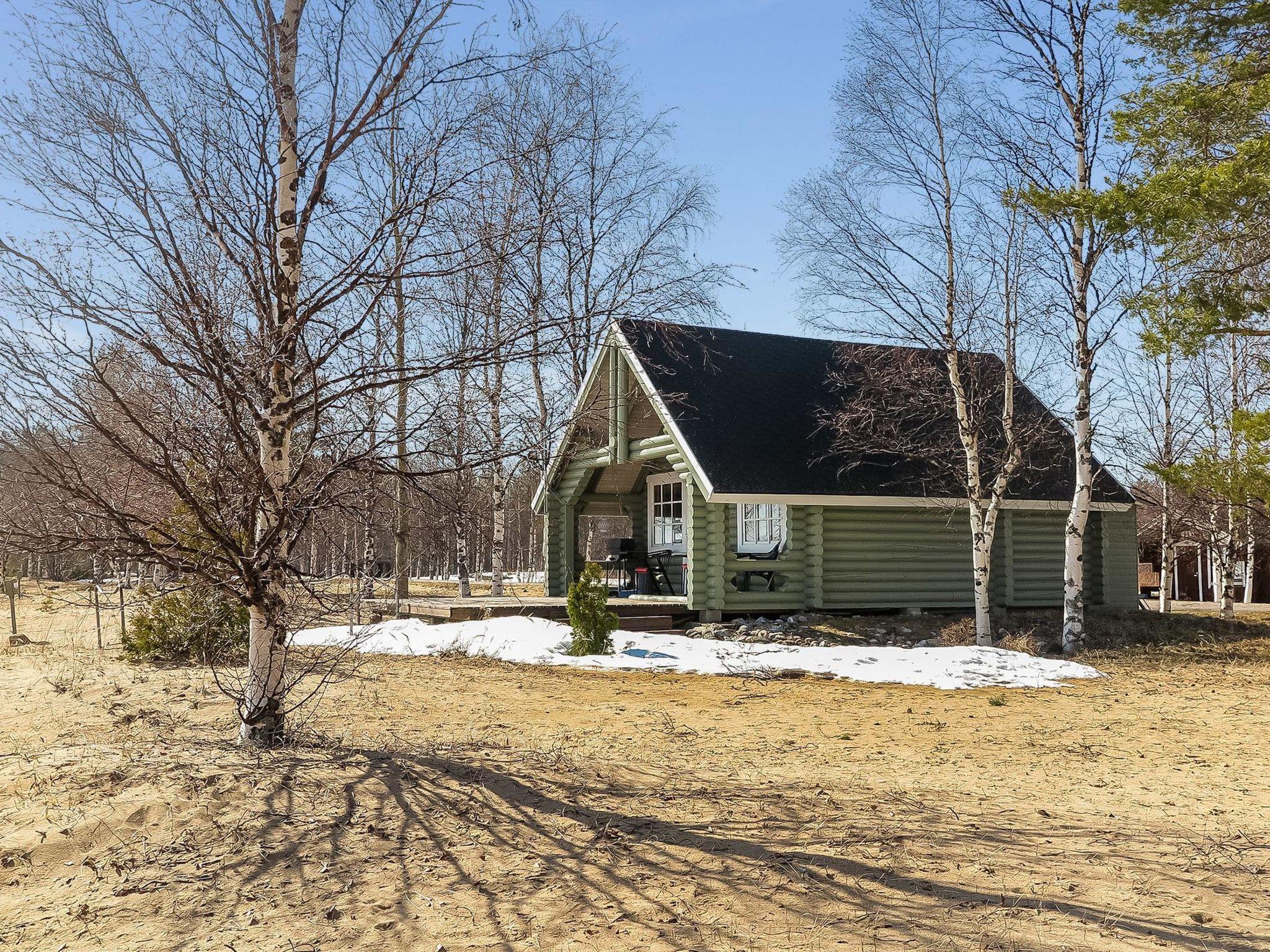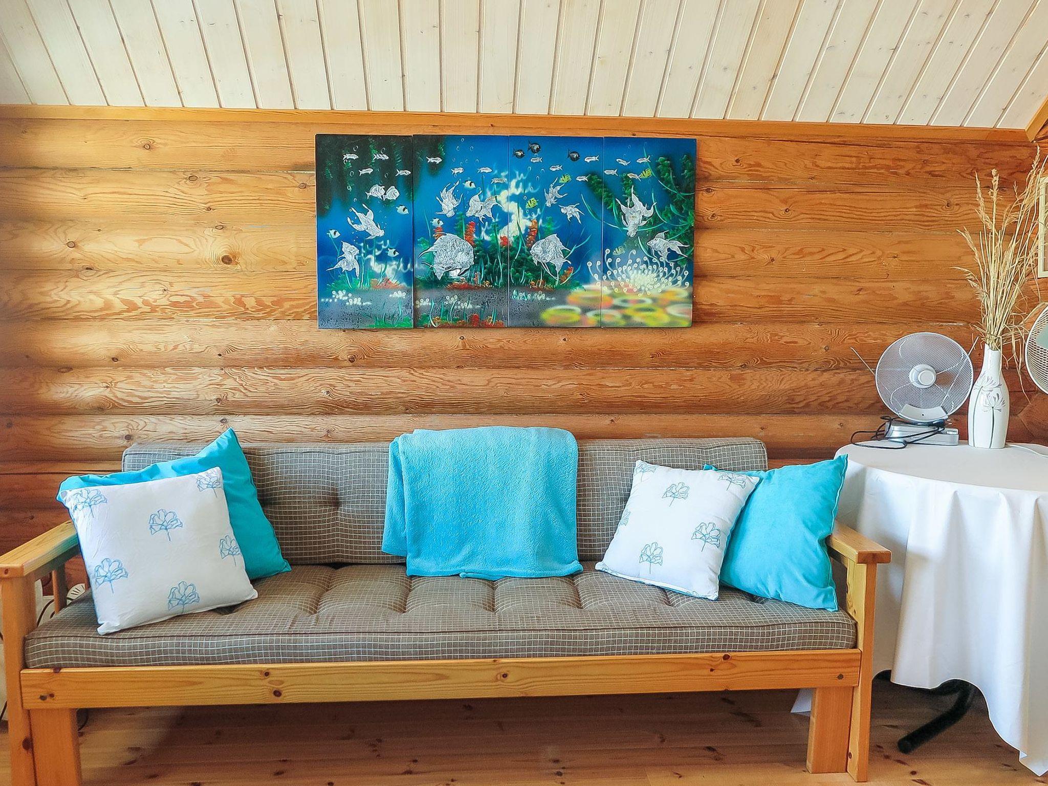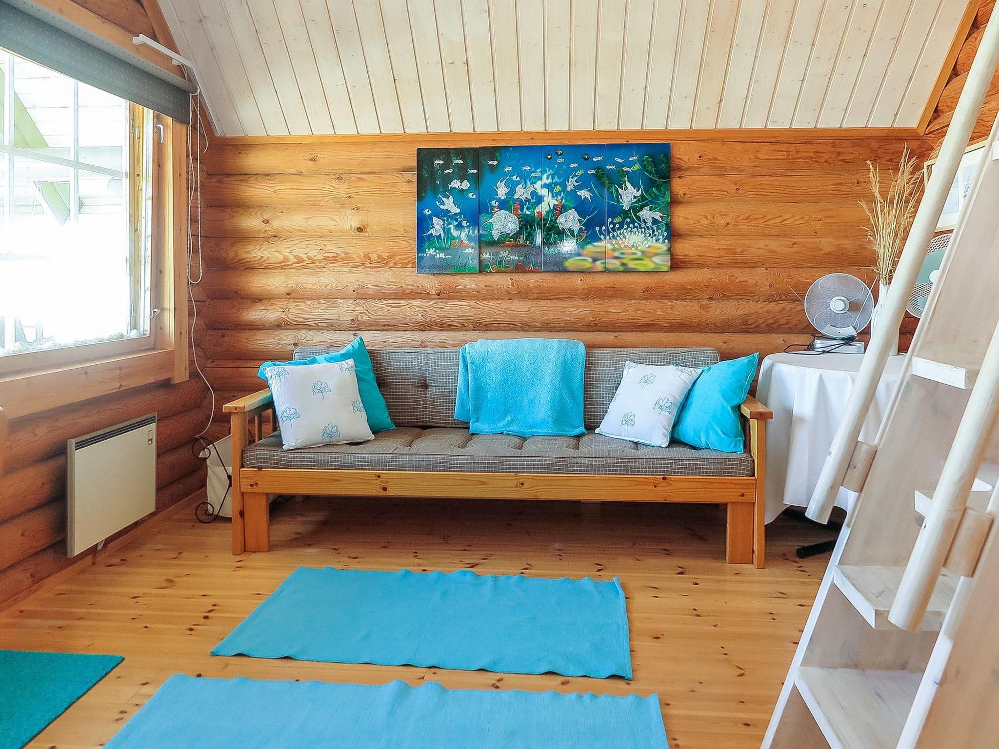 Round log cabin, built in 2011. Living room/kitchen with spreadable sofa, bedroom with double bed (width 140 cm), low loft with 3 mattresses, steep stairs lead to the loft, sauna, washroom/WC and partially covered terrace.