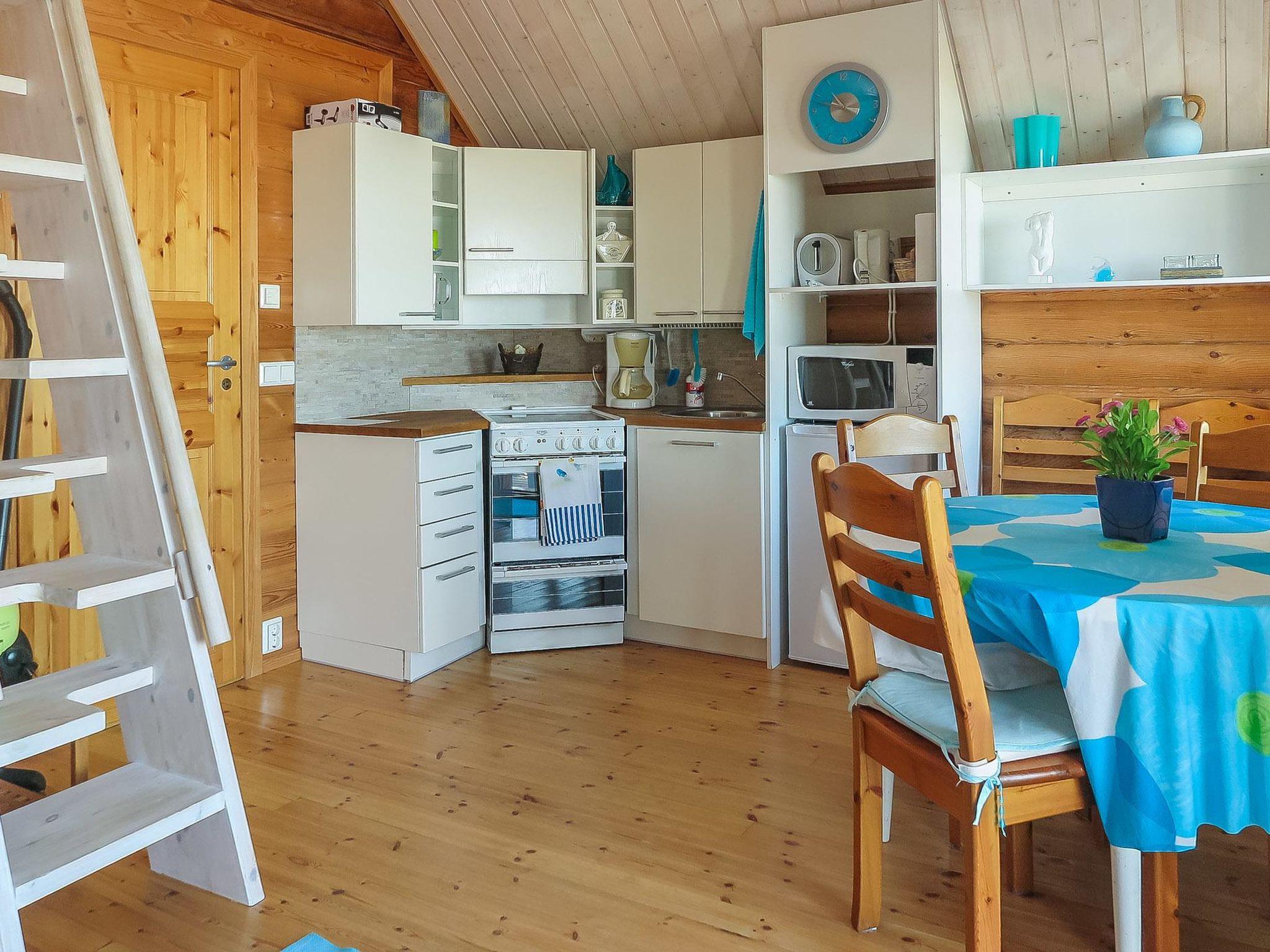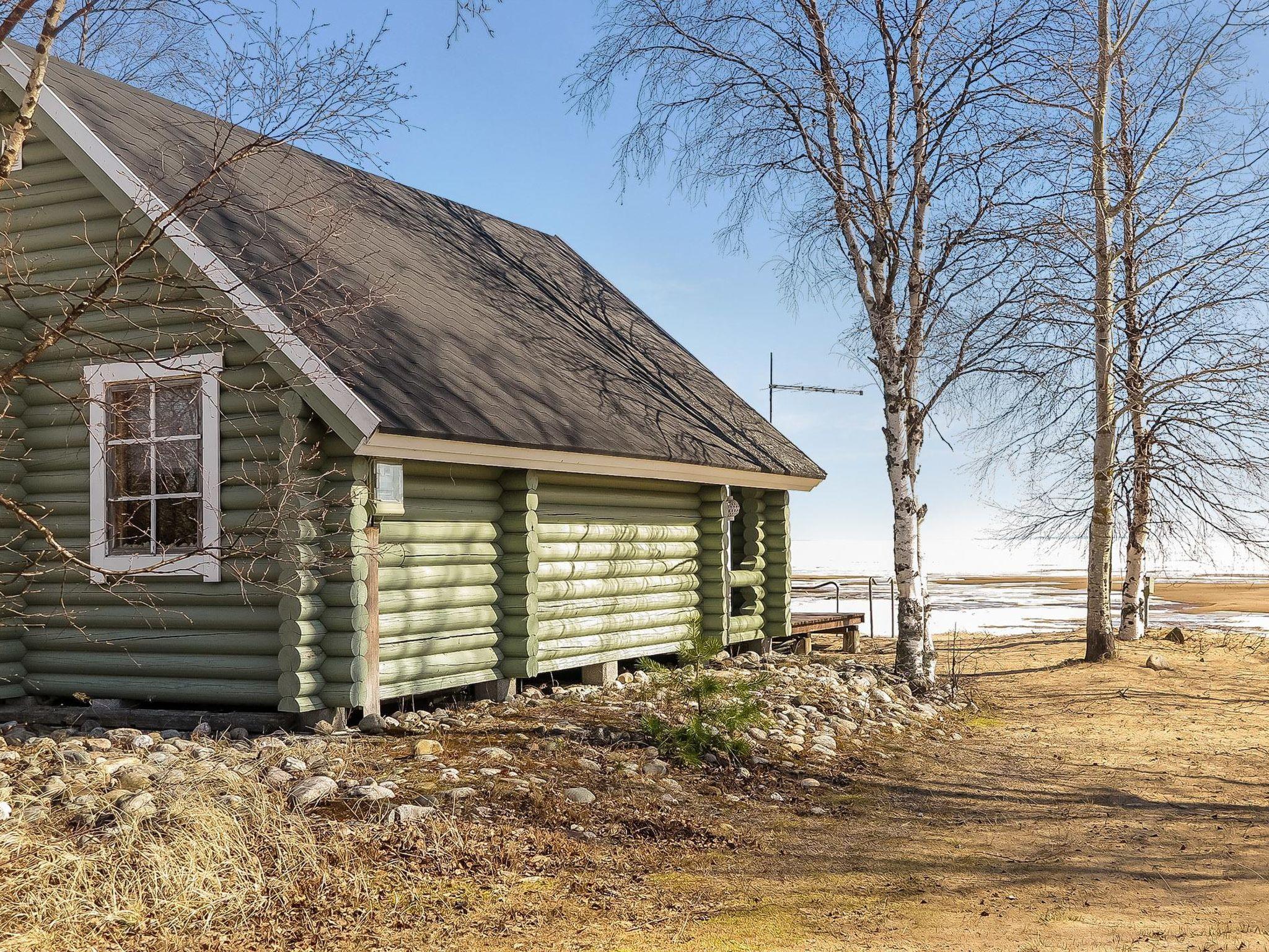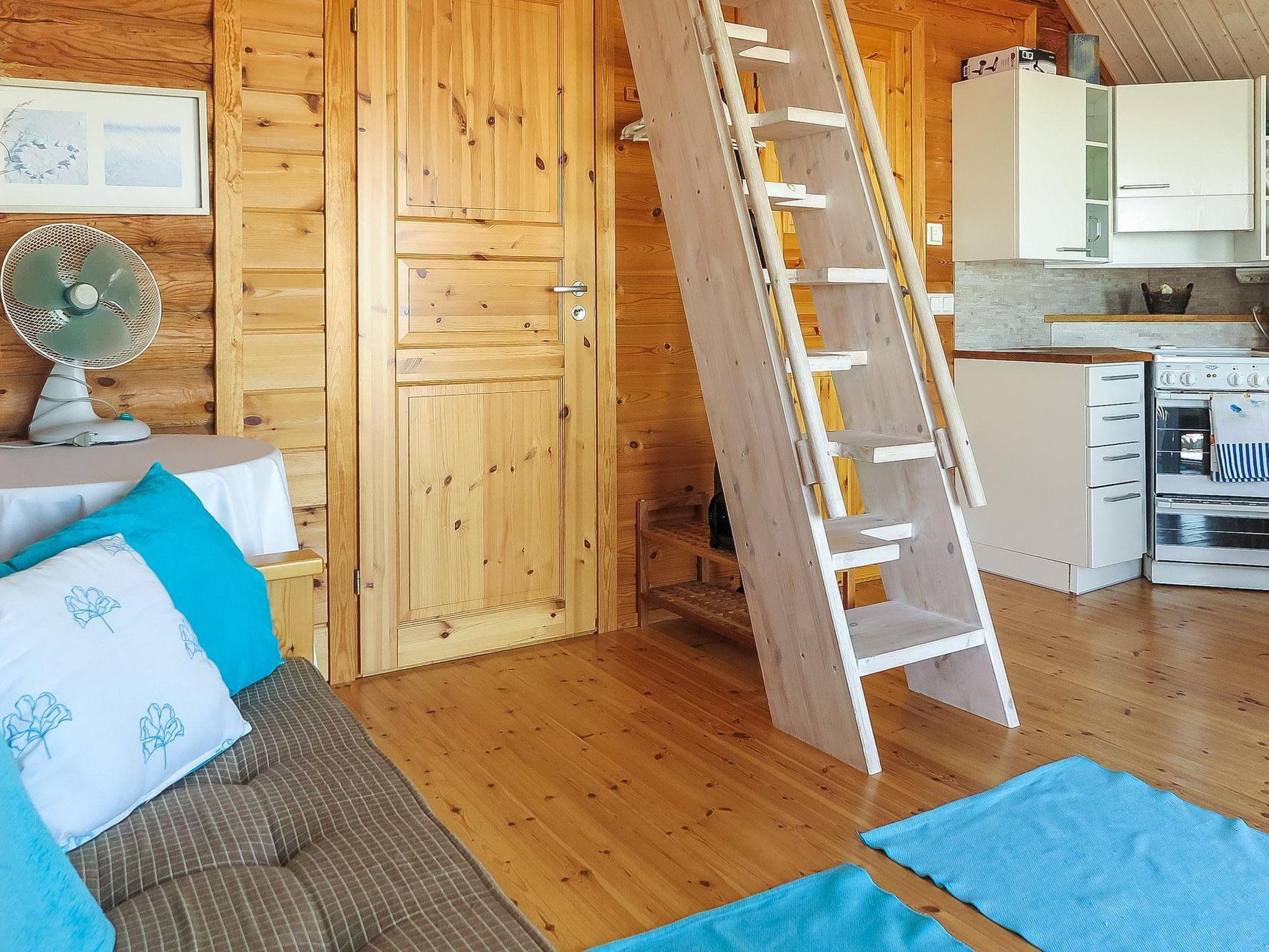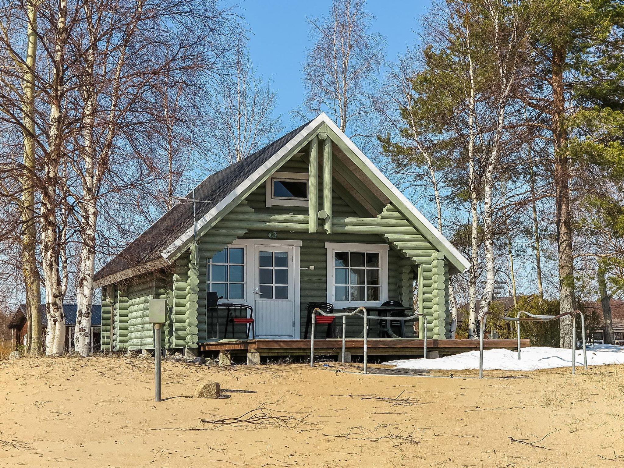 Round log cabin, built in 2011. Living room/kitchen with spreadable sofa, bedroom with double bed (width 140 cm), low loft with 3 mattresses, steep stairs lead to the loft, sauna, washroom/WC and partially covered terrace.