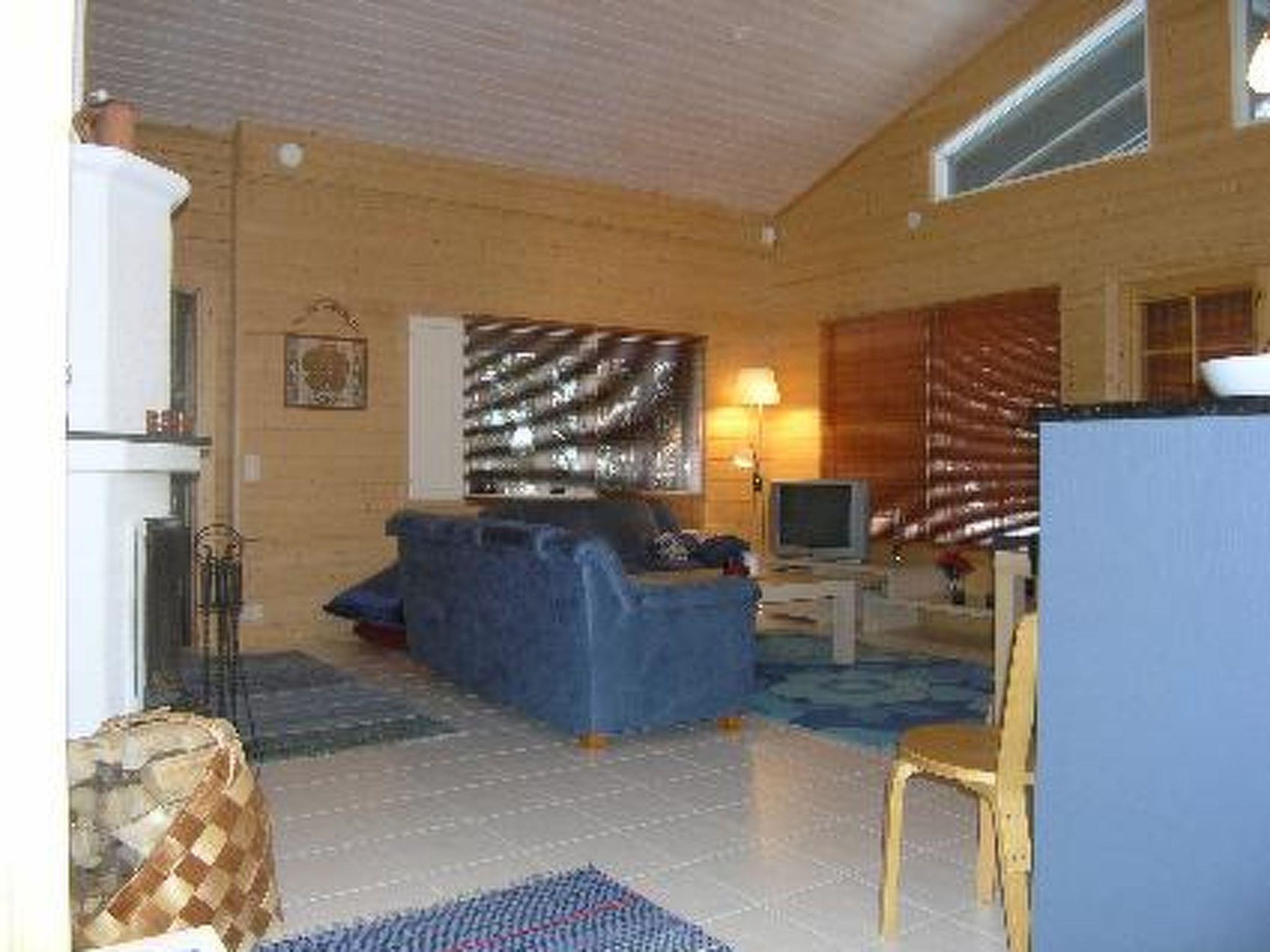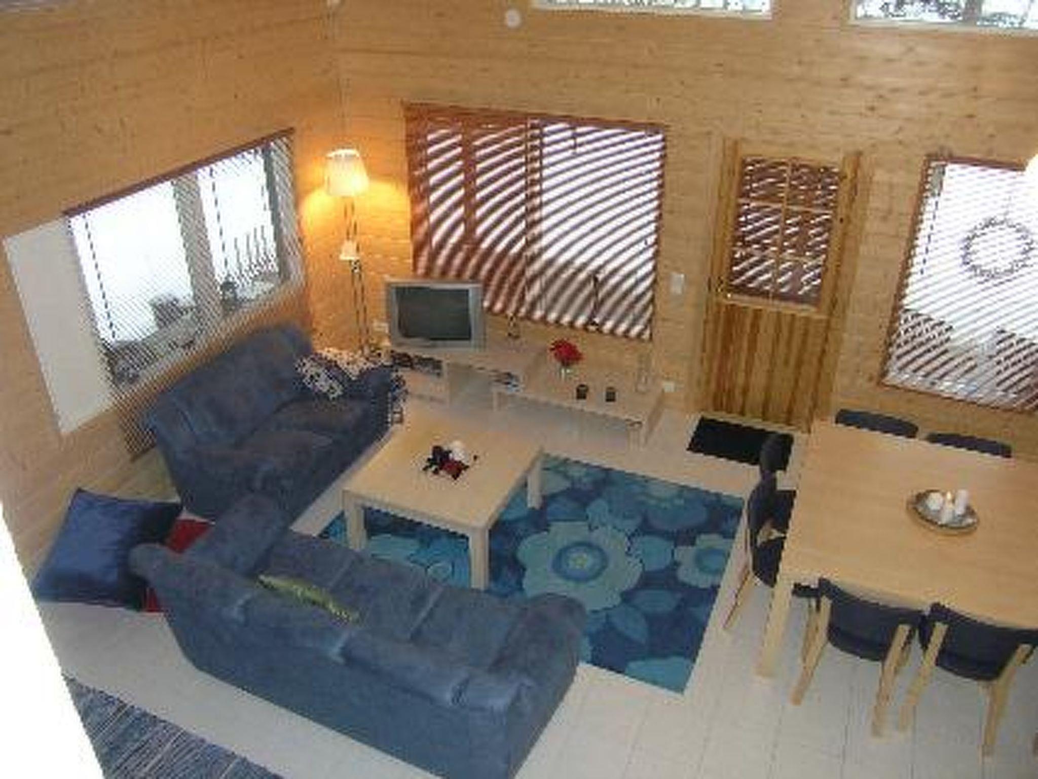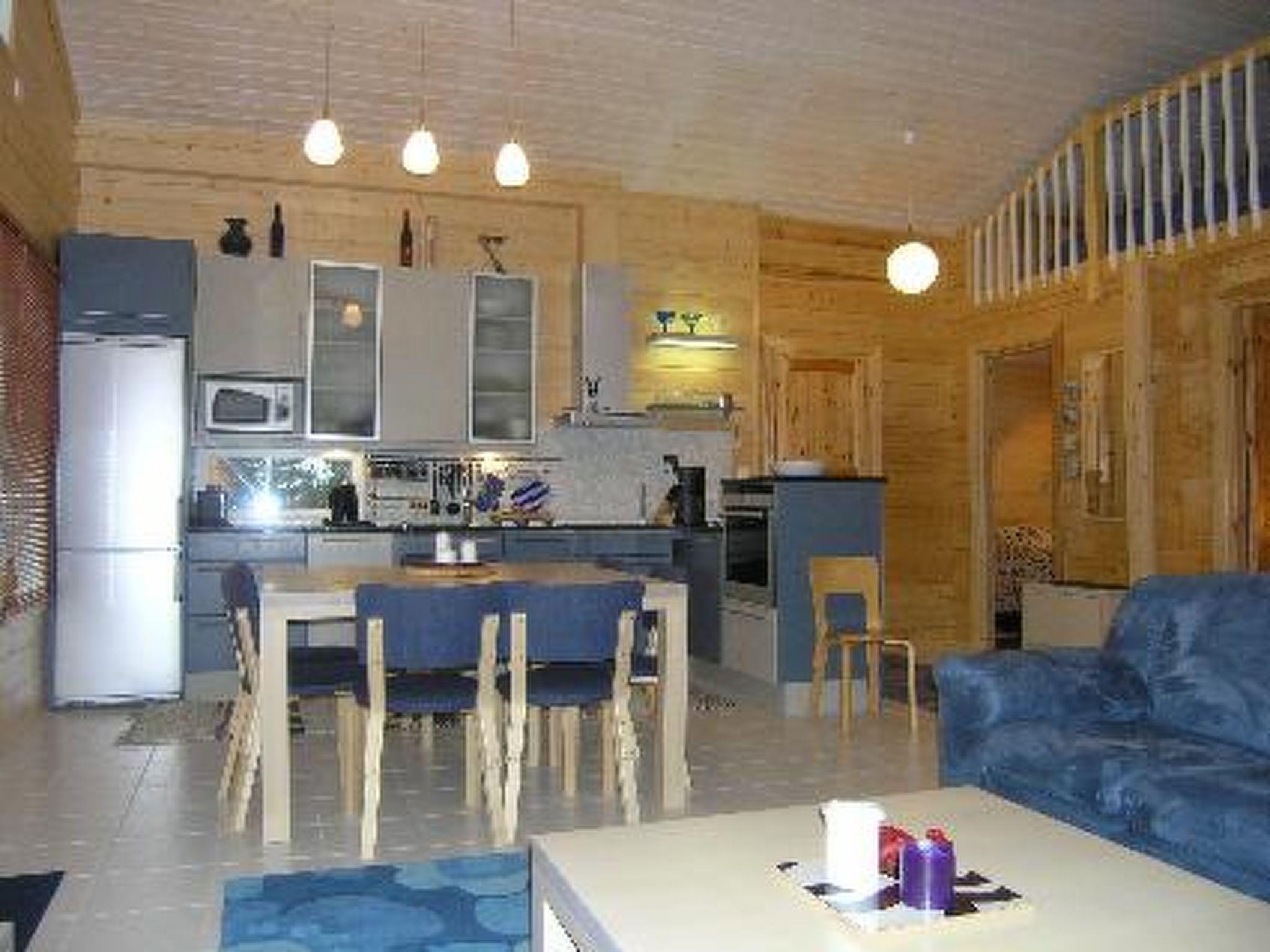 Cottage village situated log chalet 2005, living room/kitchen, 2 bedrooms with double beds, sleeping loft (sloping ceilings) with 3 mattresses, open porch. Sauna in same building (electric stove), washroom, dressing room, separate WC. Garage/woodshed with equipment/gear drying cupboard. Tumble dryer.