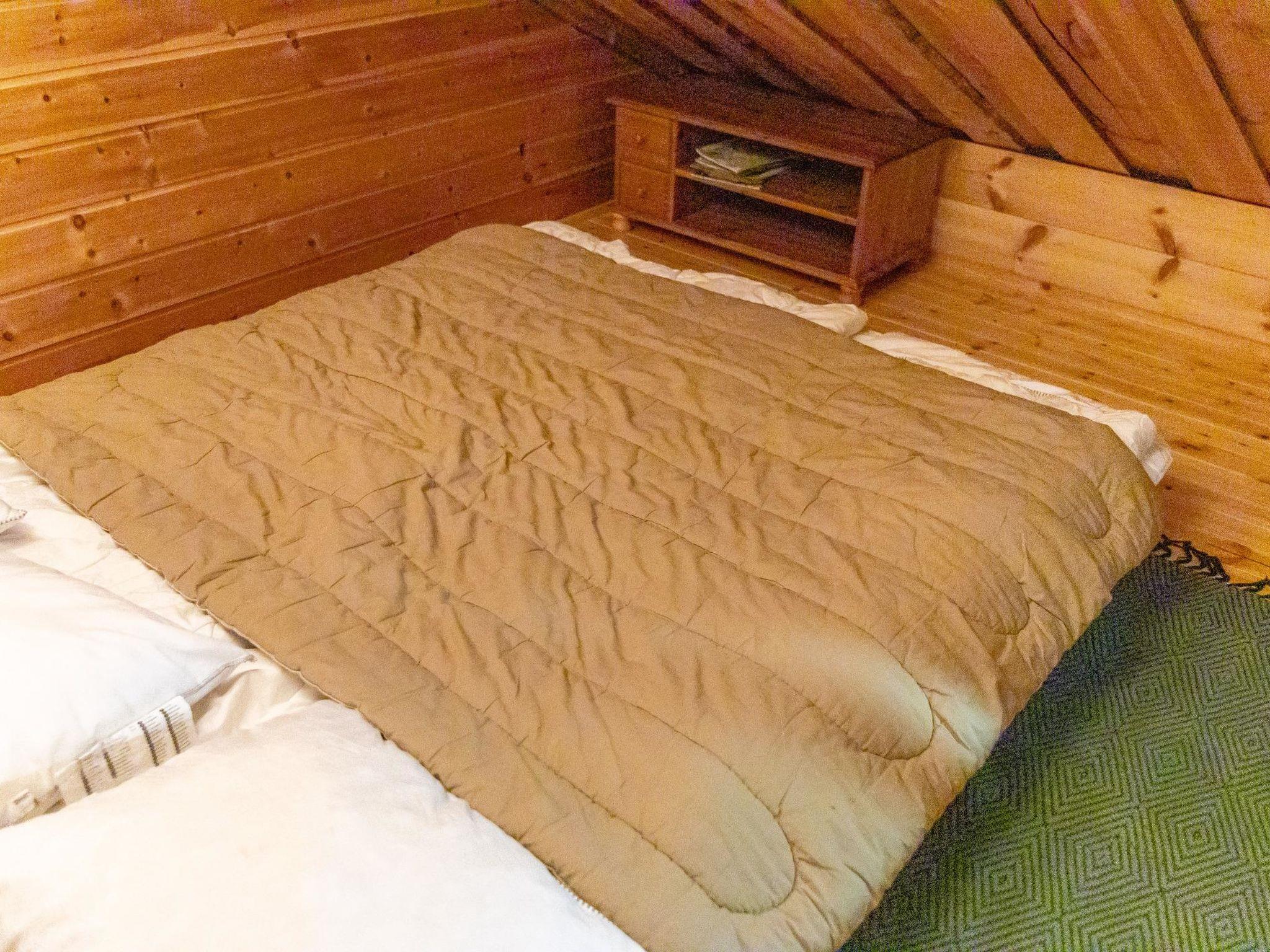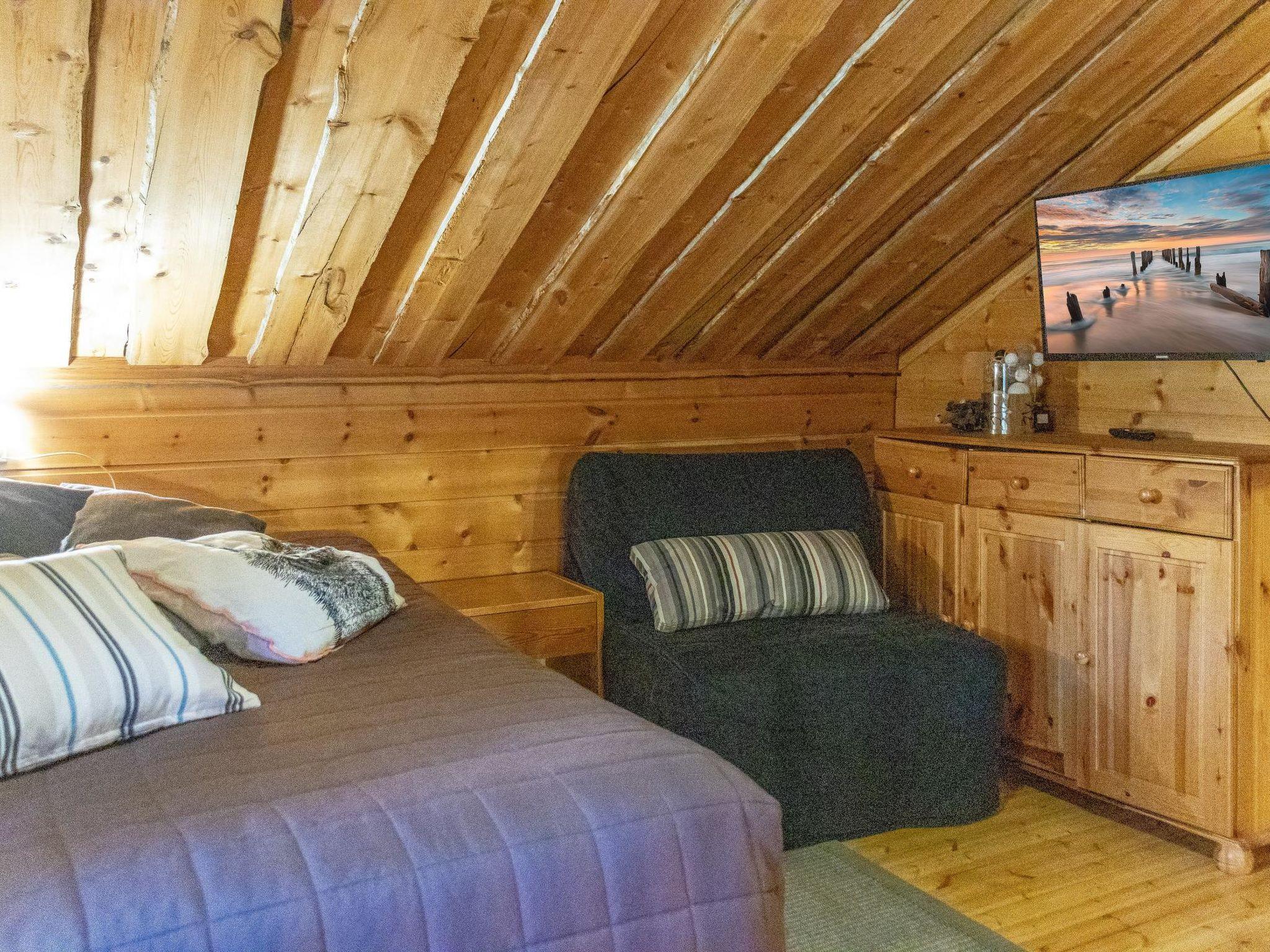 52 km north from Kemijärvi. Round log semi-detached house built in 2000 with living room/kitchen, living room, bedroom with double bed, washroom/toilet and sauna (electric stove). Upstairs open loft with one bed, bedroom with double bed and bedroom with 2 mattresses. Lobby and open porch.
