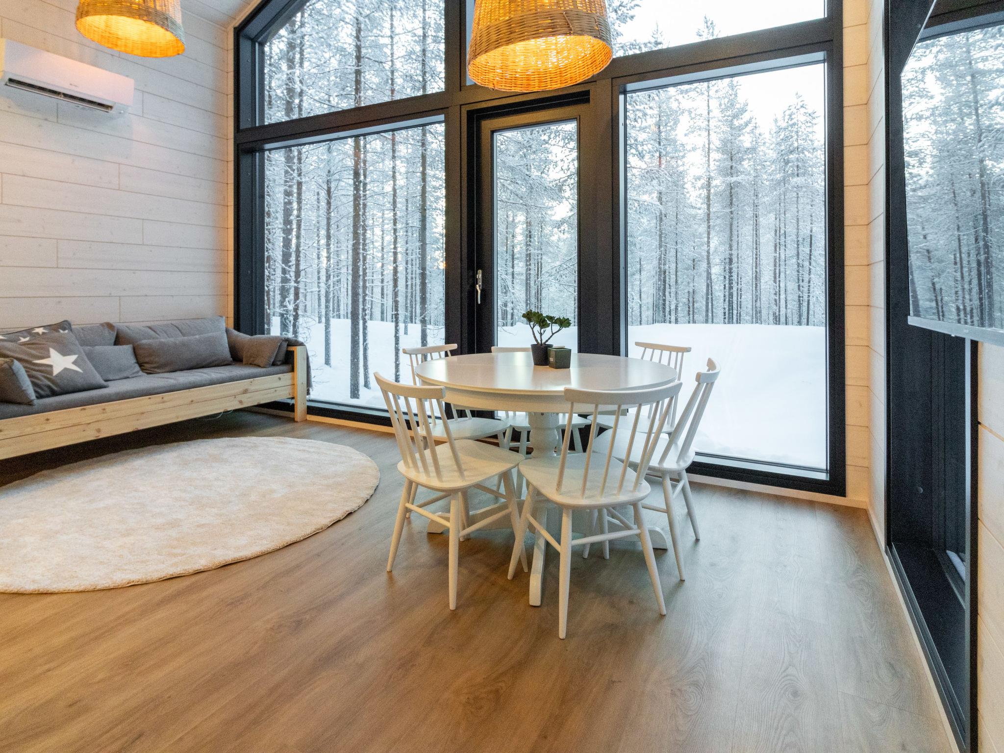 The bright living room offers magnificent views of the surrounding nature, and the large windows bring space and atmosphere to the room. Lake Pyhäjärvi is just a stone's throw away, and the diverse services, slopes, and outdoor activities of Pyhätunturi are a short distance away.
