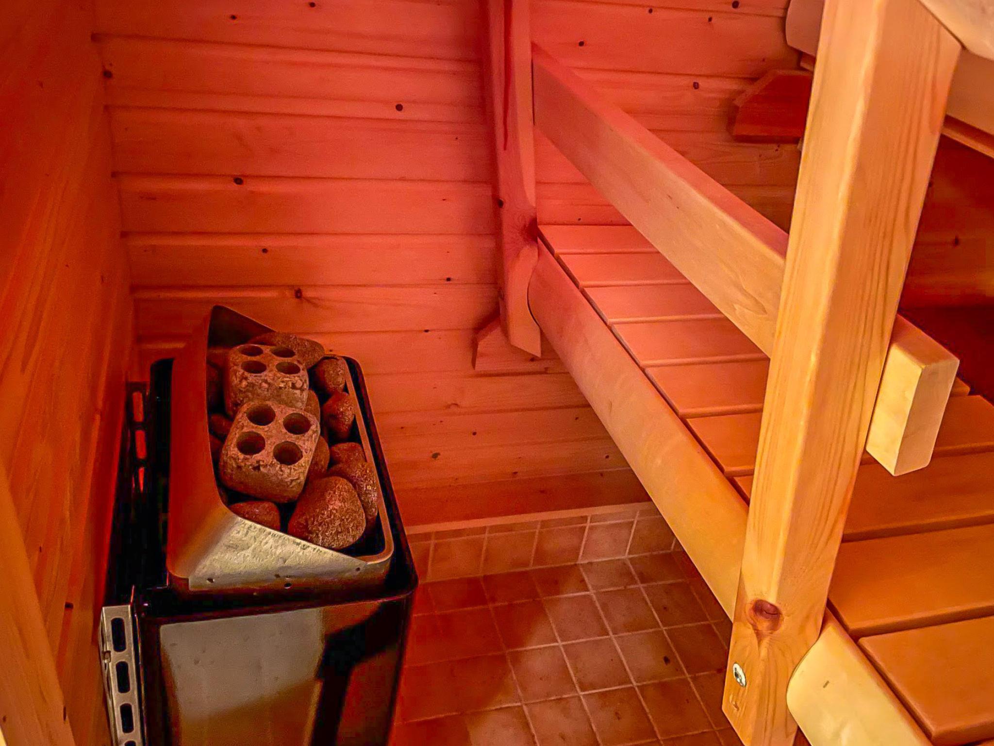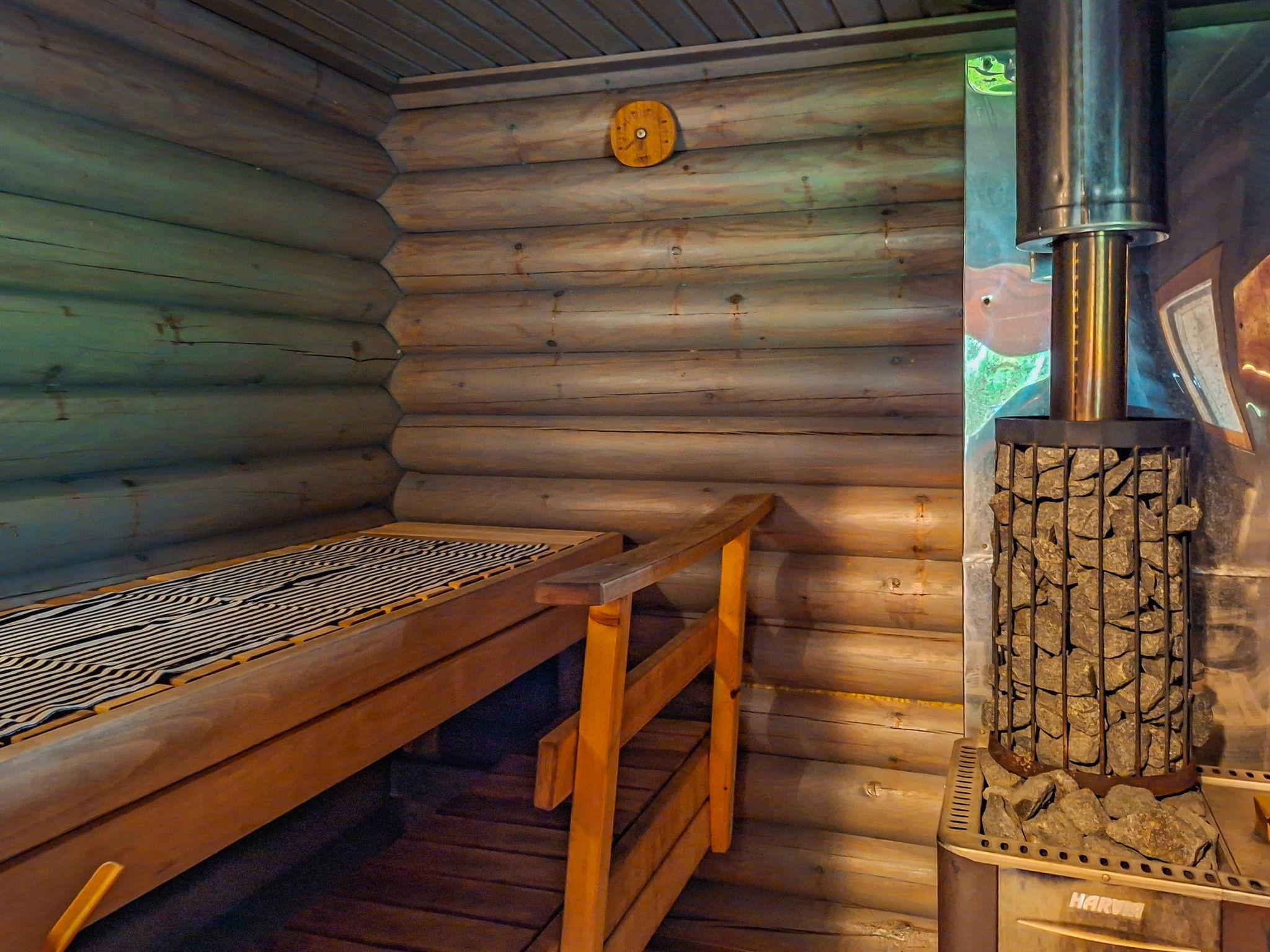 The year-round lakeside sauna has a wood-burning stove, washing water from the heater tank. There is an outdoor hot tub on the sauna terrace for free use.