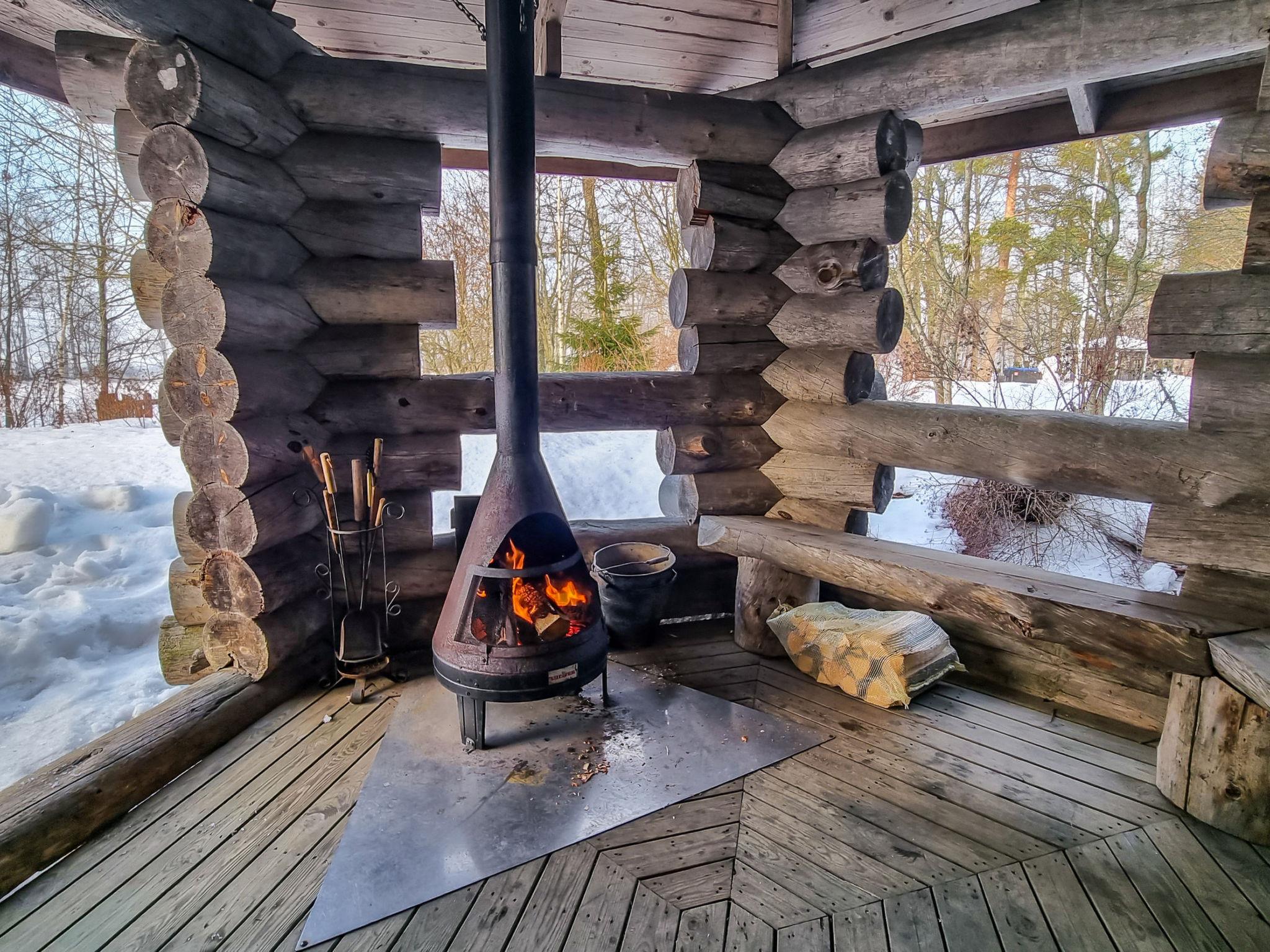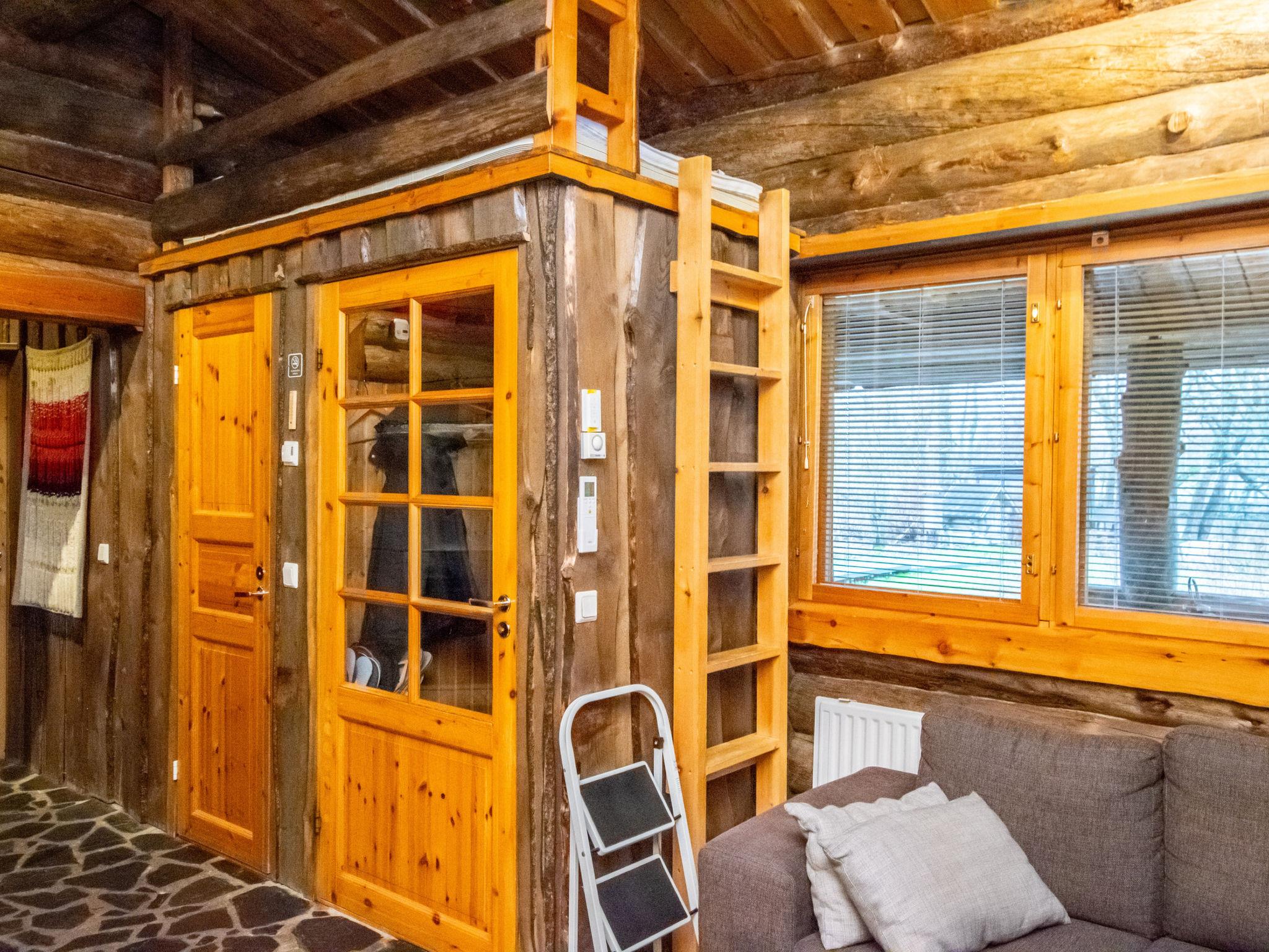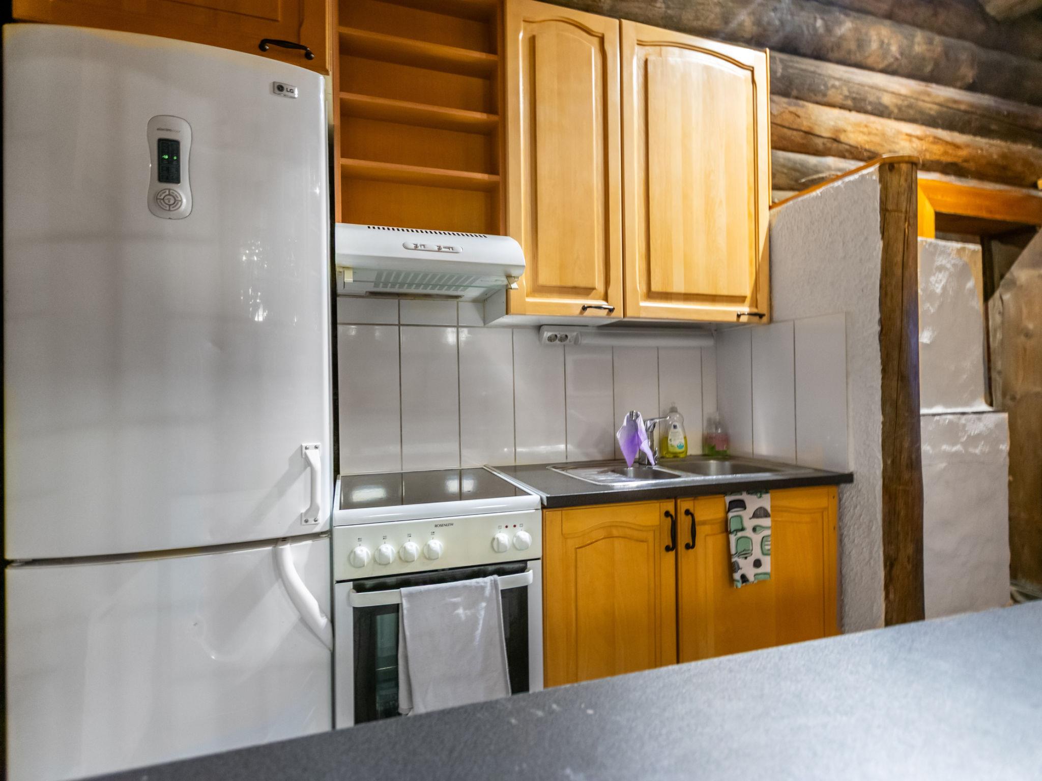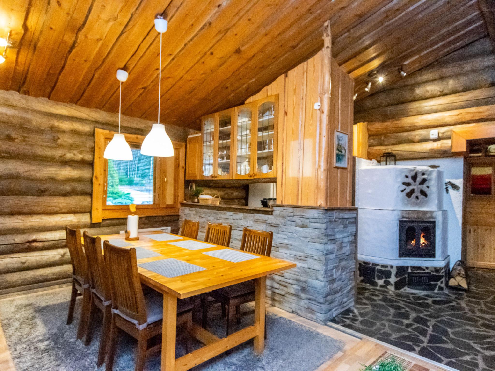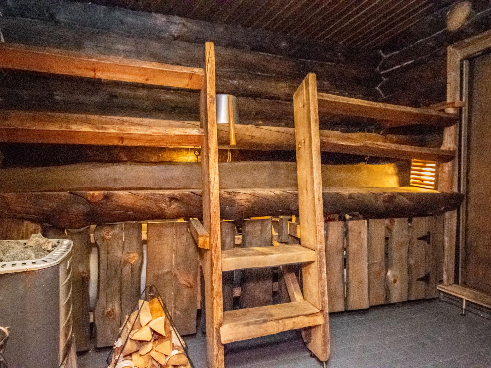 The kelo log villa includes a living room, kitchen, sleeping alcove with two beds, a sauna with a wood-burning stove and shower, a separate toilet, and a loft above the sleeping alcove with two mattresses. Another loft has one 120 cm mattress.