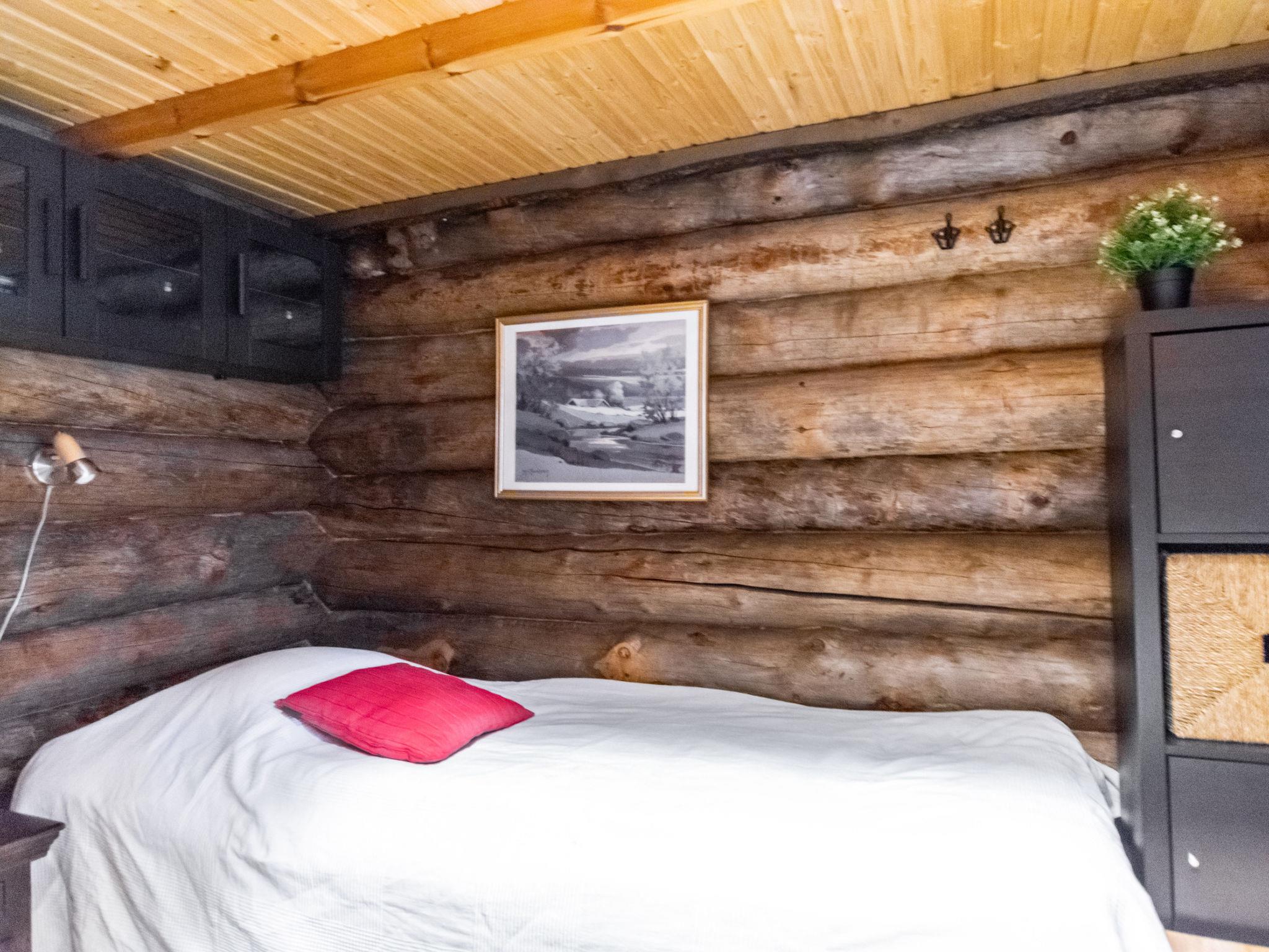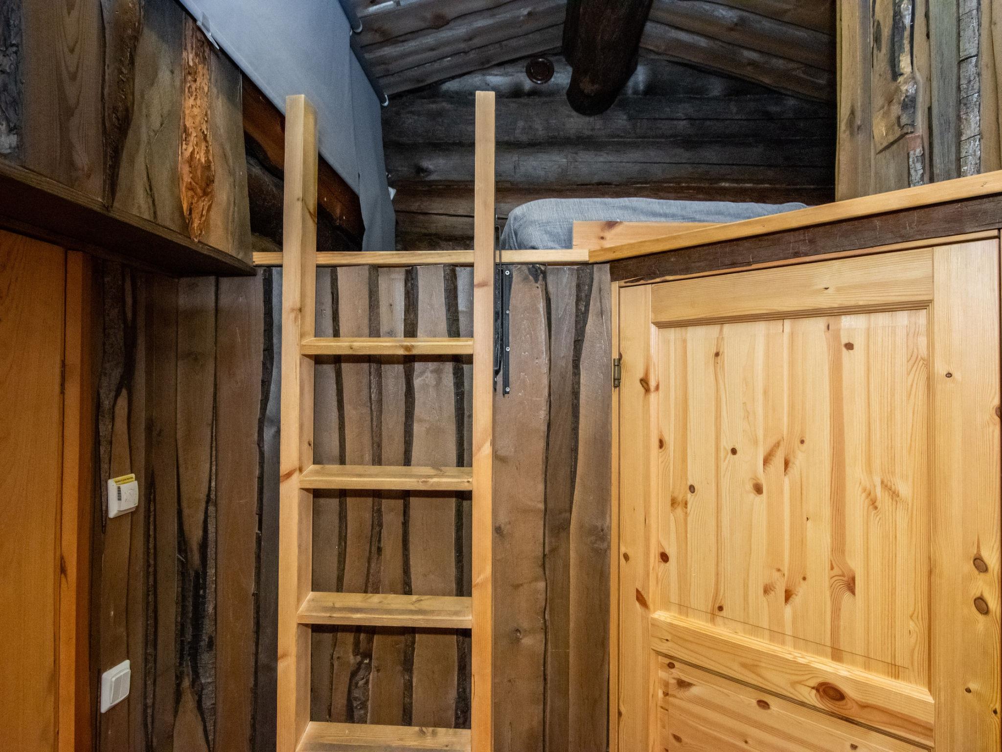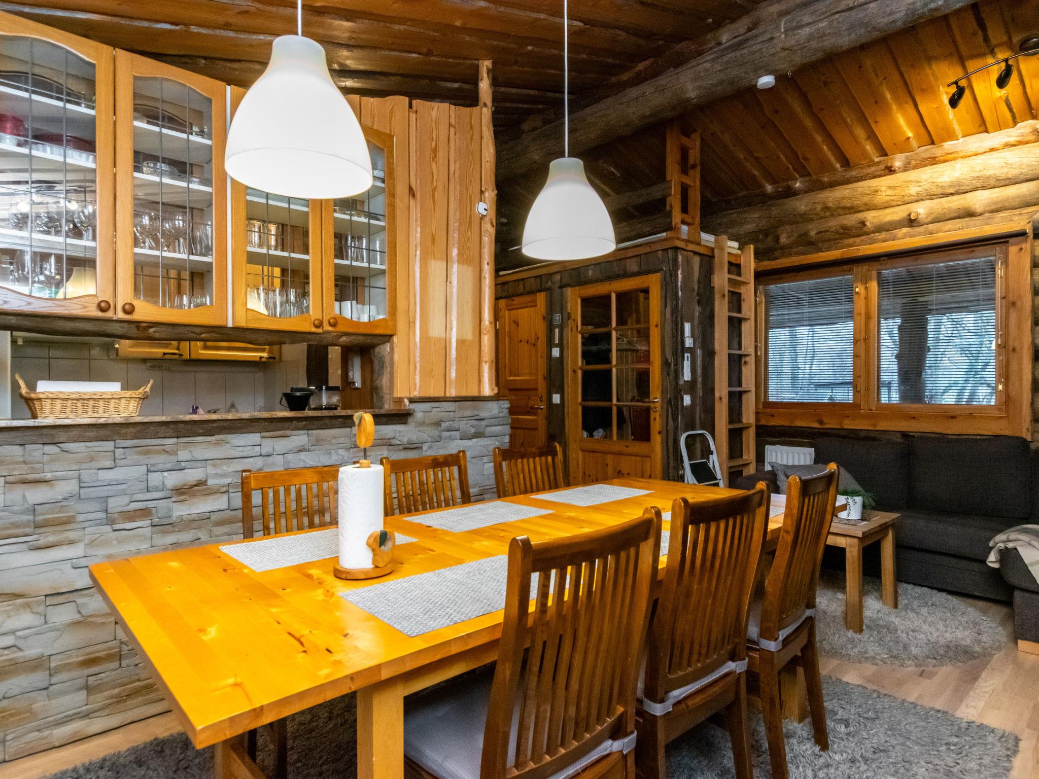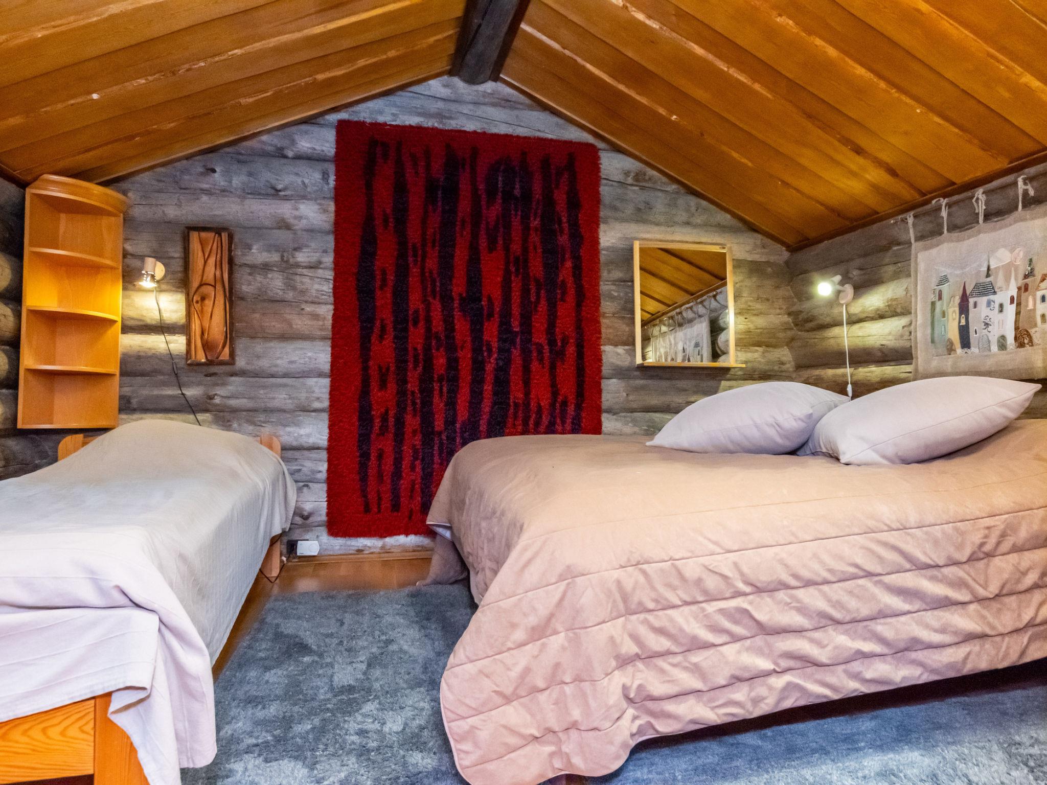 The kelo log villa includes a living room, kitchen, sleeping alcove with two beds, a sauna with a wood-burning stove and shower, a separate toilet, and a loft above the sleeping alcove with two mattresses. Another loft has one 120 cm mattress.
