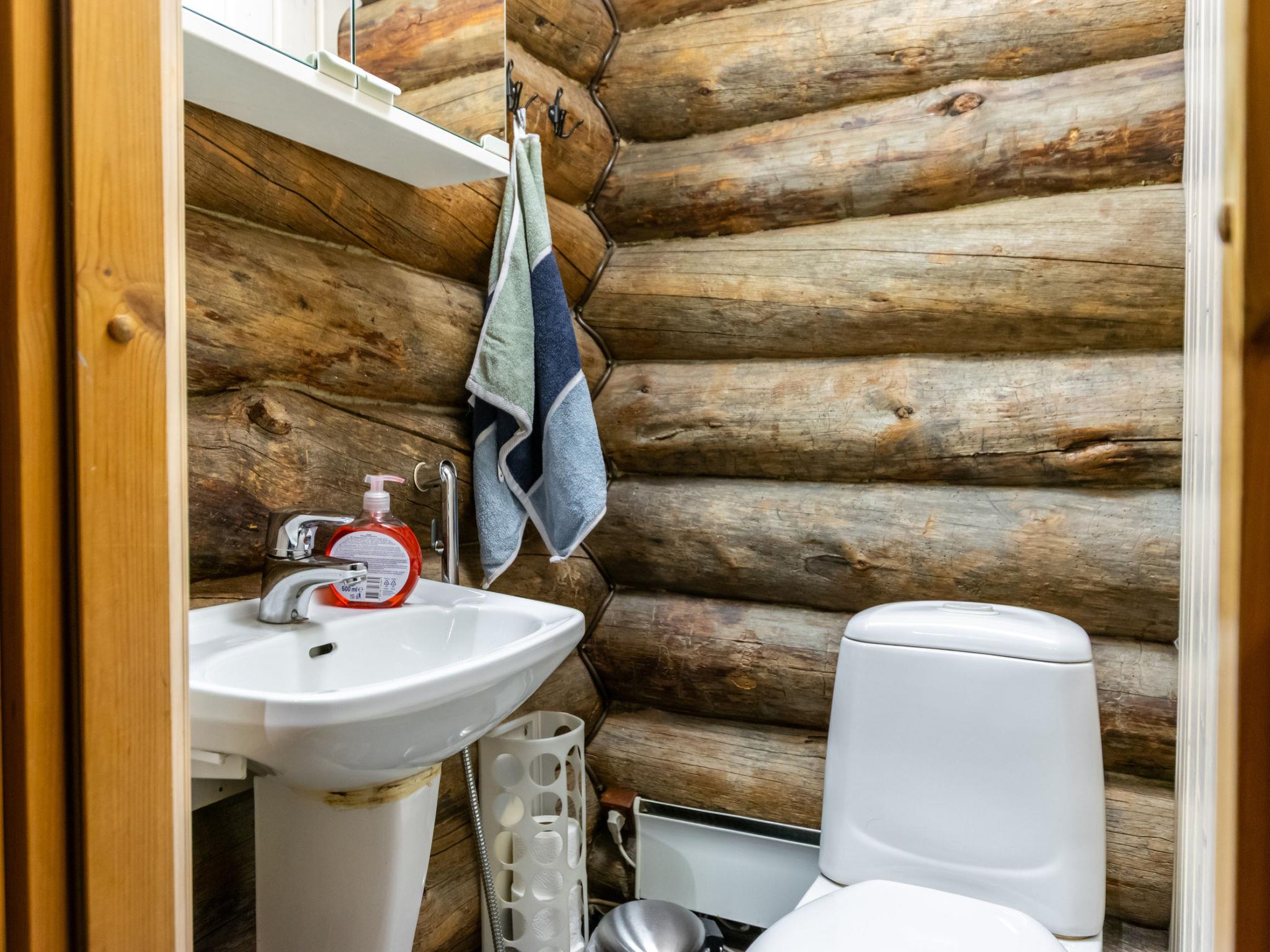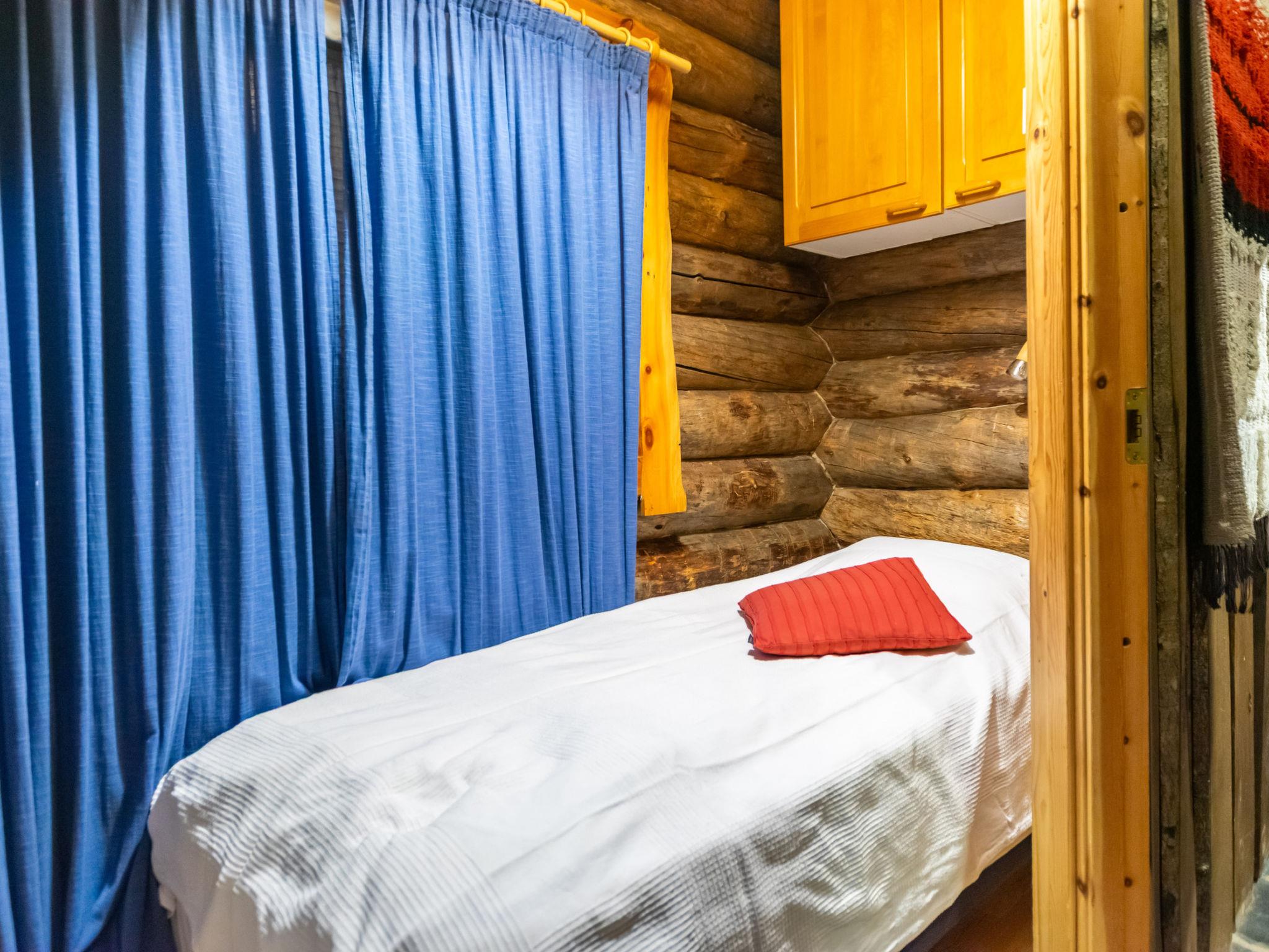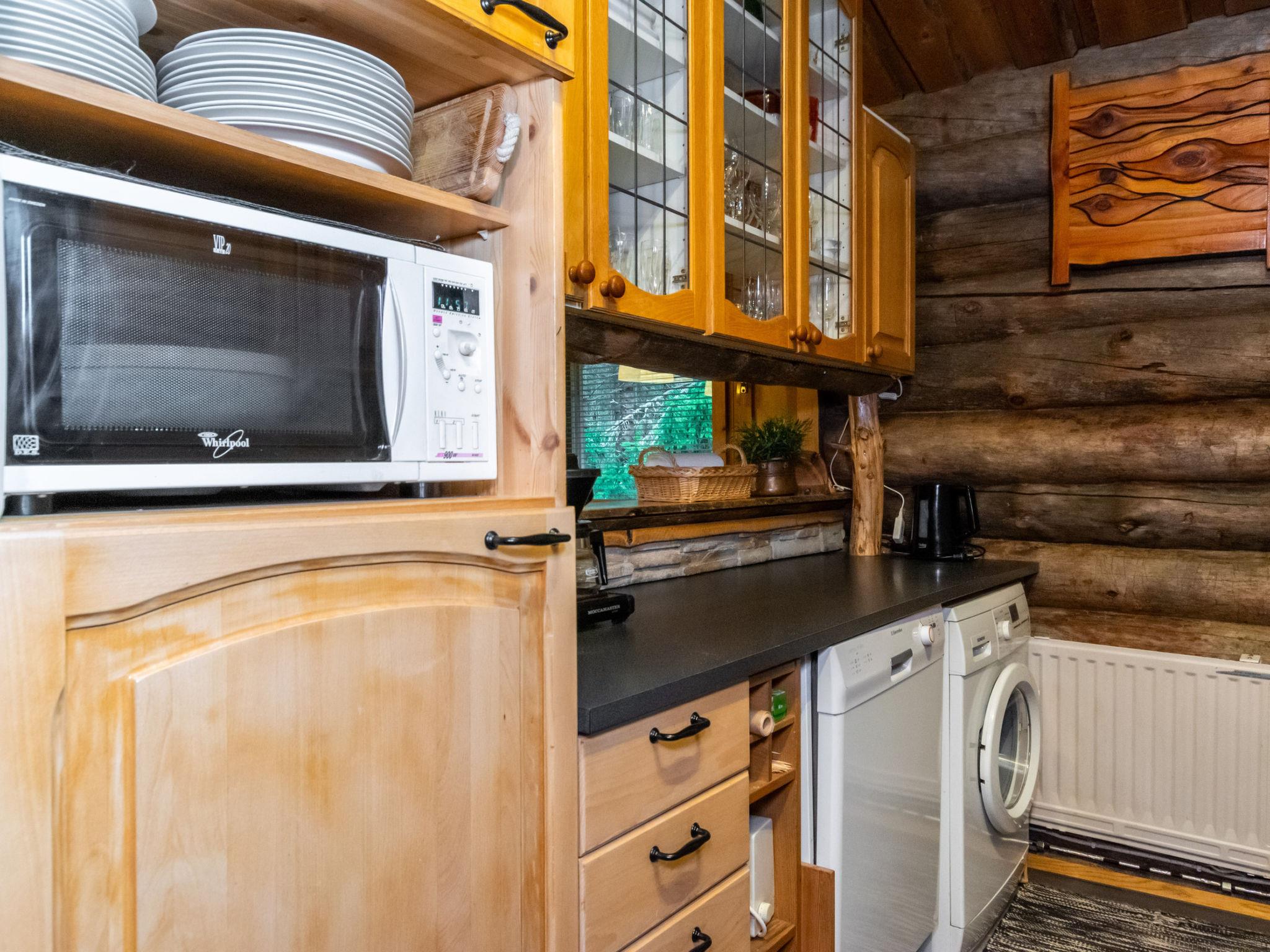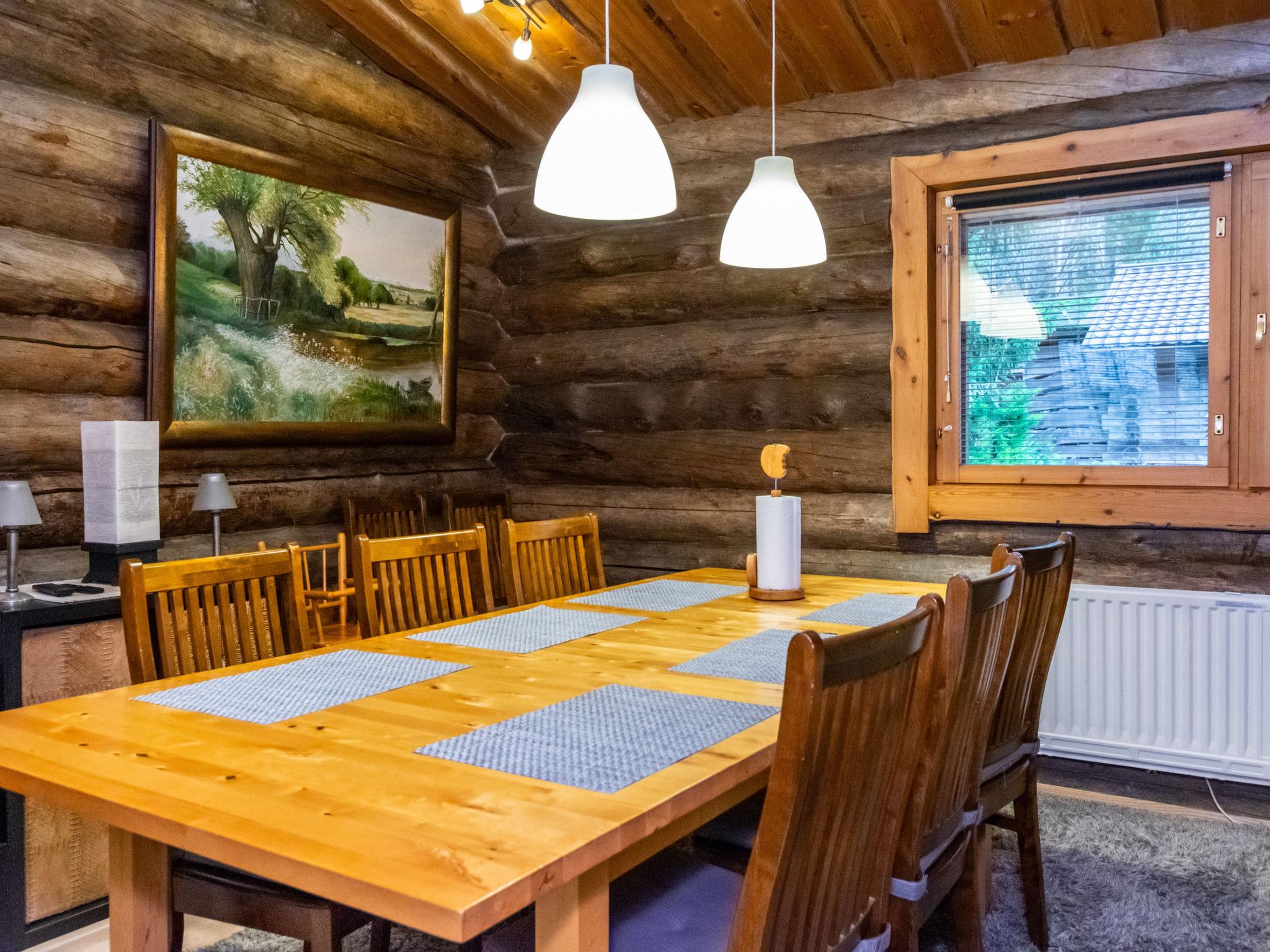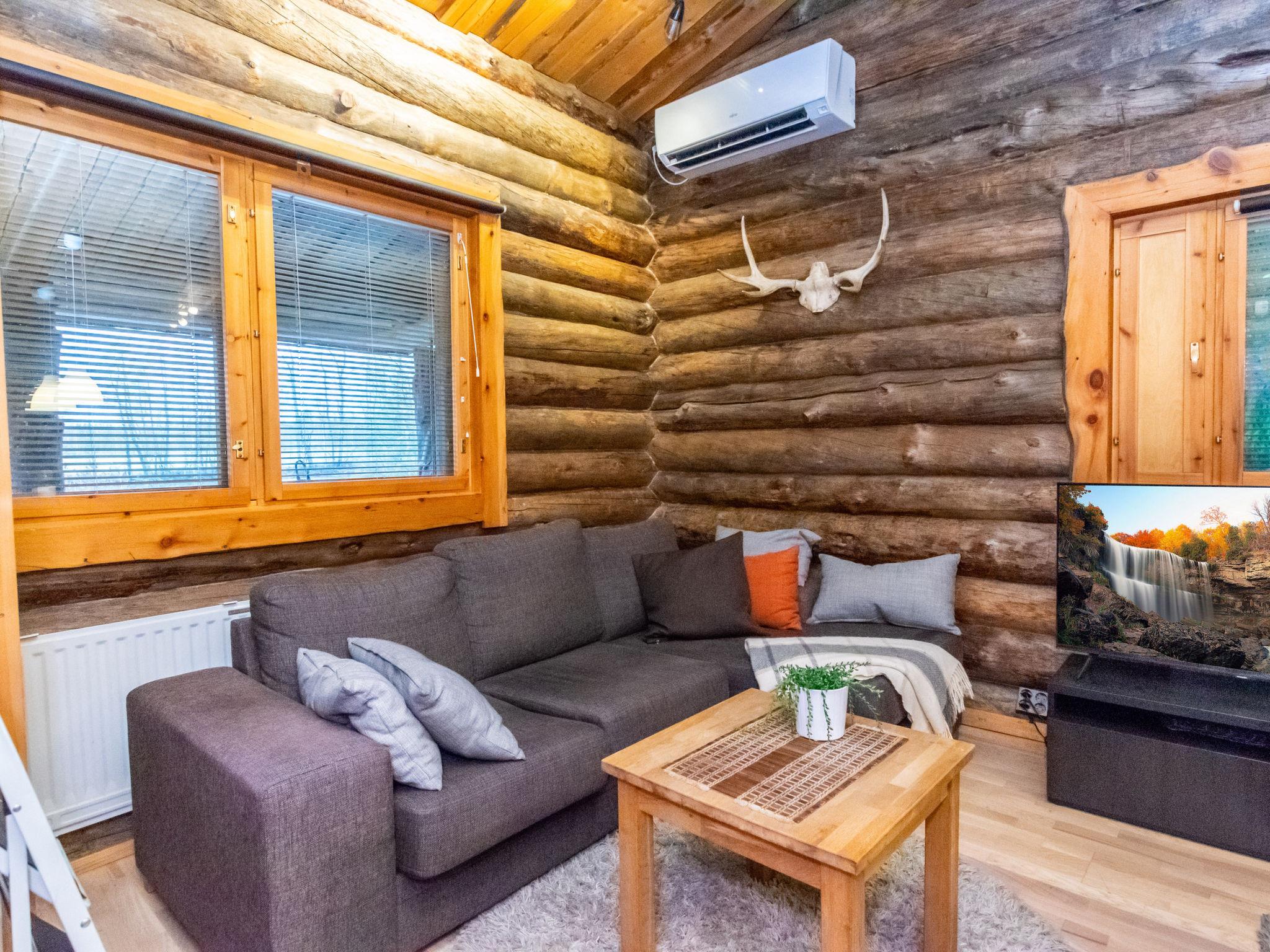 The kelo log villa includes a living room, kitchen, sleeping alcove with two beds, a sauna with a wood-burning stove and shower, a separate toilet, and a loft above the sleeping alcove with two mattresses. Another loft has one 120 cm mattress.