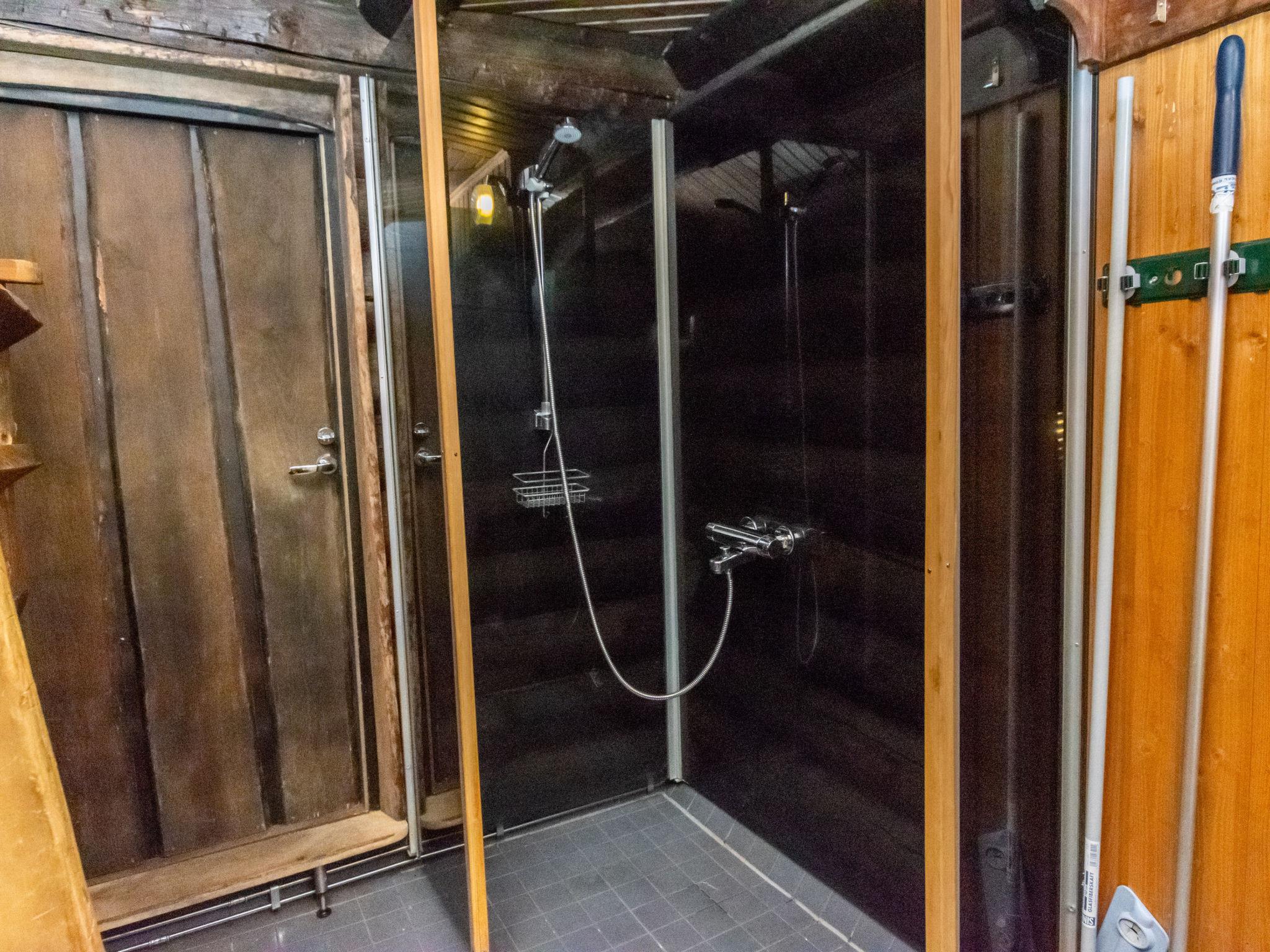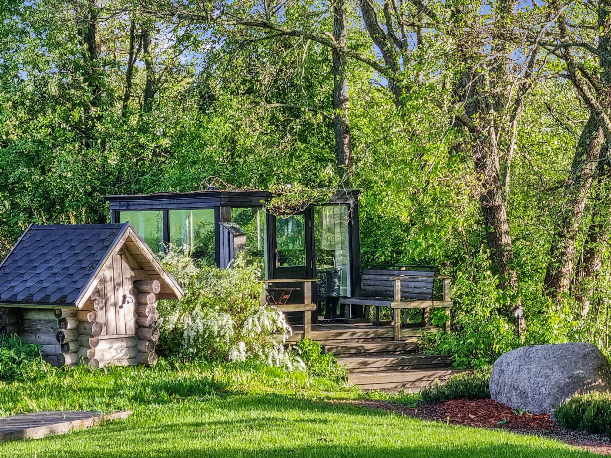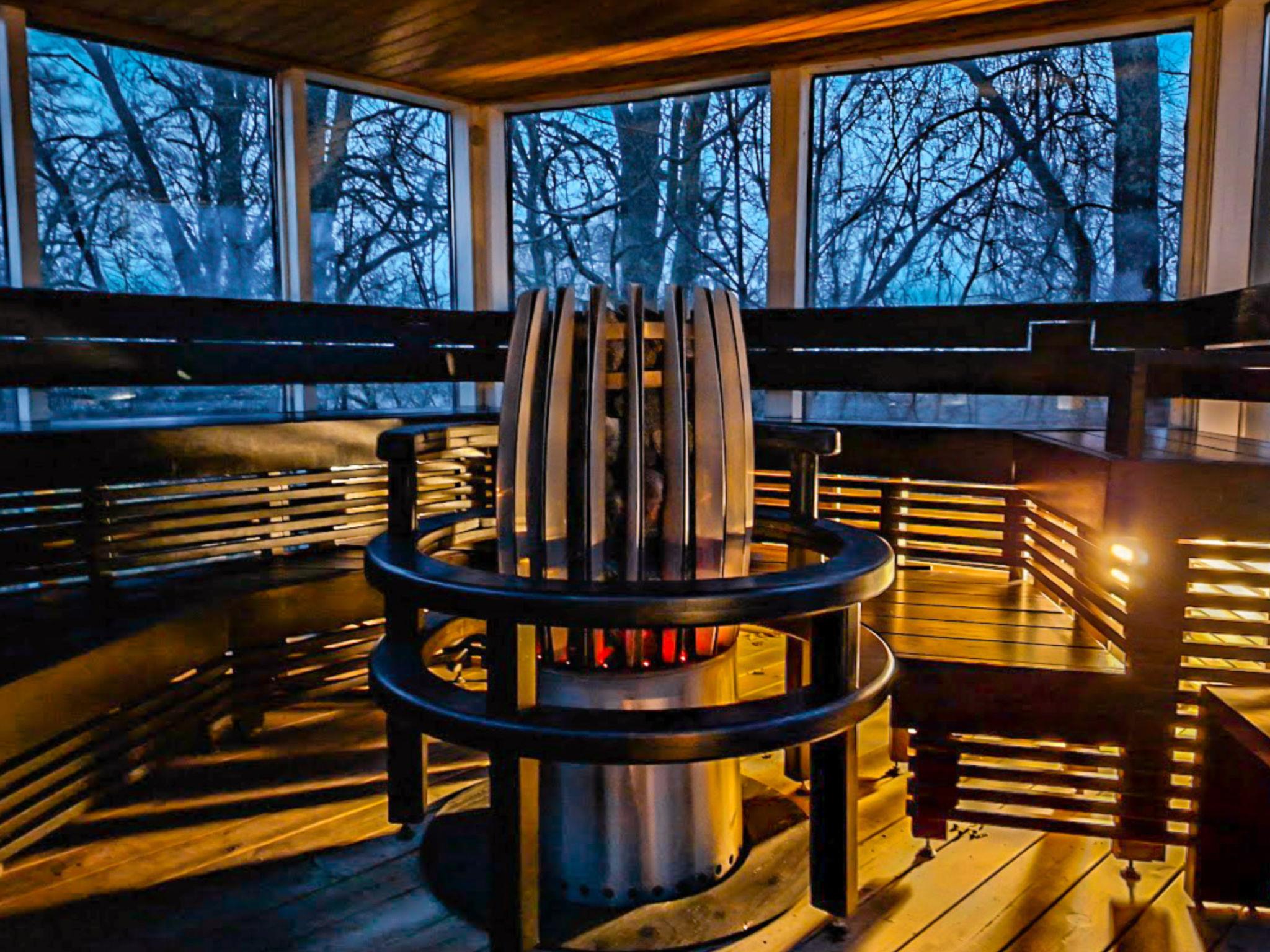 The lakeside sauna with glass walls features an electric sauna heater.
