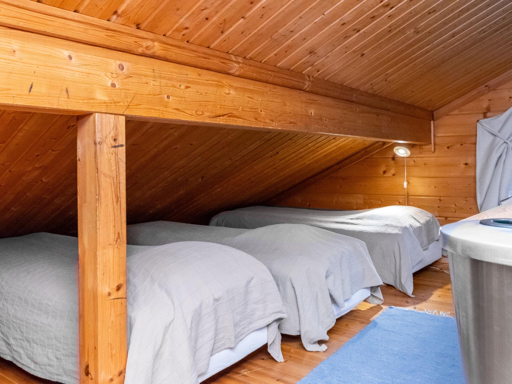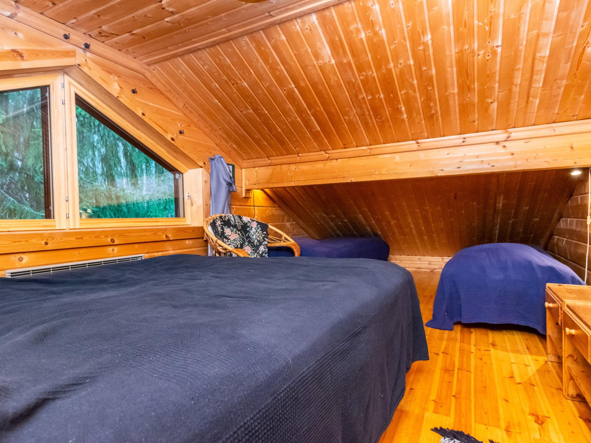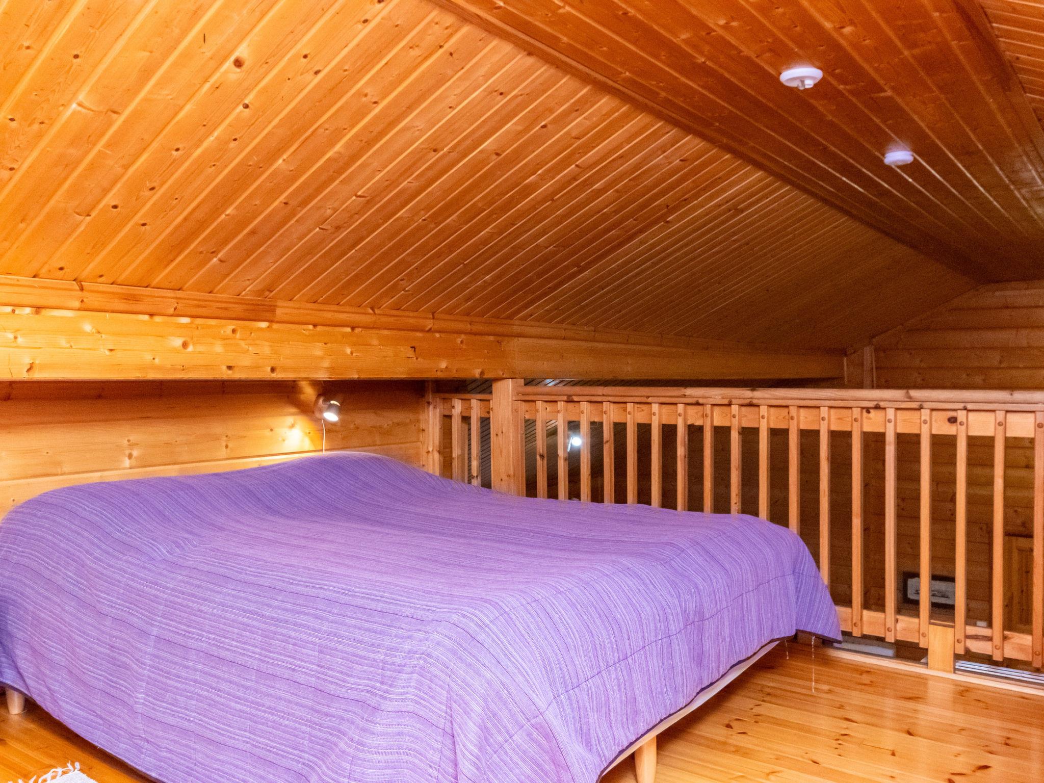 Above the sauna, there is a sleeping nook for four, accessible via steep outdoor stairs.