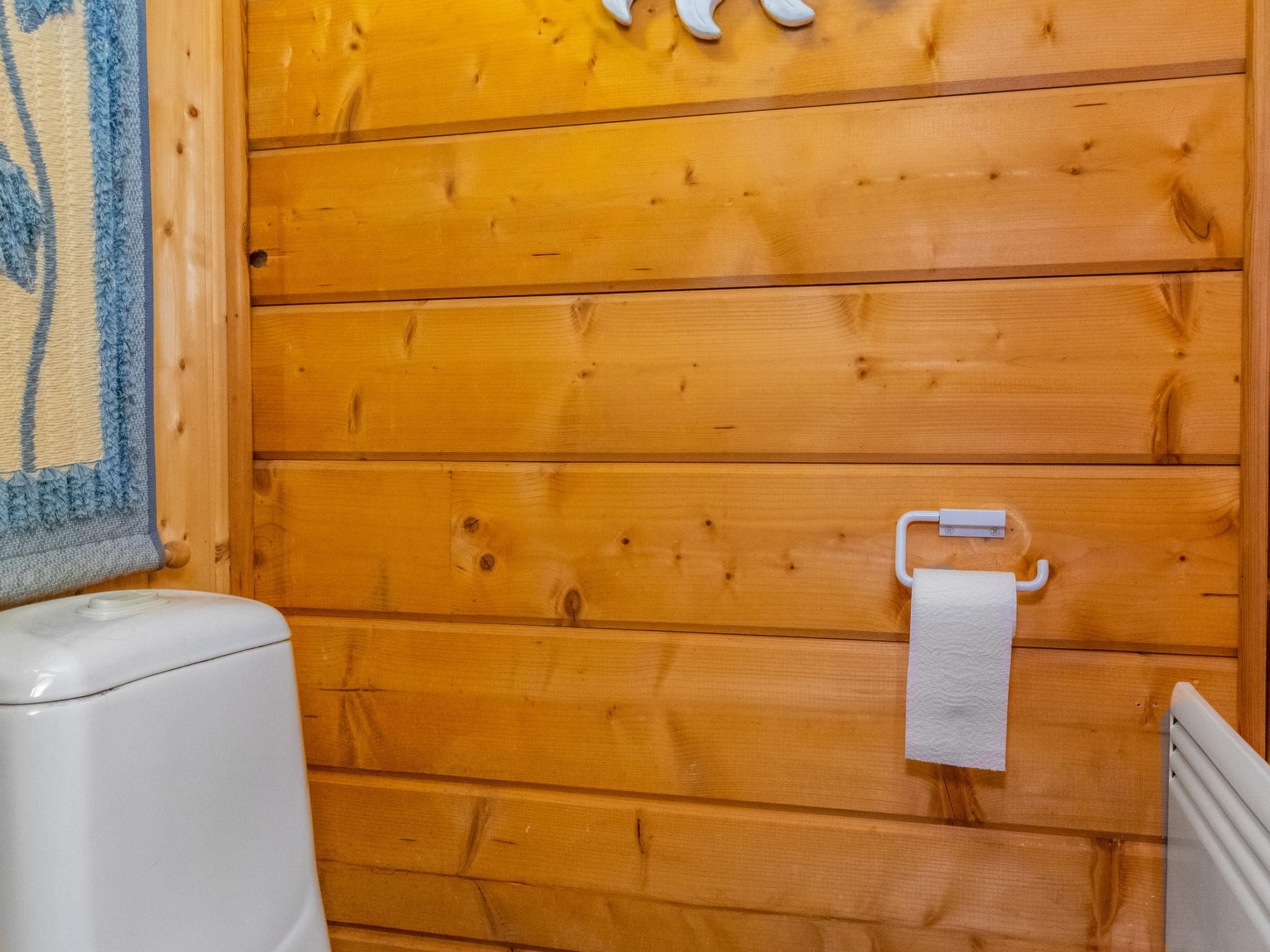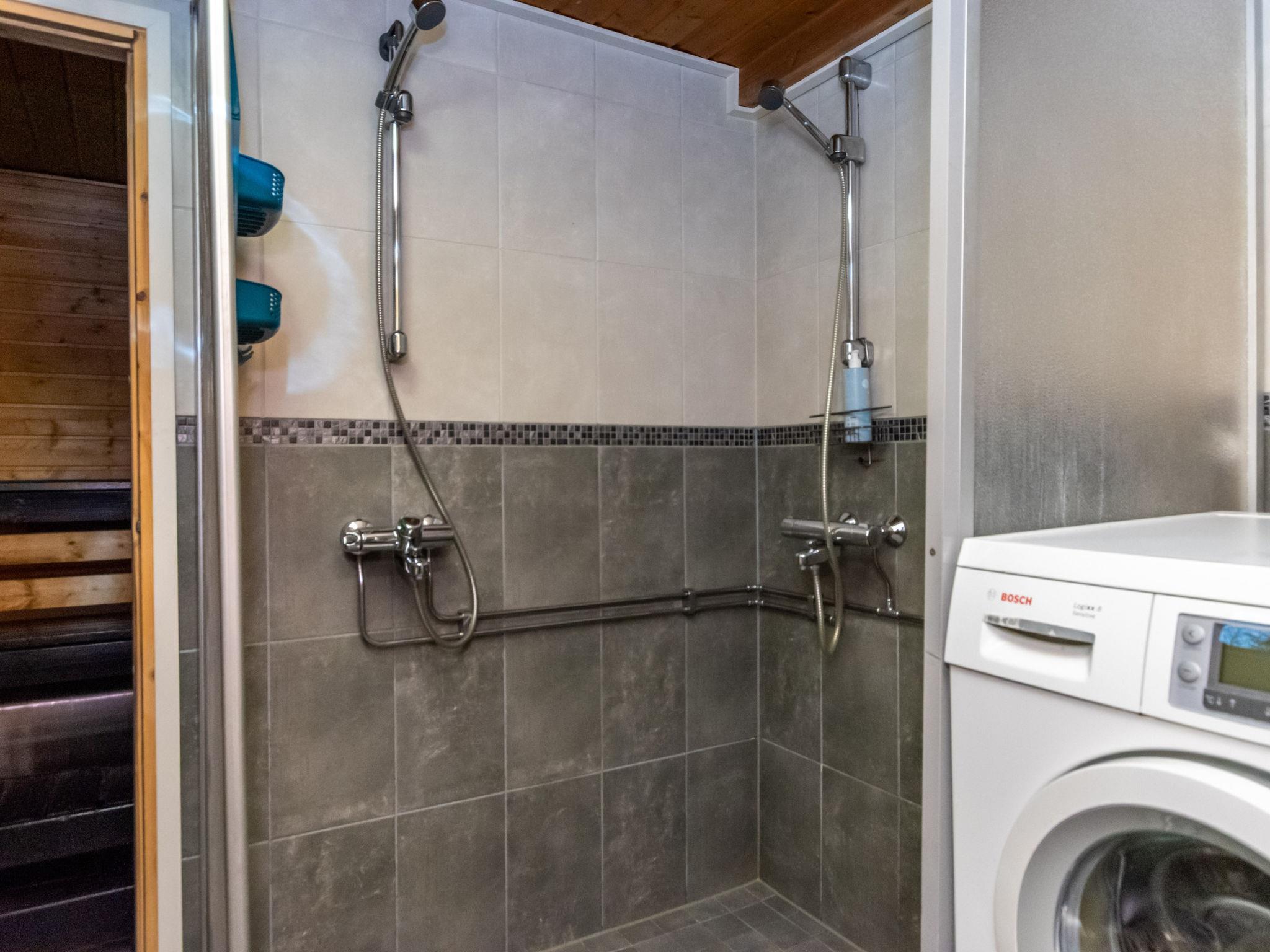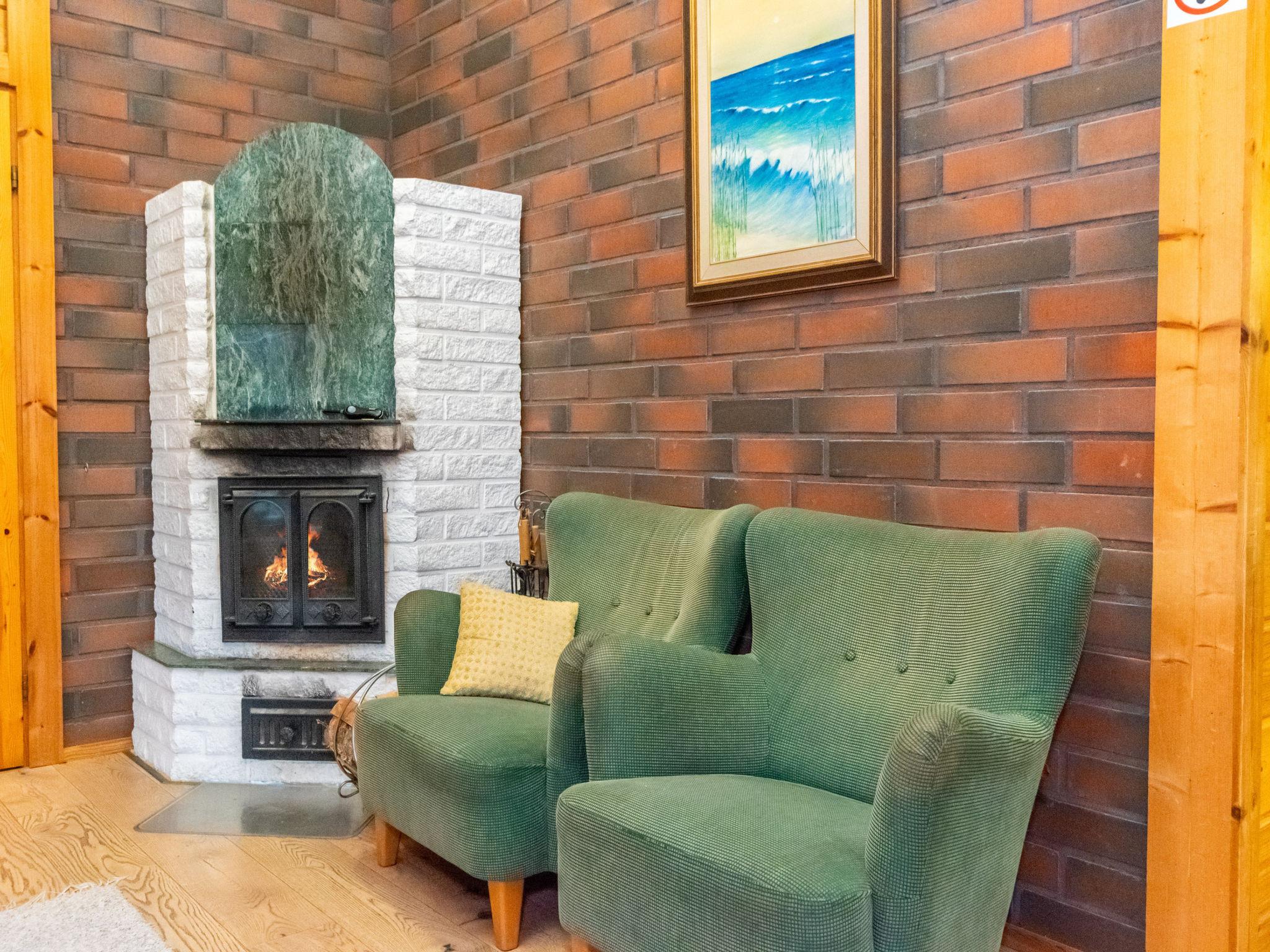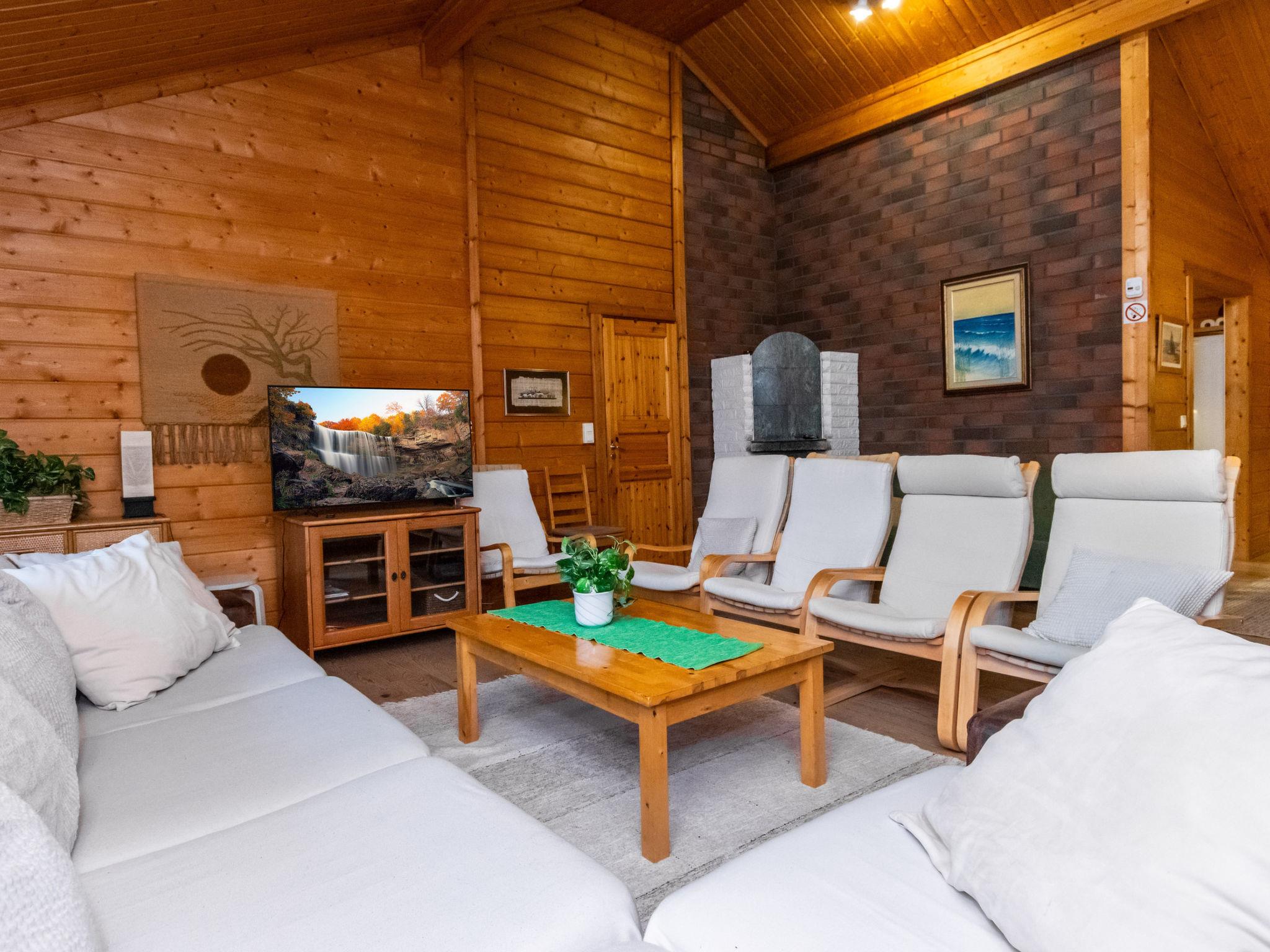 The spacious log villa features a large living room, kitchen, and dining area. On the ground floor, there are three bedrooms: one with a double bed and two with two beds each. There is a dressing room, a washroom with two showers, and a sauna with a wood-burning stove. Two toilets are available.