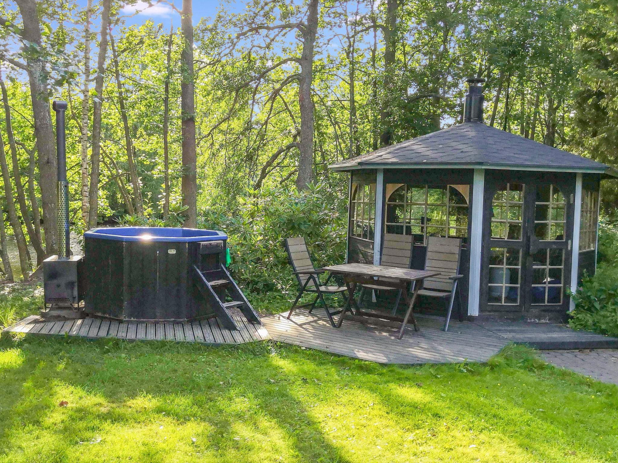 Amenities include a lakeside sauna, a gazebo with a grill, a campfire site, a rowing boat, and a swimming dock. Indoor entertainment is provided by a billiard table, perfect for any weather.
