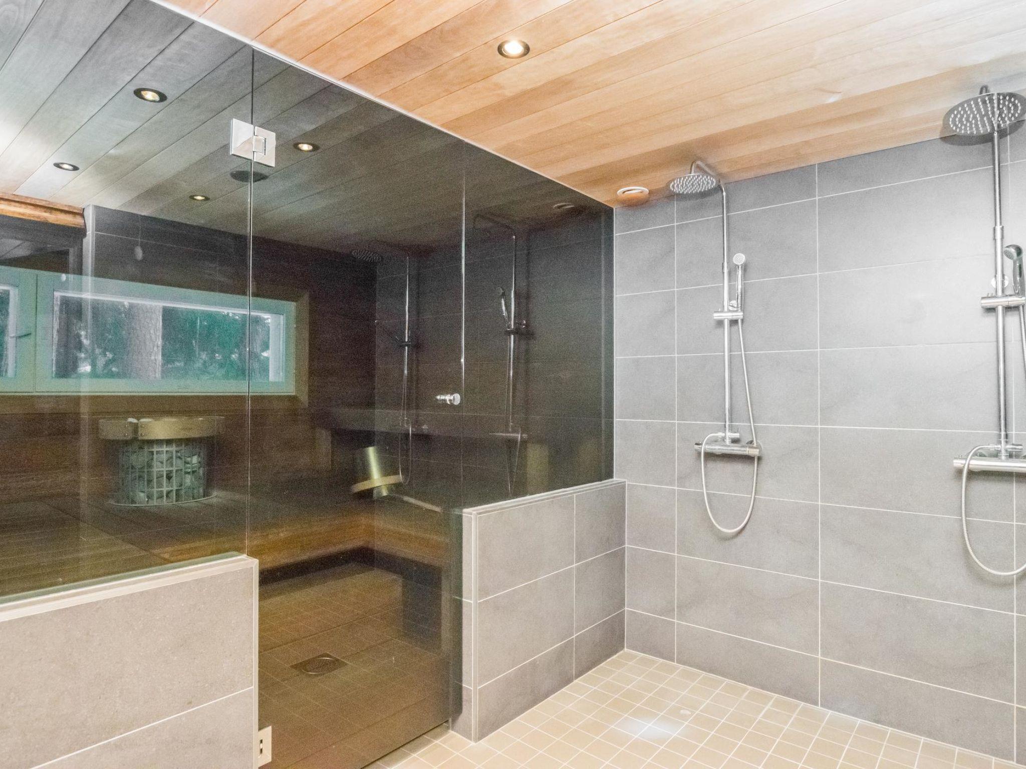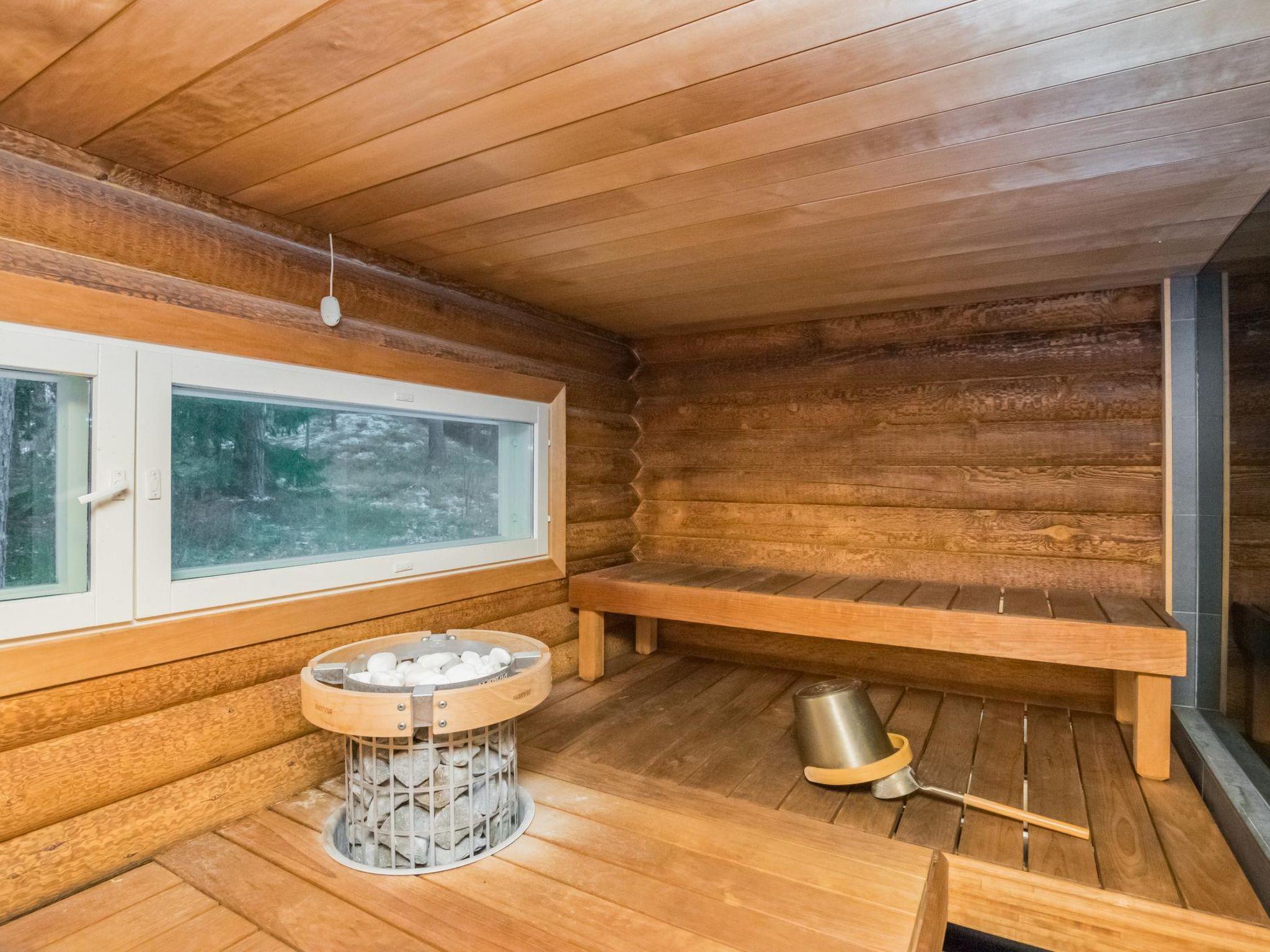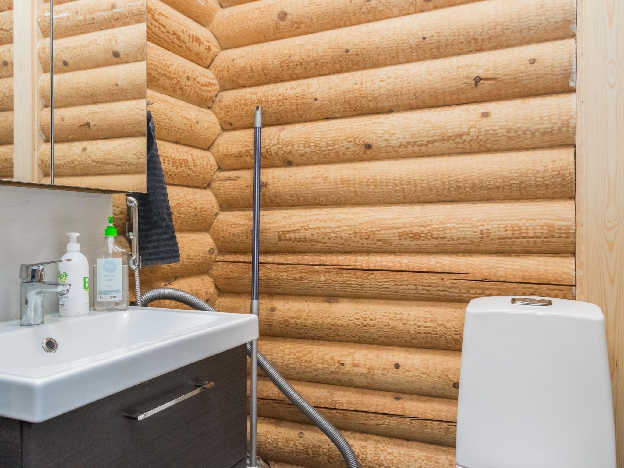 This round log villa comprises a large living room /kitchen, three bedrooms with two beds in each (one with a double bed mattress), three bathrooms, a dressing room with a sofa bed for two, and a spacious electric sauna in the bathroom.
