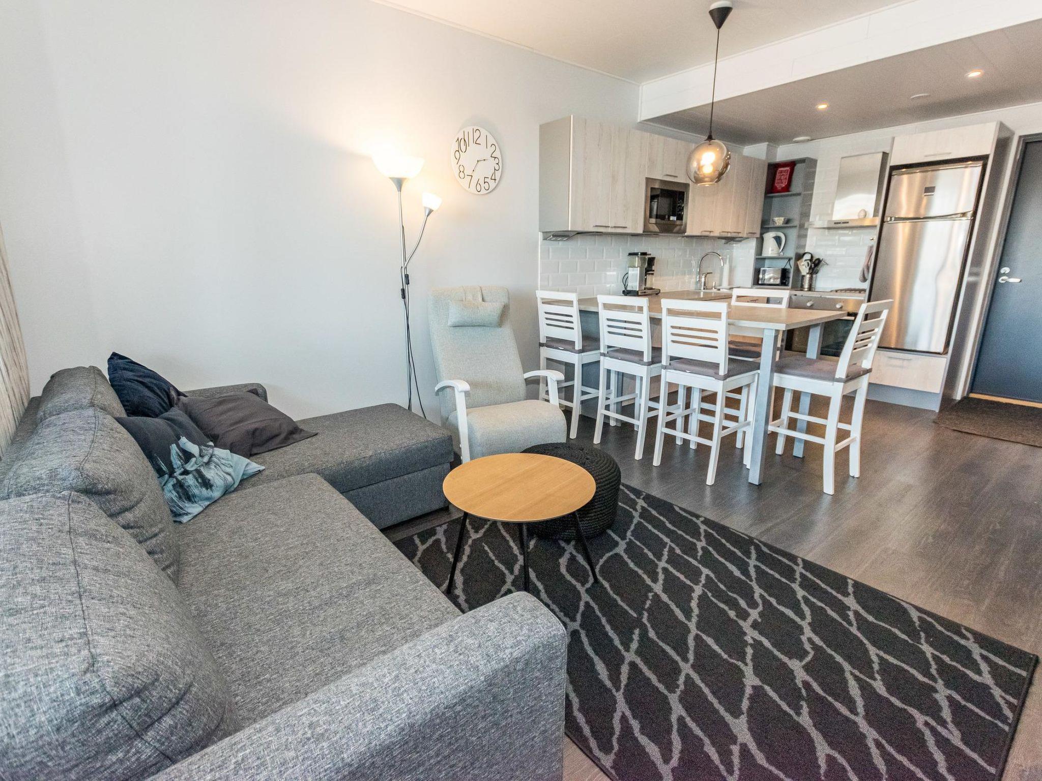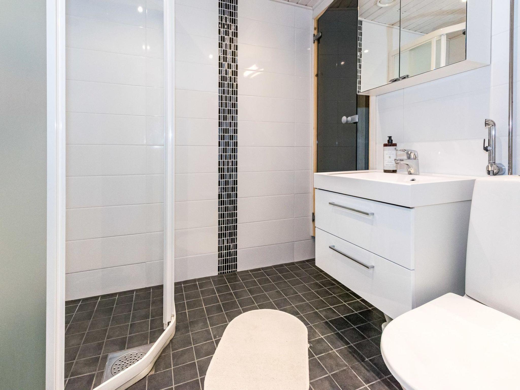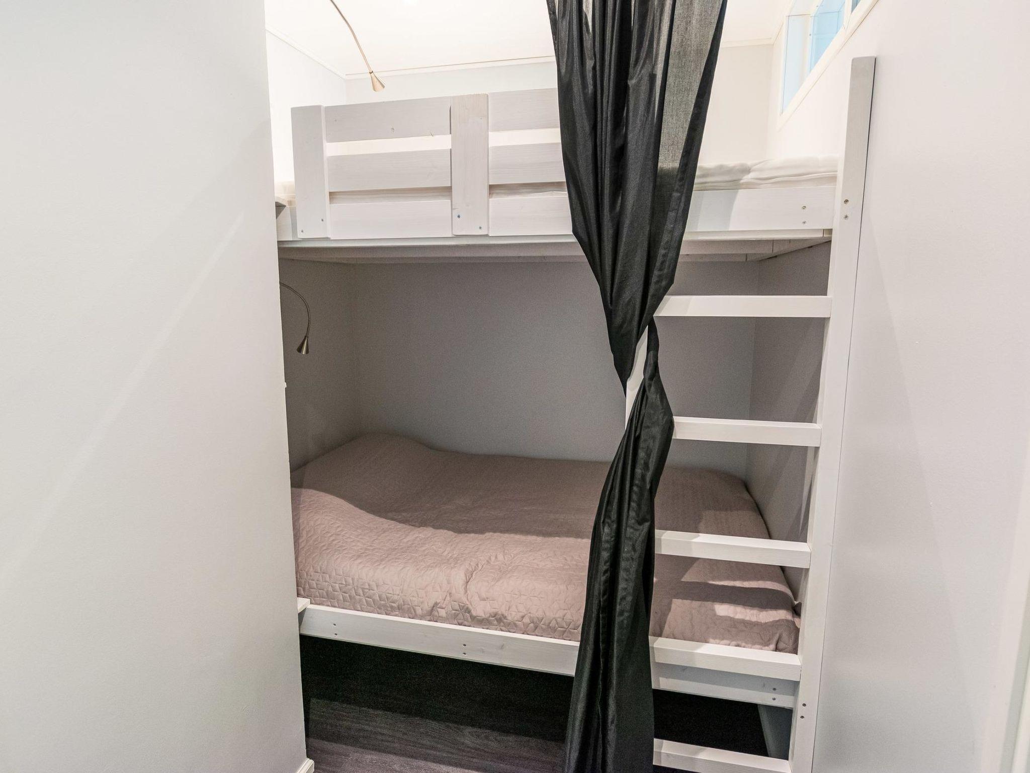You will find a well-equipped living room/kitchen in the living area. The bedroom has a double bed and a bunk bed (width 140 cm) in a lockable space. There is an entrance to the shower room from the lockable space, where you will find a toilet, a shower and an electric sauna.