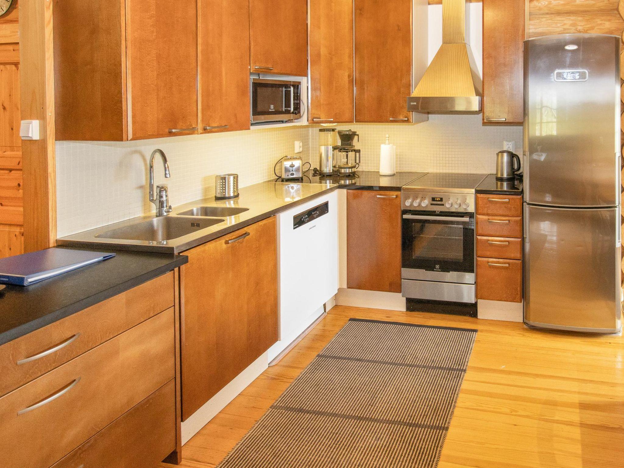 The property includes a separate, atmospheric lakeside log sauna where you can enjoy the authentic warmth of a wood-burning sauna stove. Just a few steps from the sauna lead you to your private pier – perfect for a refreshing morning swim. With its peaceful setting and high-quality finish, this cabin is ideal for both leisure and remote work retreats in the heart of nature.