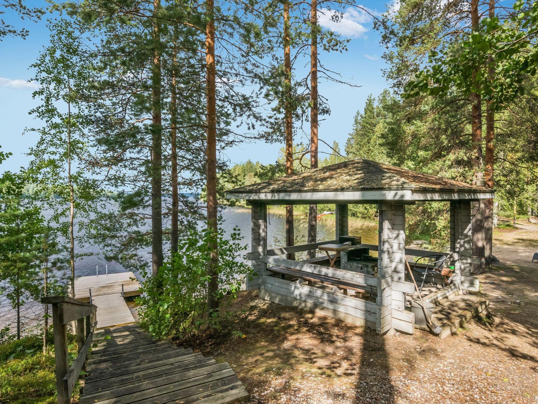 Lakeside sauna with wood-burning sauna stove and dressing room, no electricity, water comes from the well by using a pump. Covered cooking area with masonry grill. Also gas grill at the property.