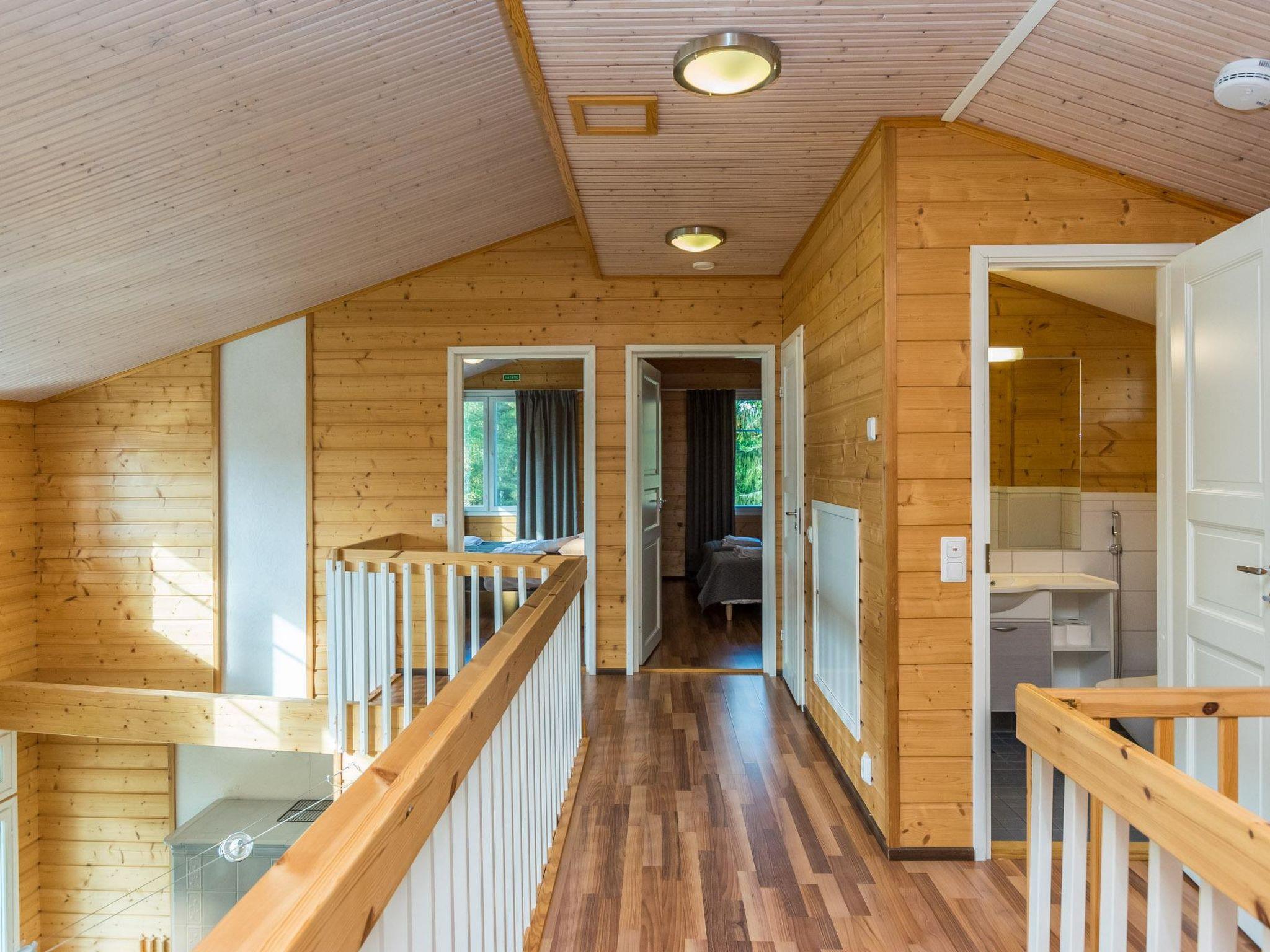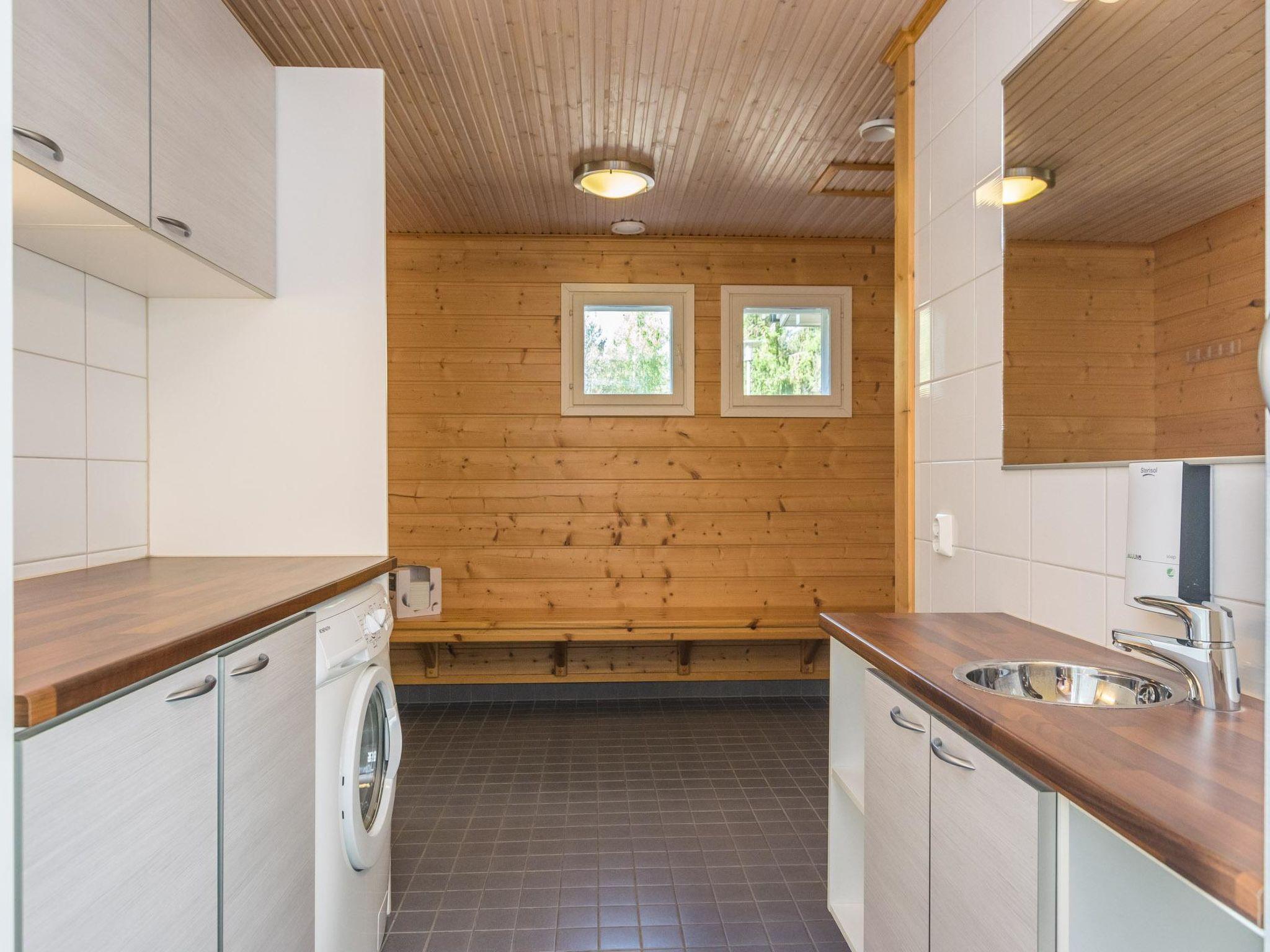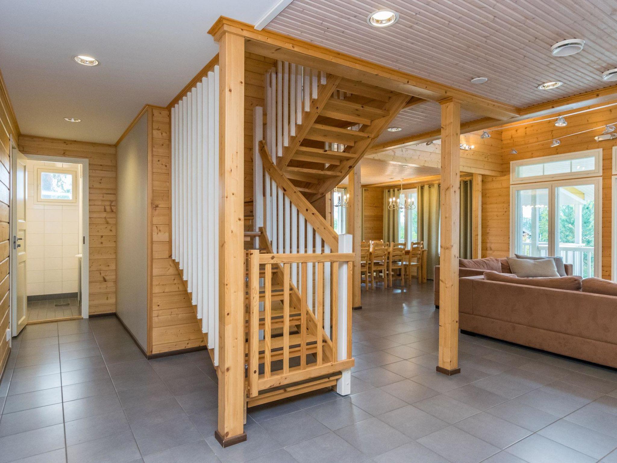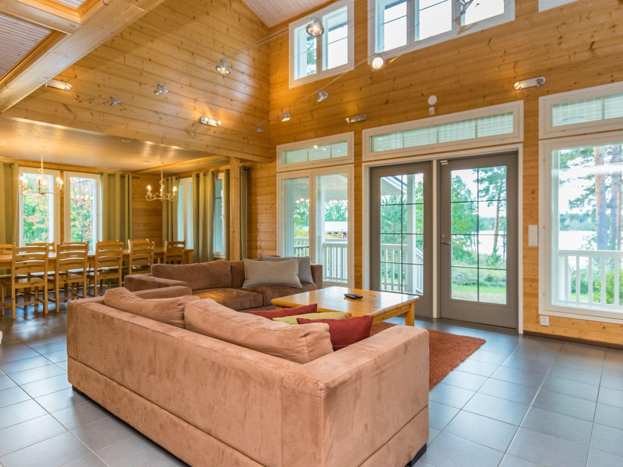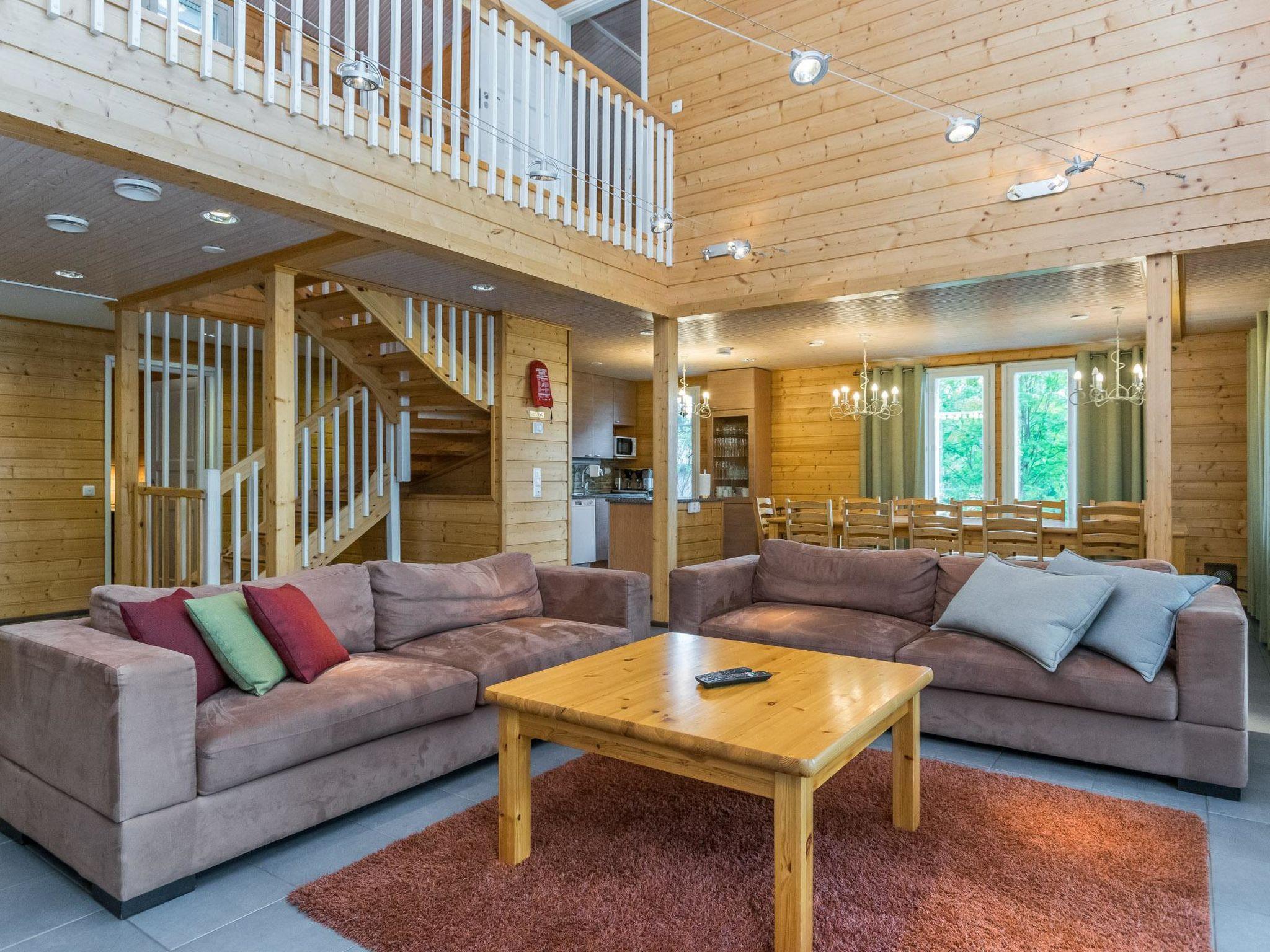 High-quality wood villa, built in 2008, features a spacious living room/kitchen on the ground floor, three bedrooms with two beds in each, a utility room/dressing room, a bathroom with two showers, an electric sauna, a separate shower room, and two separate WCs.