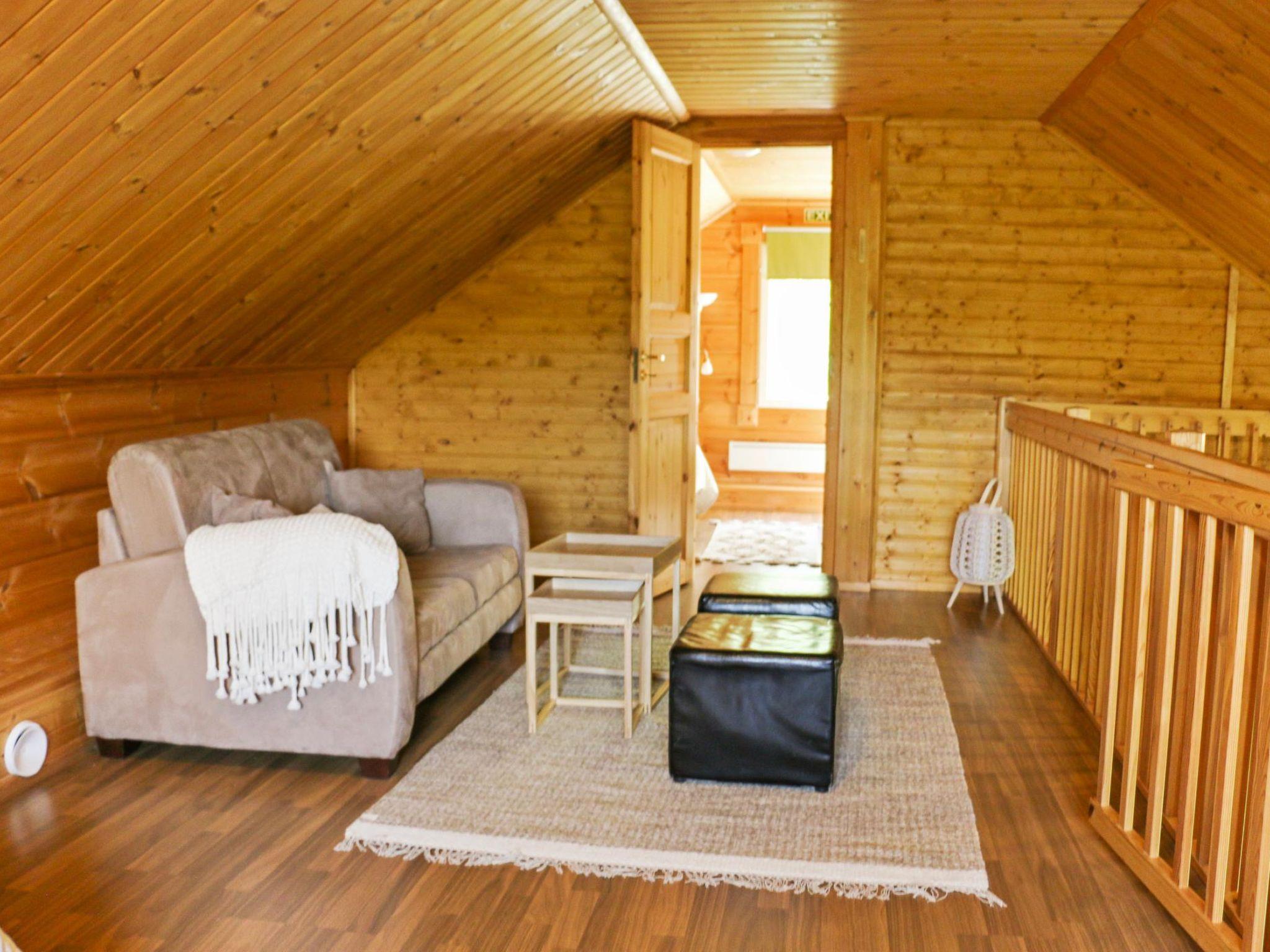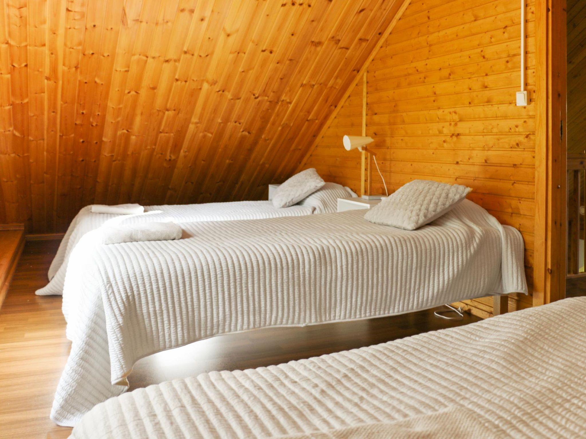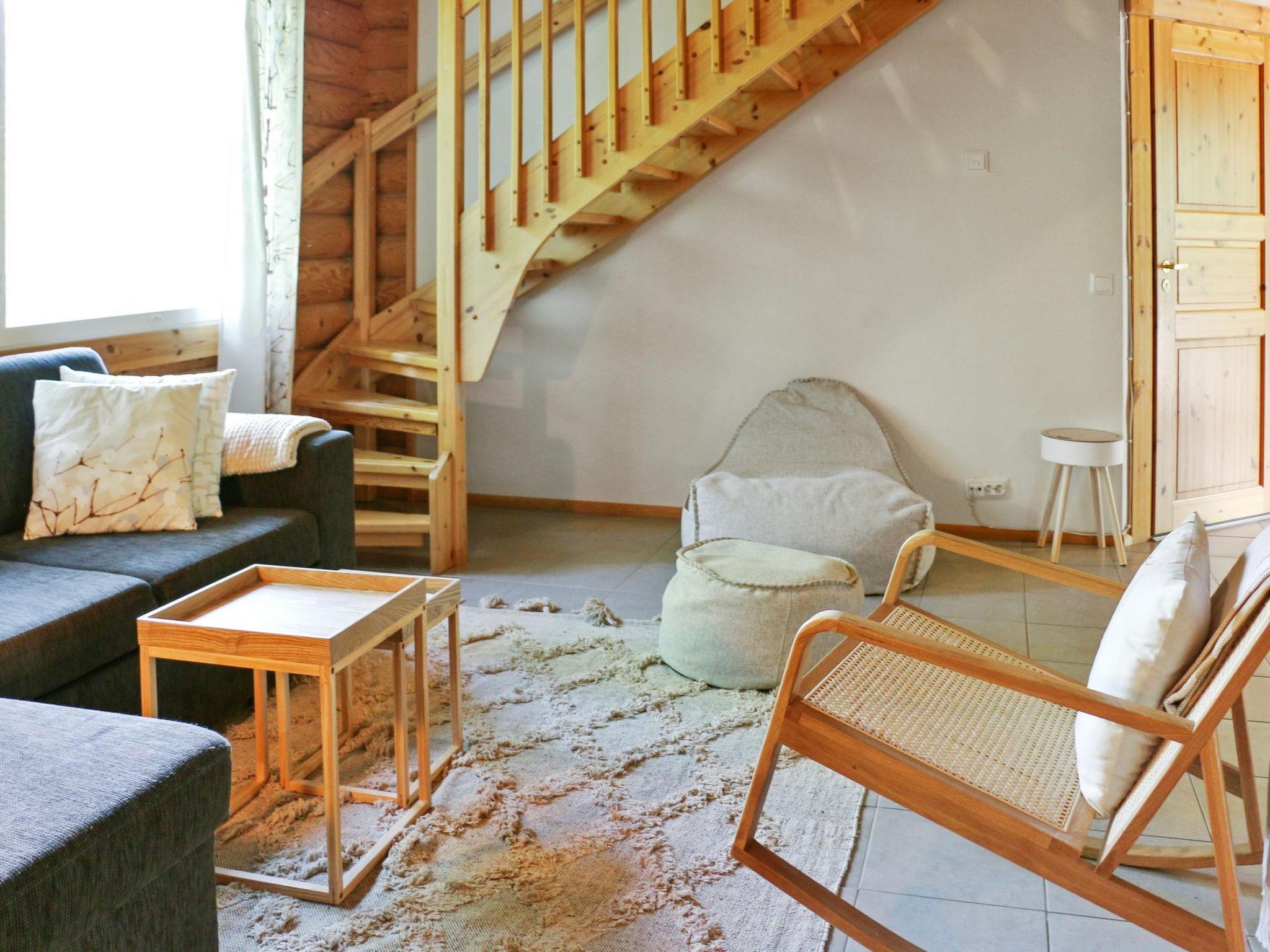 Log villa built in 2011. The ground floor features a living room, kitchen, two bedrooms—one with a double bed and the other with two single beds. Bathroom with WC and shower. Covered porch.