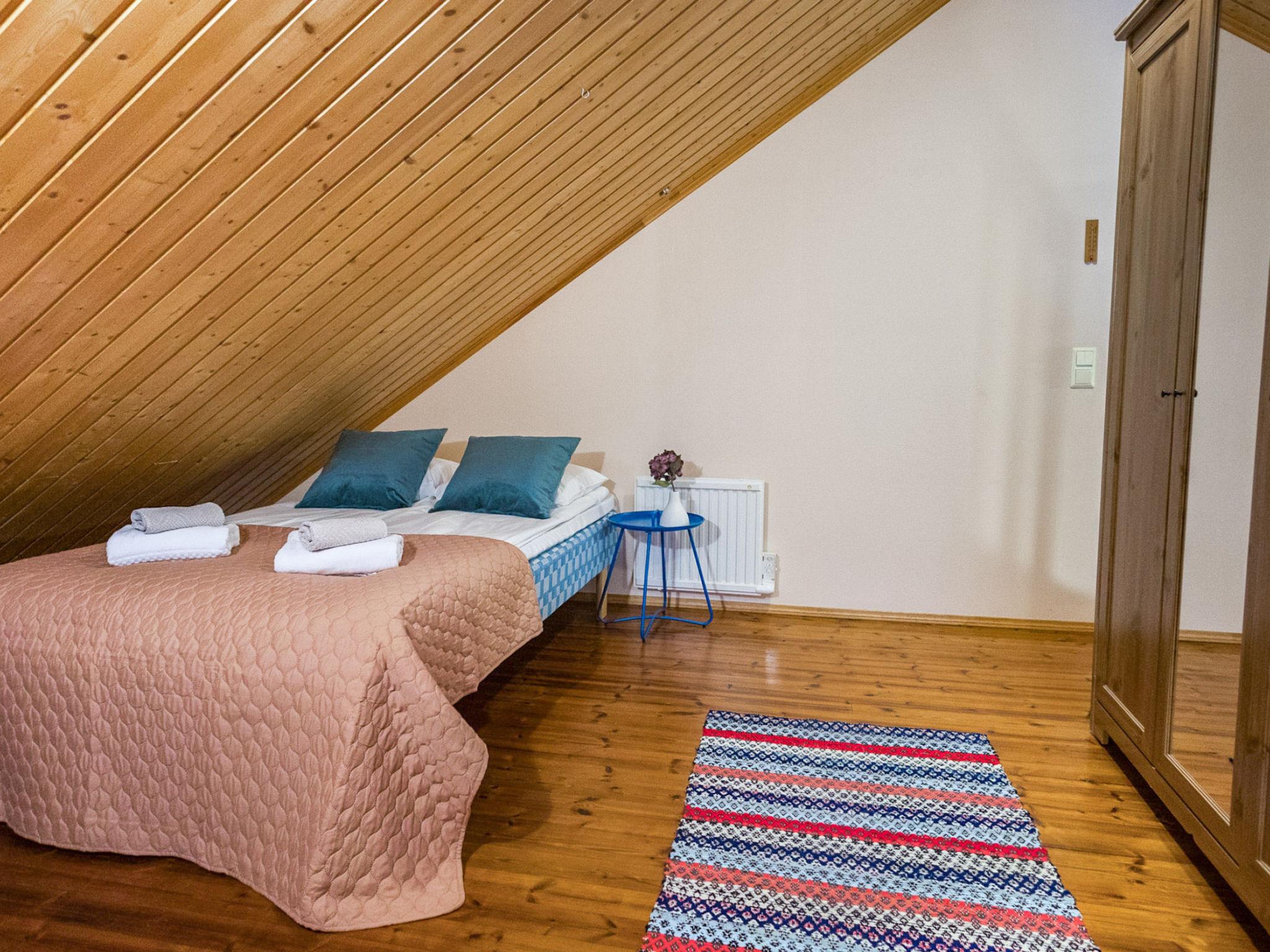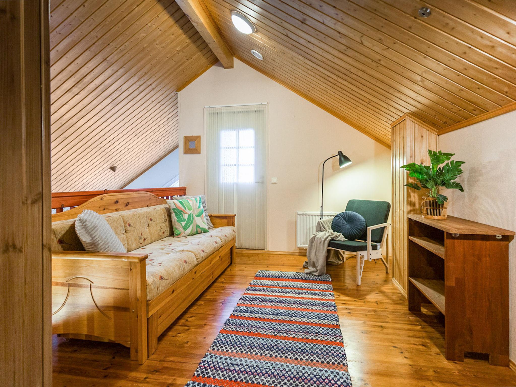 Cottage with living room/kitchen, bedroom (folding door) double bed (width 160 cm).The loft has 2 sleeping alcoves: the sleeping alcove, separated by a curtain, has one 140 cm wide bed. The other sleeping alcove in the loft has a 120 cm wide bed + 80 cm bed and an extendable wooden sofa (approx. 160 cm wide when extended); this alcove does not have a door curtain. The ventilation windows have mosquito nets.