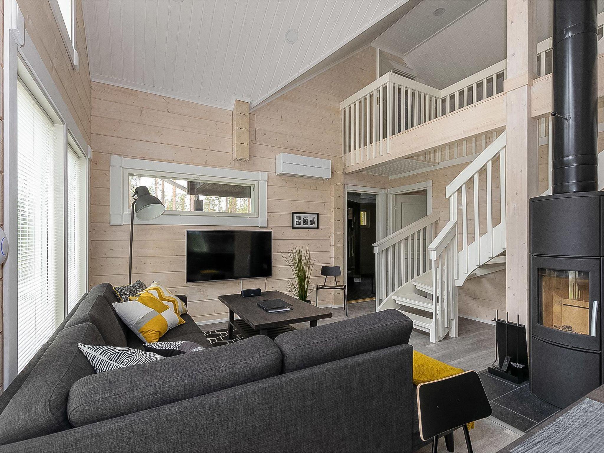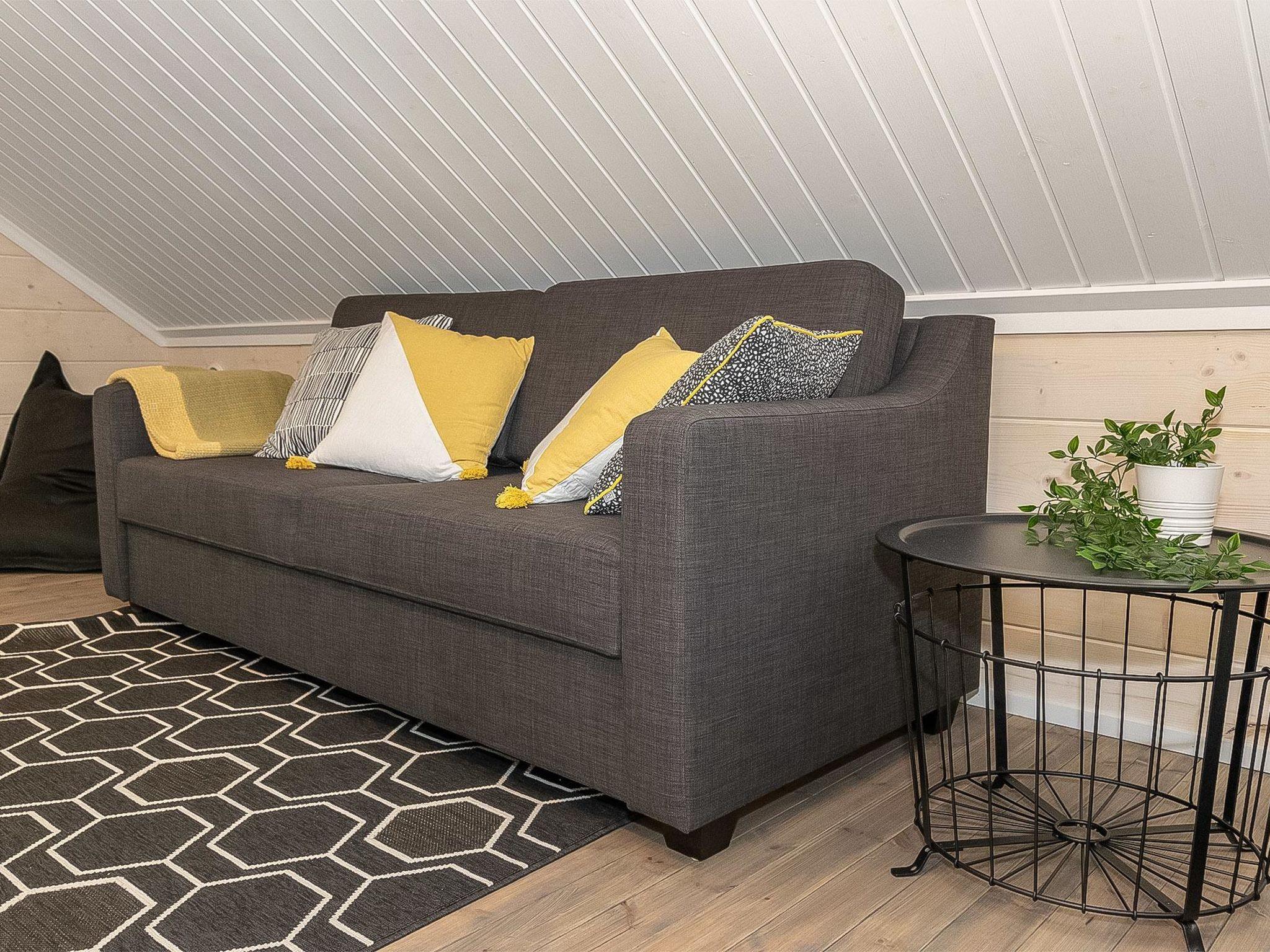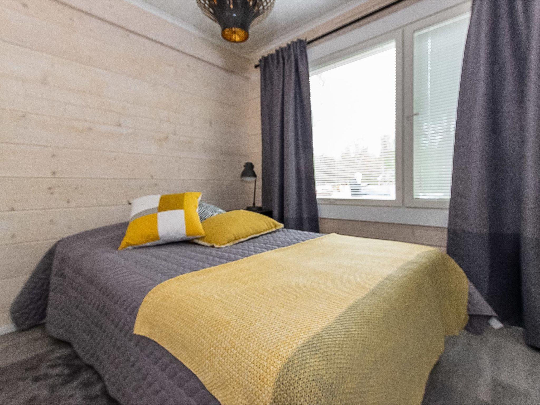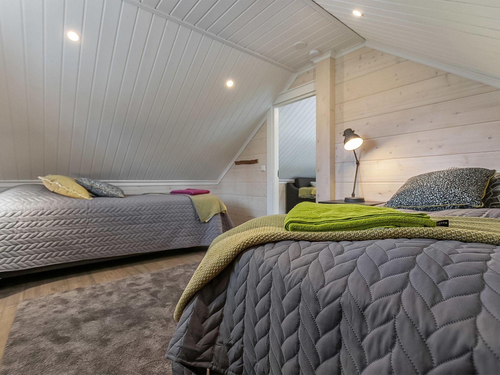 Log cabin 2019, bedroom 1: two 80 x 200 cm beds, bedroom 2: 120 x 200 cm bed, bedroom 3: two 80 x 200 cm beds, bedroom 4: two 80 x 200 cm beds, sofa bed (140 x 190 cm spare bed) in the lobby on the upper floor. Living room with wood-burning stove, dining group which can be extended (for 10 people group), well-equipped kitchen corner, sauna (electric sauna stove), washroom, terrace with gas grill and garden furniture.