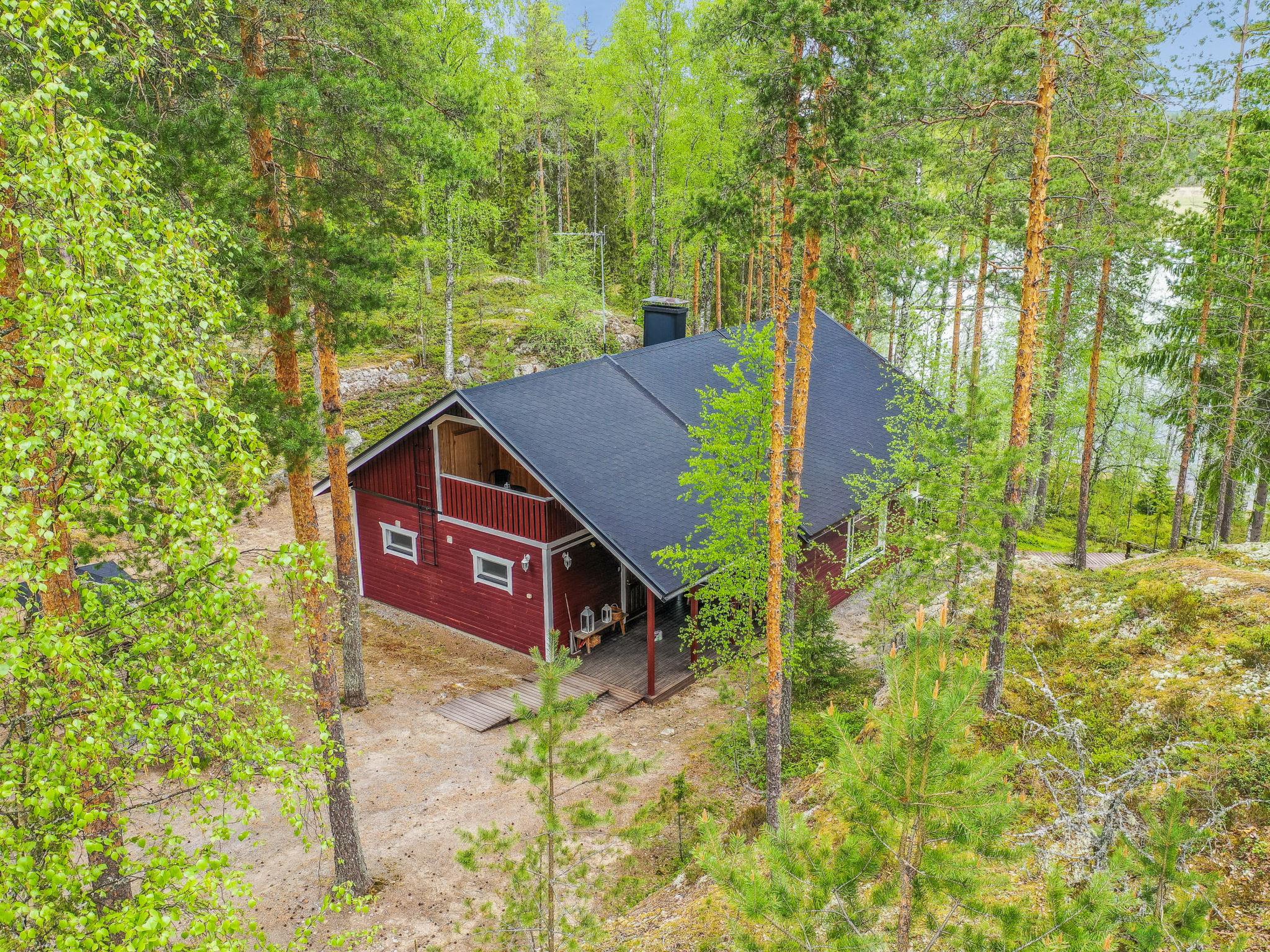 This hand-carved 160 m² log cabin offers an authentic Finnish cabin atmosphere combined with modern amenities. The cabin was built in 1994 and renovated in 2005. The location is unique: the plot offers magnificent views of Lake Saimaa. The distance to Helsinki is 301 km, and Savonlinna is only 49 km away. At the shore, a separate wood-heated lakeside sauna lets you enjoy traditional Finnish steam and take a refreshing dip directly into the clear lake water. On the cliff above the shore, a cozy grill shelter provides the perfect spot to enjoy summer evenings and the setting sun.